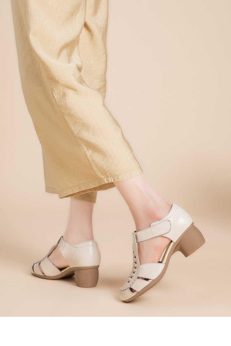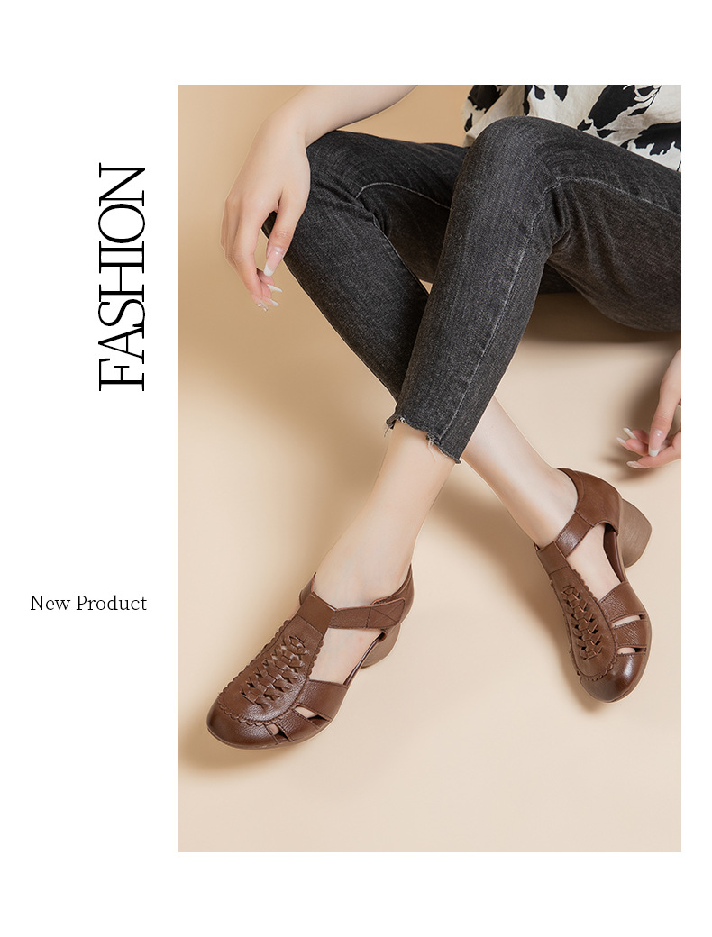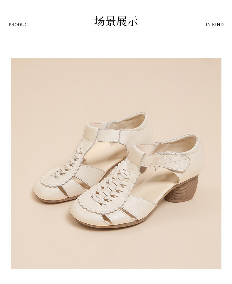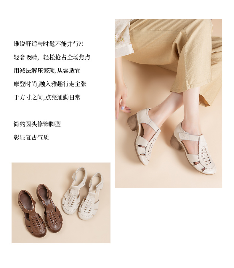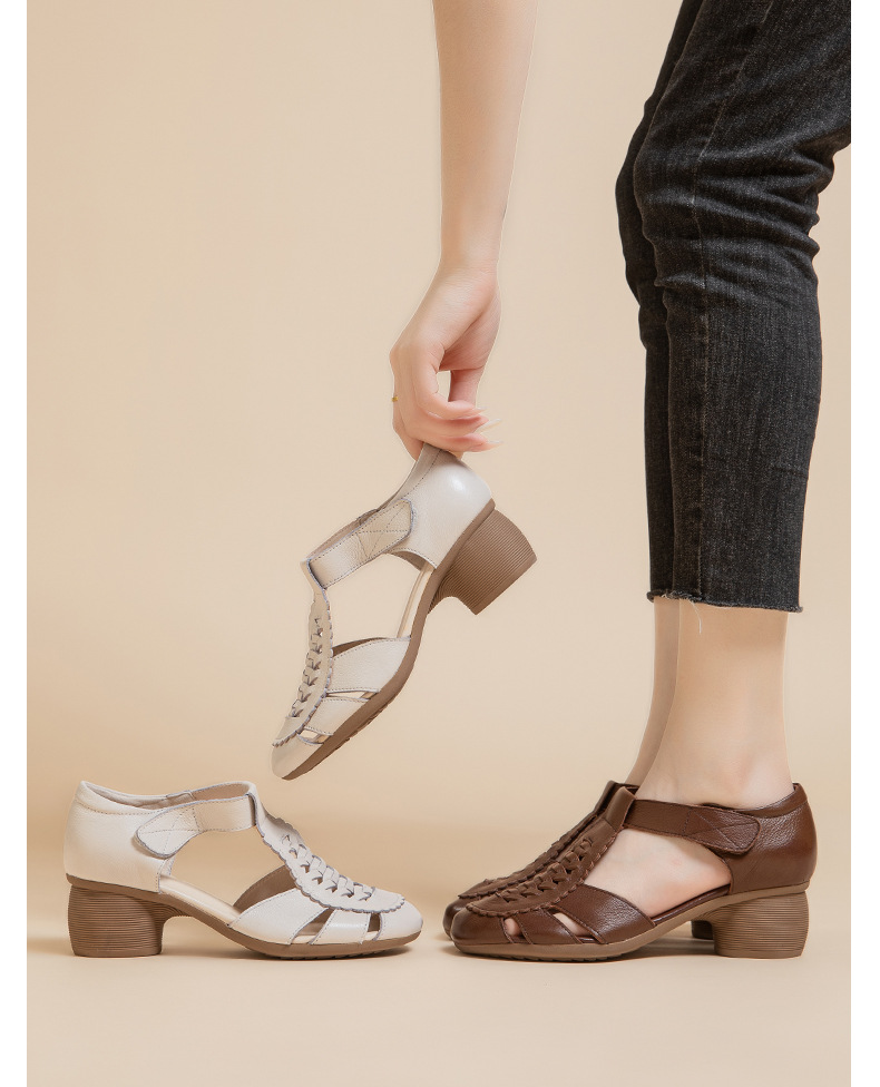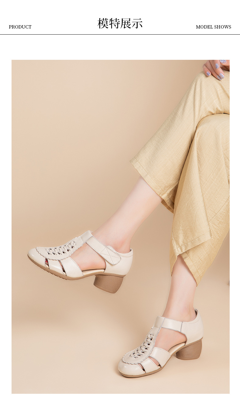 정품 가죽 여름 여성 신발 편안한 Cowhide Hollow Sandals 여성용 복고풍 스타일 어머니 신발 부드러운 바닥 두꺼운 하이힐 여성용 샌들