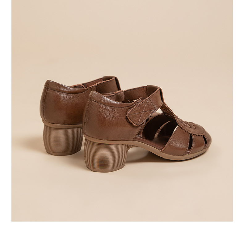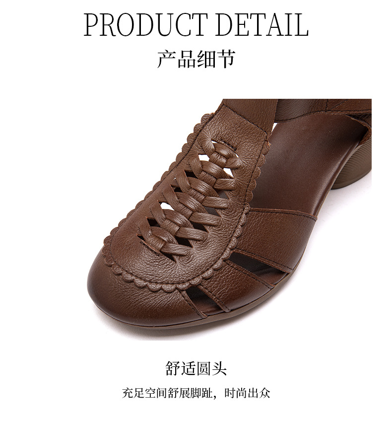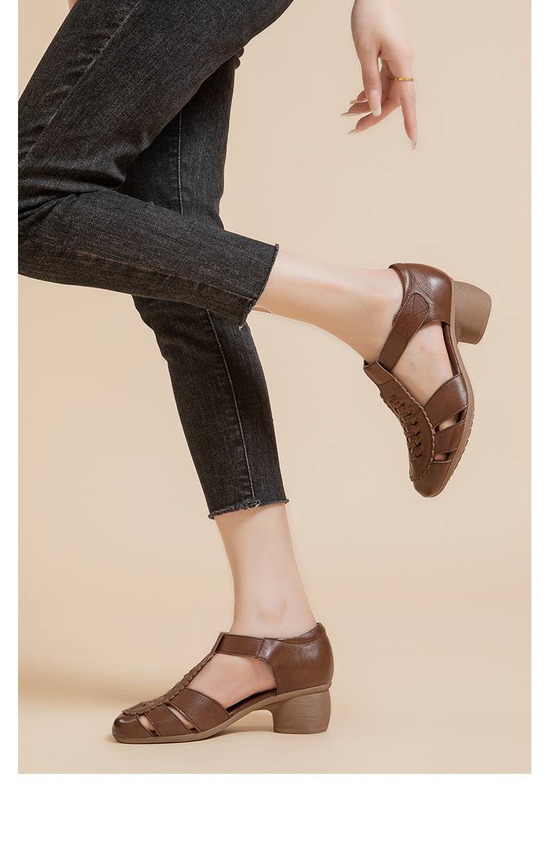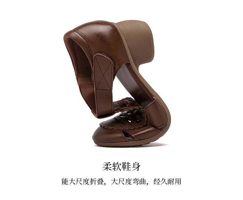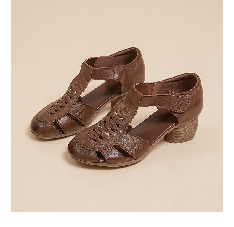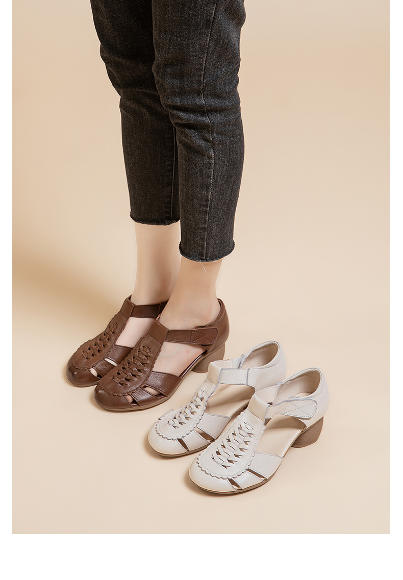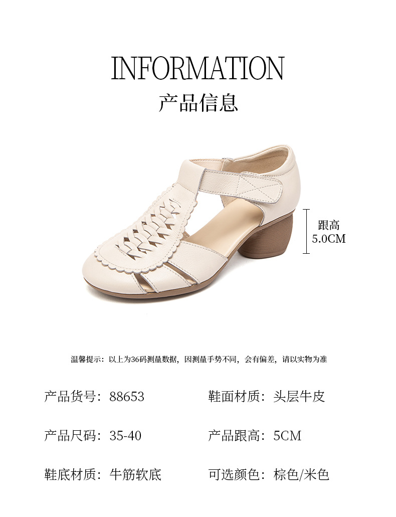정품 가죽 여름 여성 신발 편안한 Cowhide Hollow Sandals 여성용 복고풍 스타일 어머니 신발 부드러운 바닥 두꺼운 하이힐 여성용 샌들