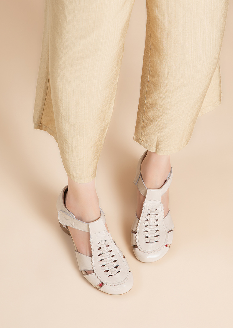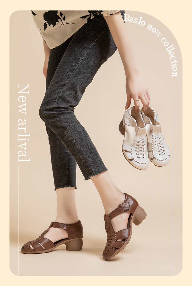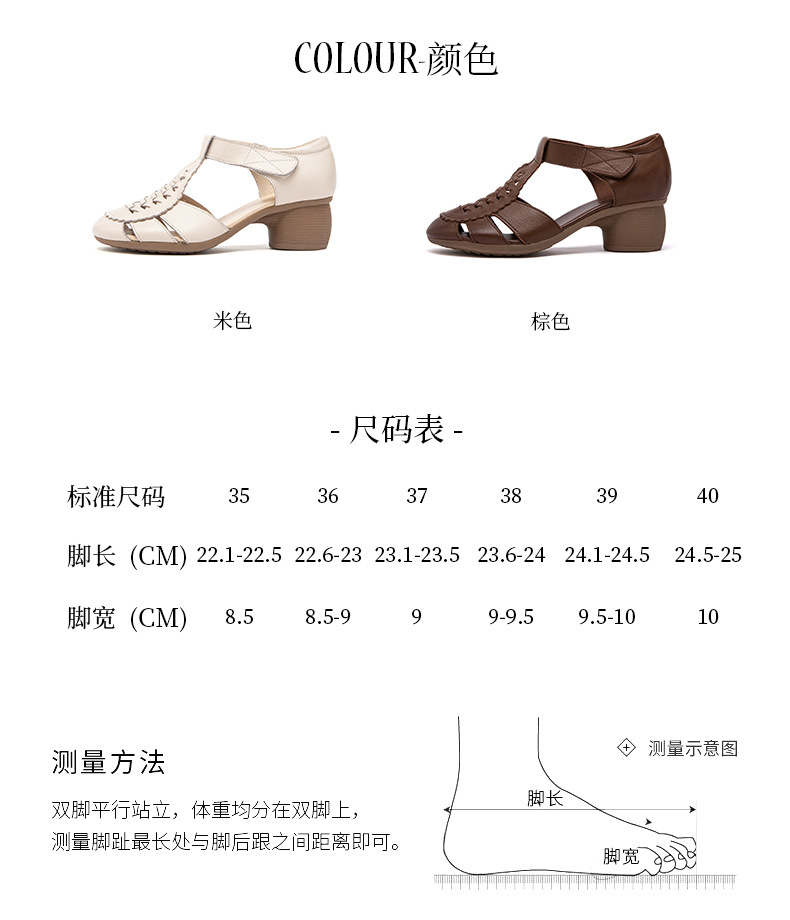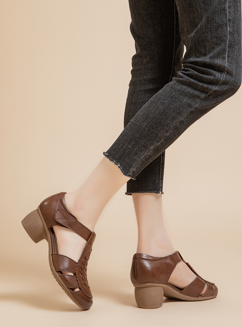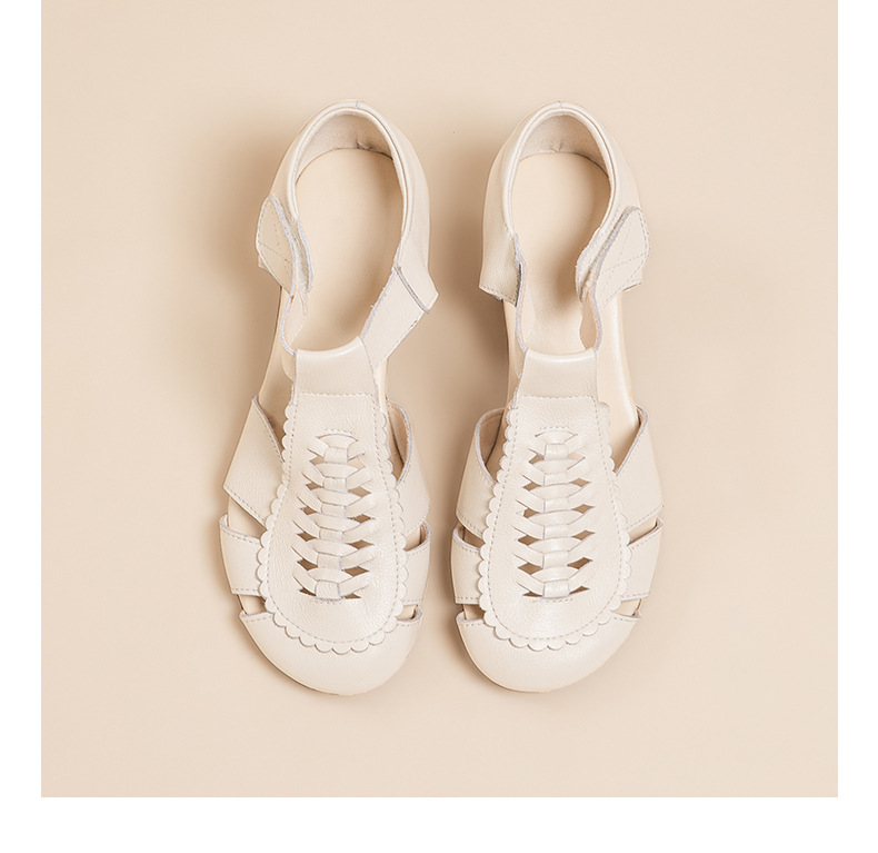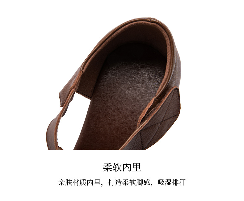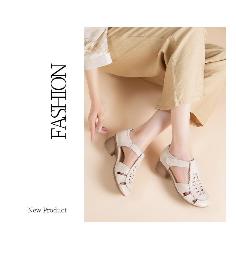 정품 가죽 여름 여성 신발 편안한 Cowhide Hollow Sandals 여성용 복고풍 스타일 어머니 신발 부드러운 바닥 두꺼운 하이힐 여성용 샌들