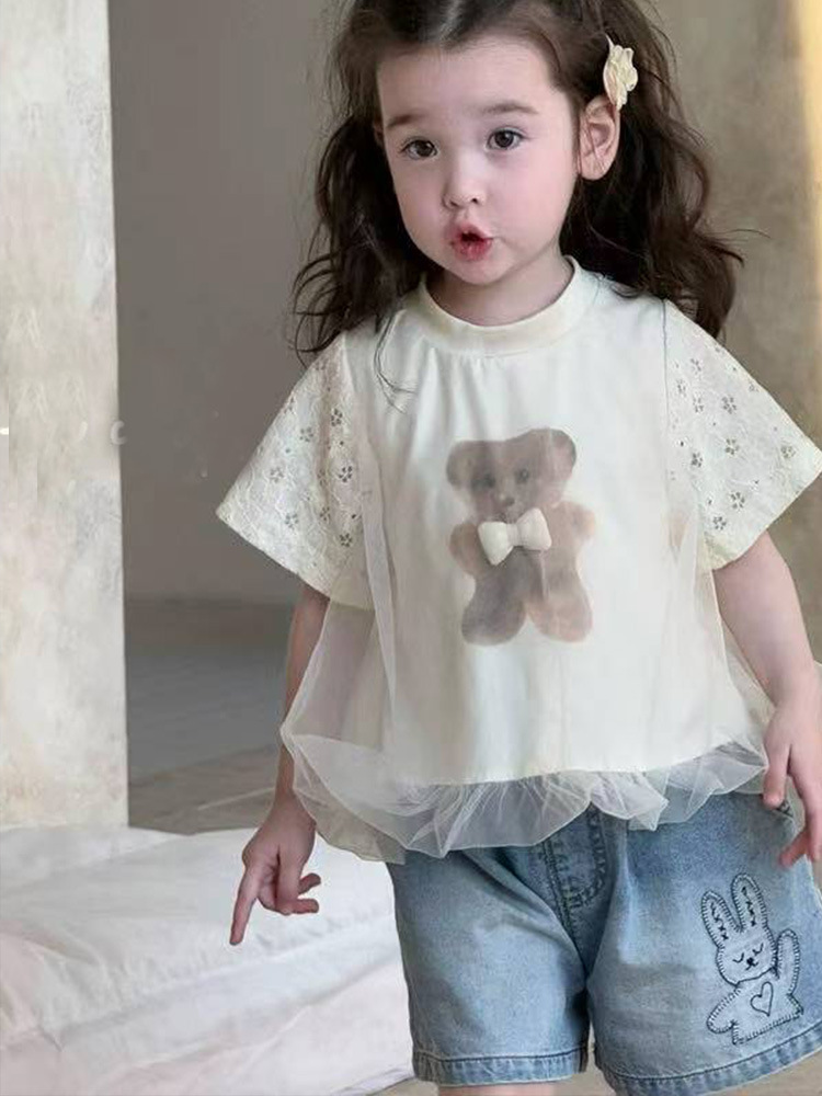 여자 반소매 티셔츠 2025 여름 새 어린이 귀여운 곰 인쇄 탑 아기 소녀 반팔베이스 셔츠스토어 가기