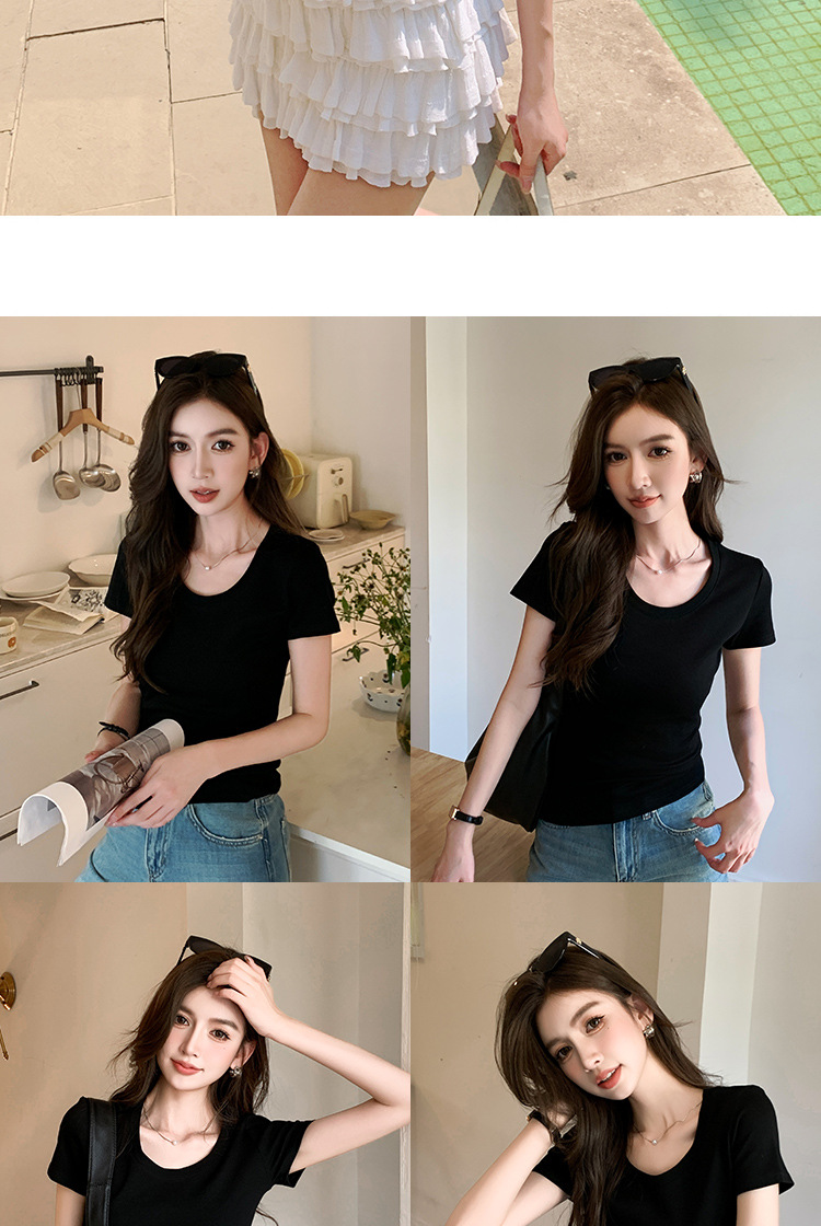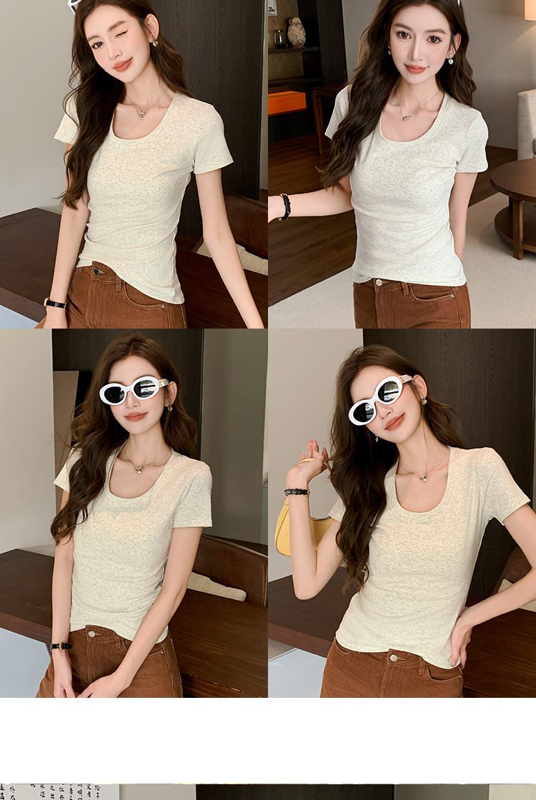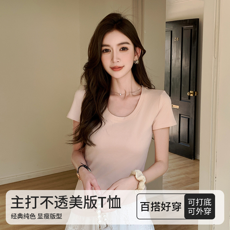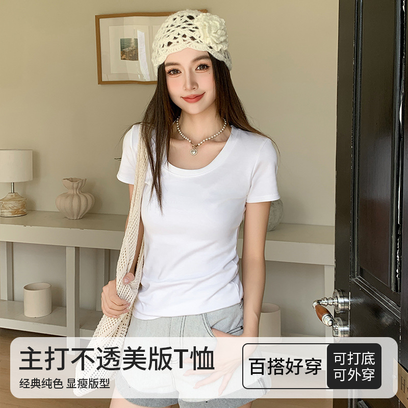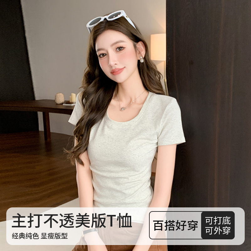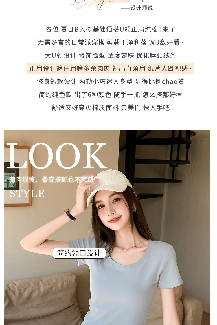 H673 엄선 순면 U-목 반팔 여성용 여름 얇은 슬림-적합 슬리밍 조커 탑 티셔츠 숄더베이스 셔츠스토어 가기