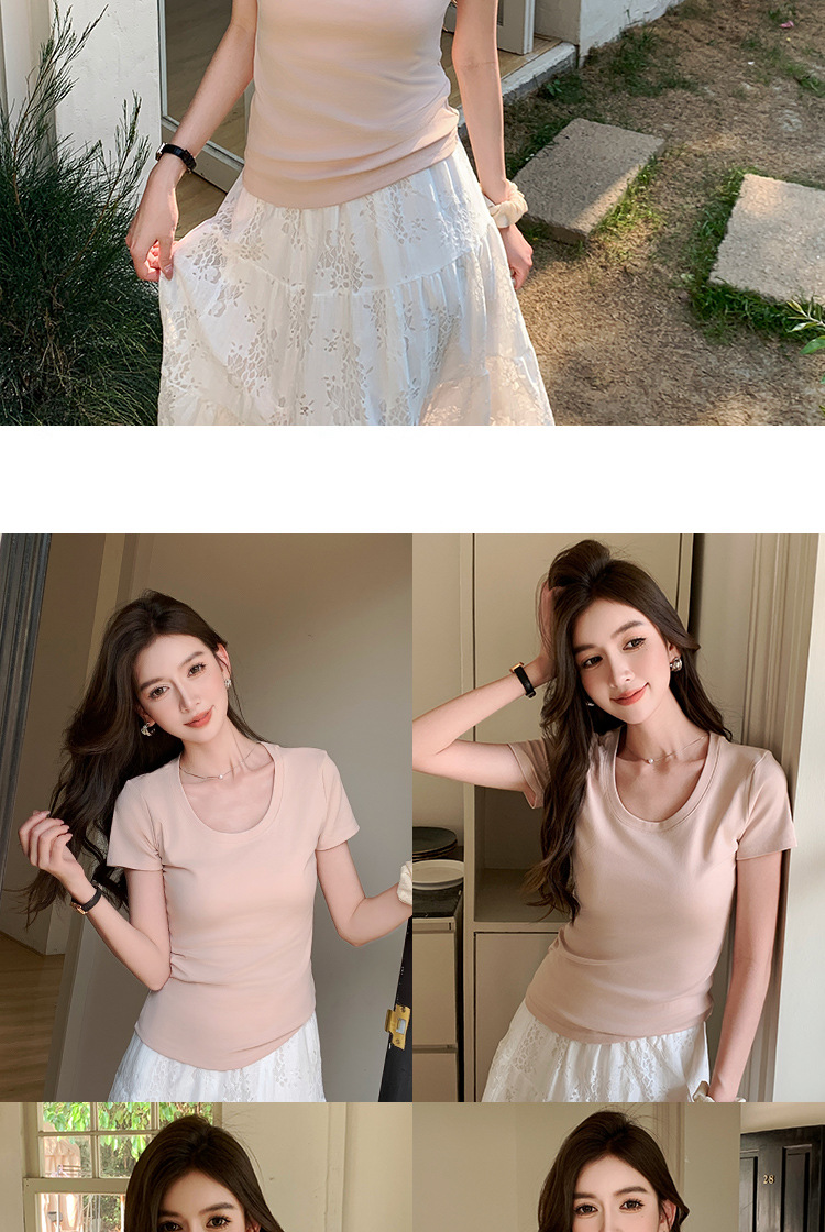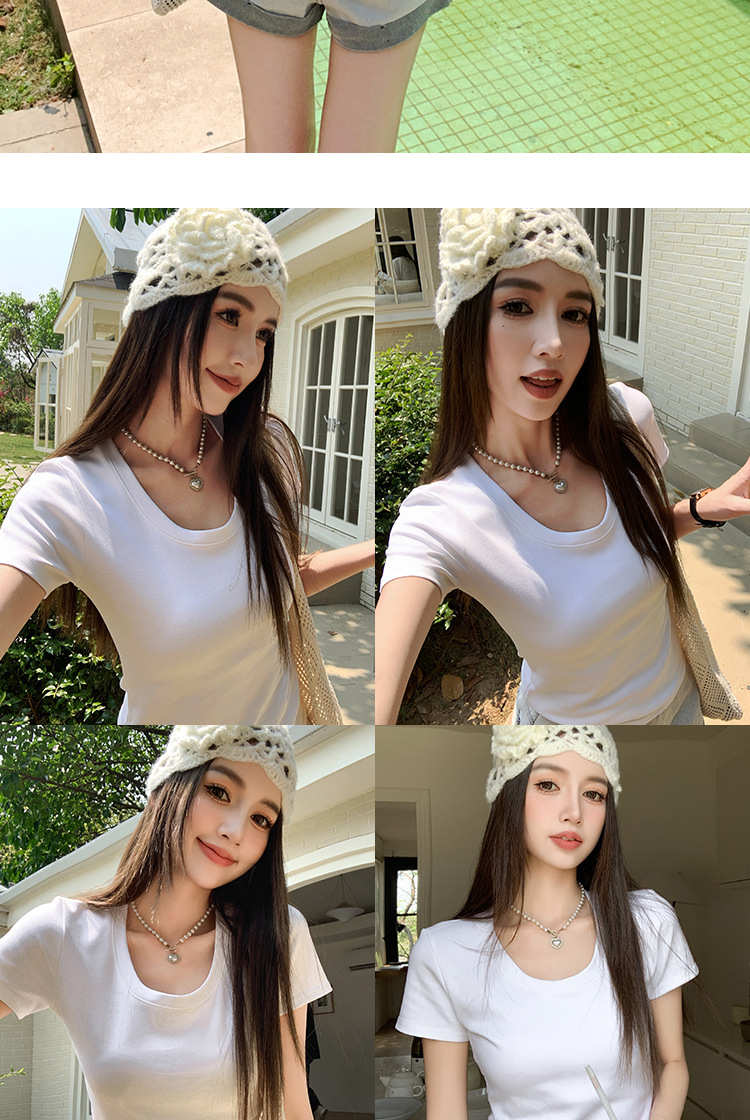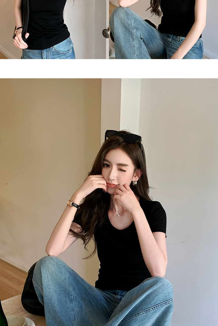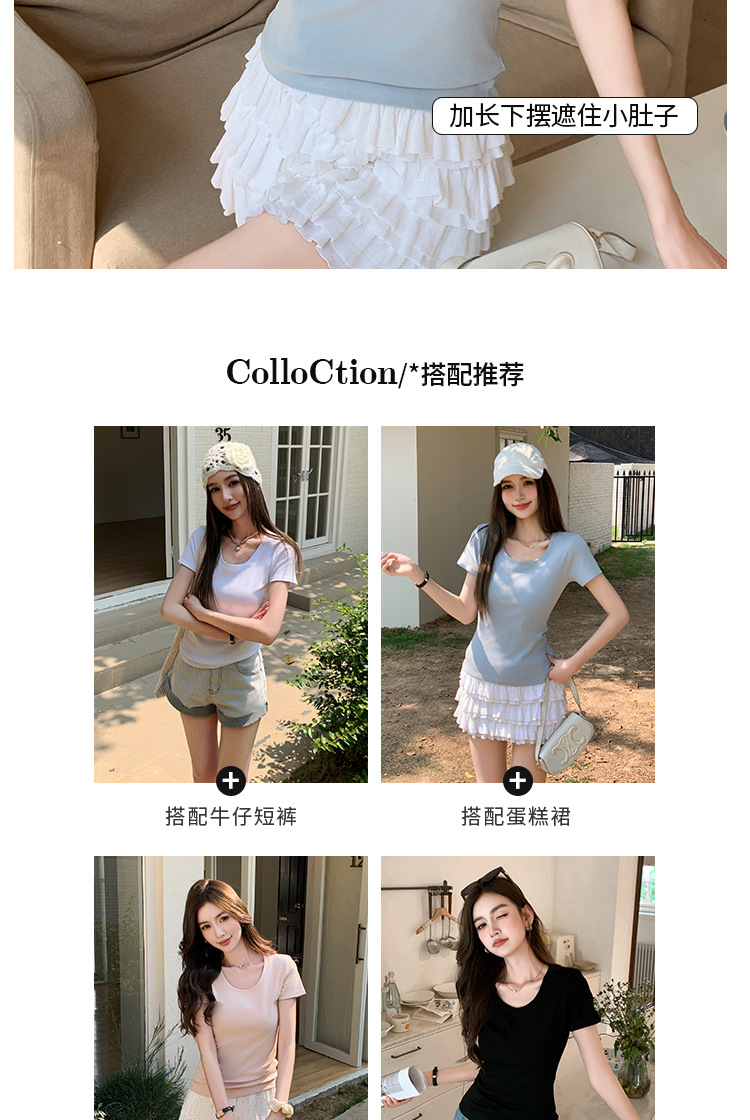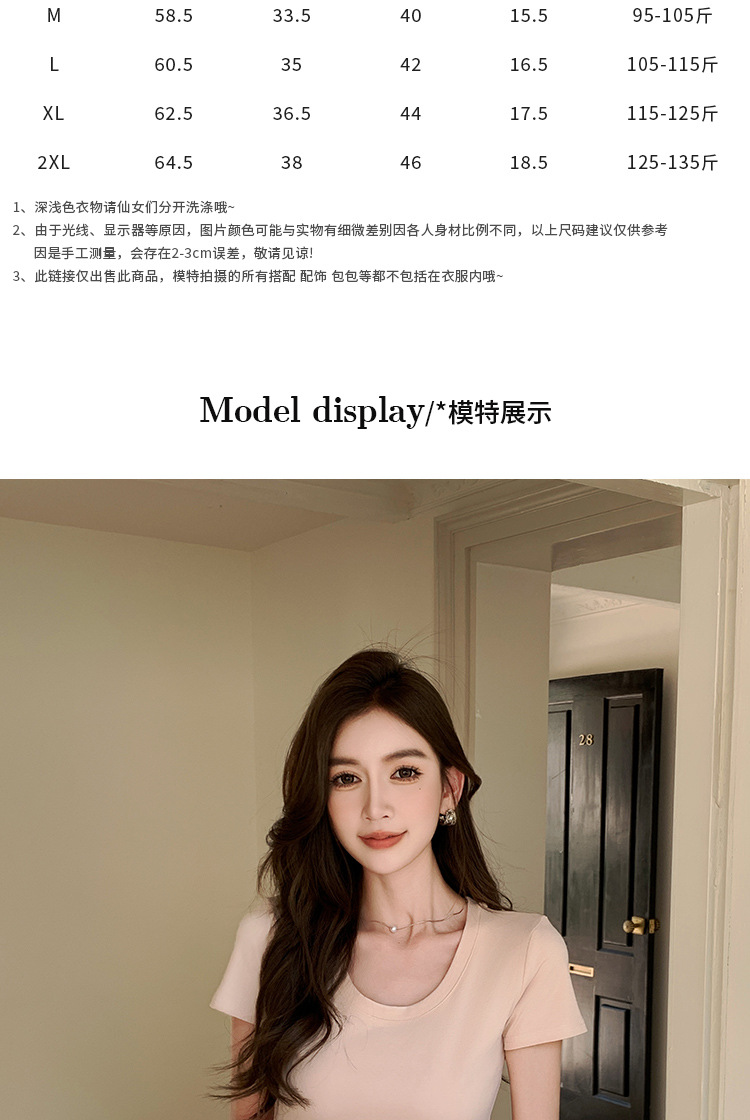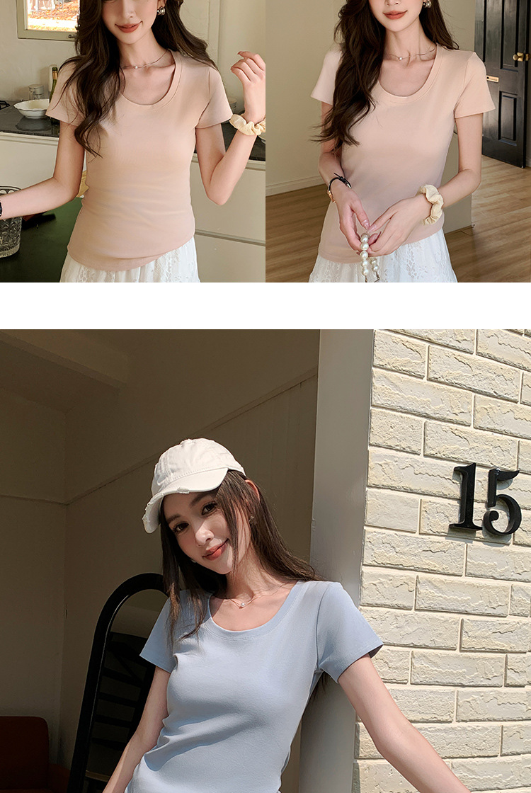 H673 엄선 순면 U-목 반팔 여성용 여름 얇은 슬림-적합 슬리밍 조커 탑 티셔츠 숄더베이스 셔츠스토어 가기