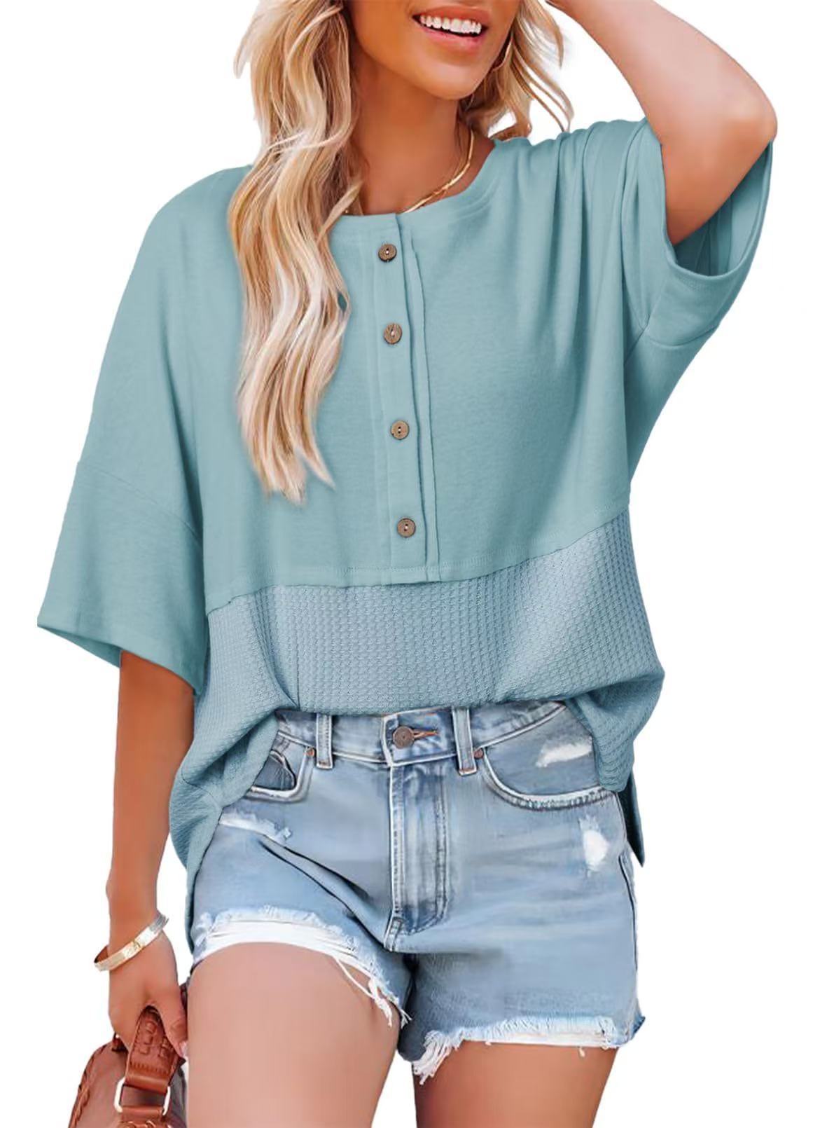 2025 크로스 보더 여성 와플 니트 탑 패션 3/4 소매 캐주얼 버튼 라운드 넥 대형 패치 워크 셔츠스토어 가기