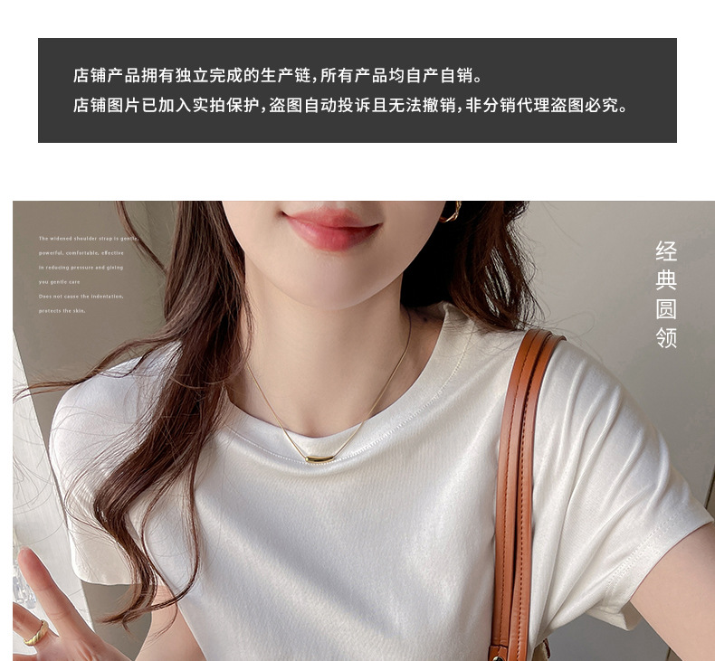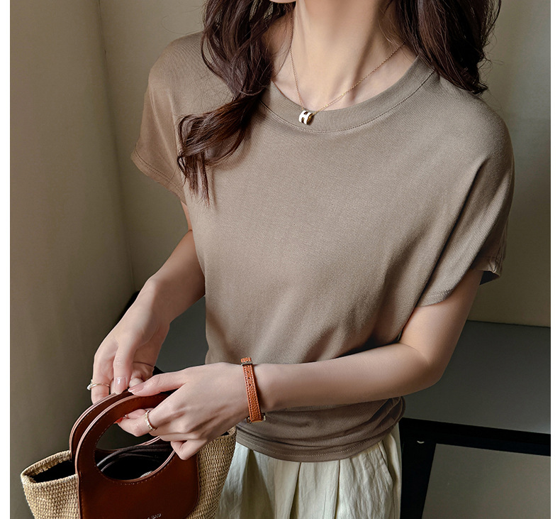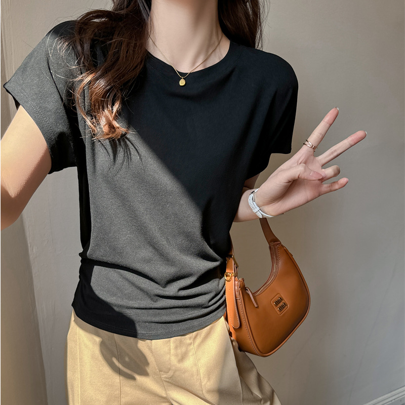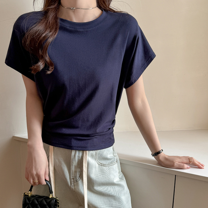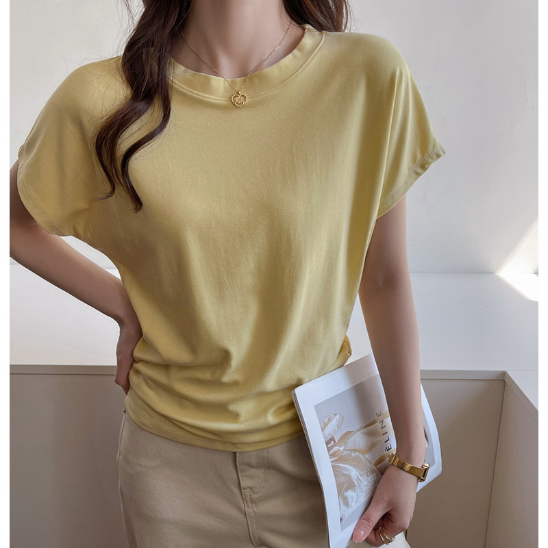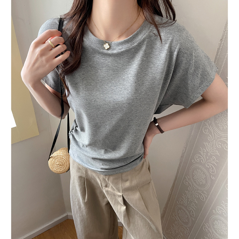 라운드넥 솔리드 컬러 캐주얼 다재다능한 루즈한 레이지 스타일 오른쪽 어깨 반팔 티셔츠 여성용 디자인 이너 레이어링 탑