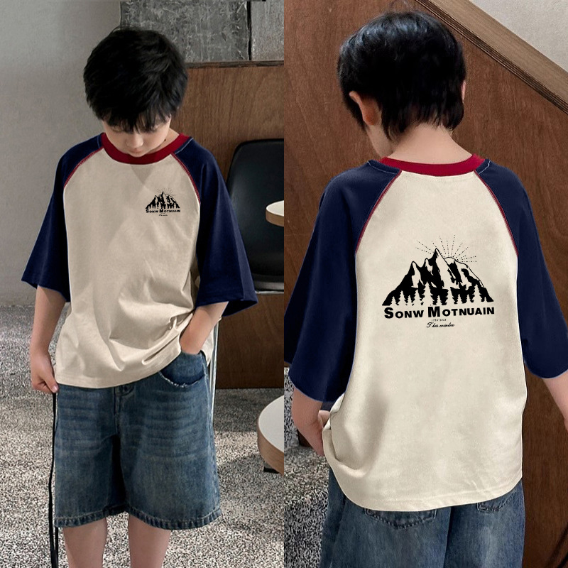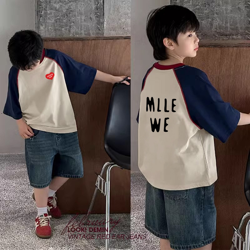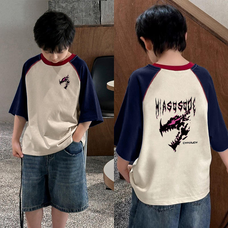 남아용 트렌디한 대비색 반팔 티셔츠, 순면 바텀 셔츠, 신상 여름옷, 중대형 아동복, 멋진 래글런 탑스토어 가기