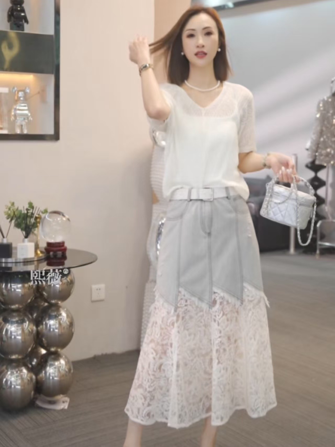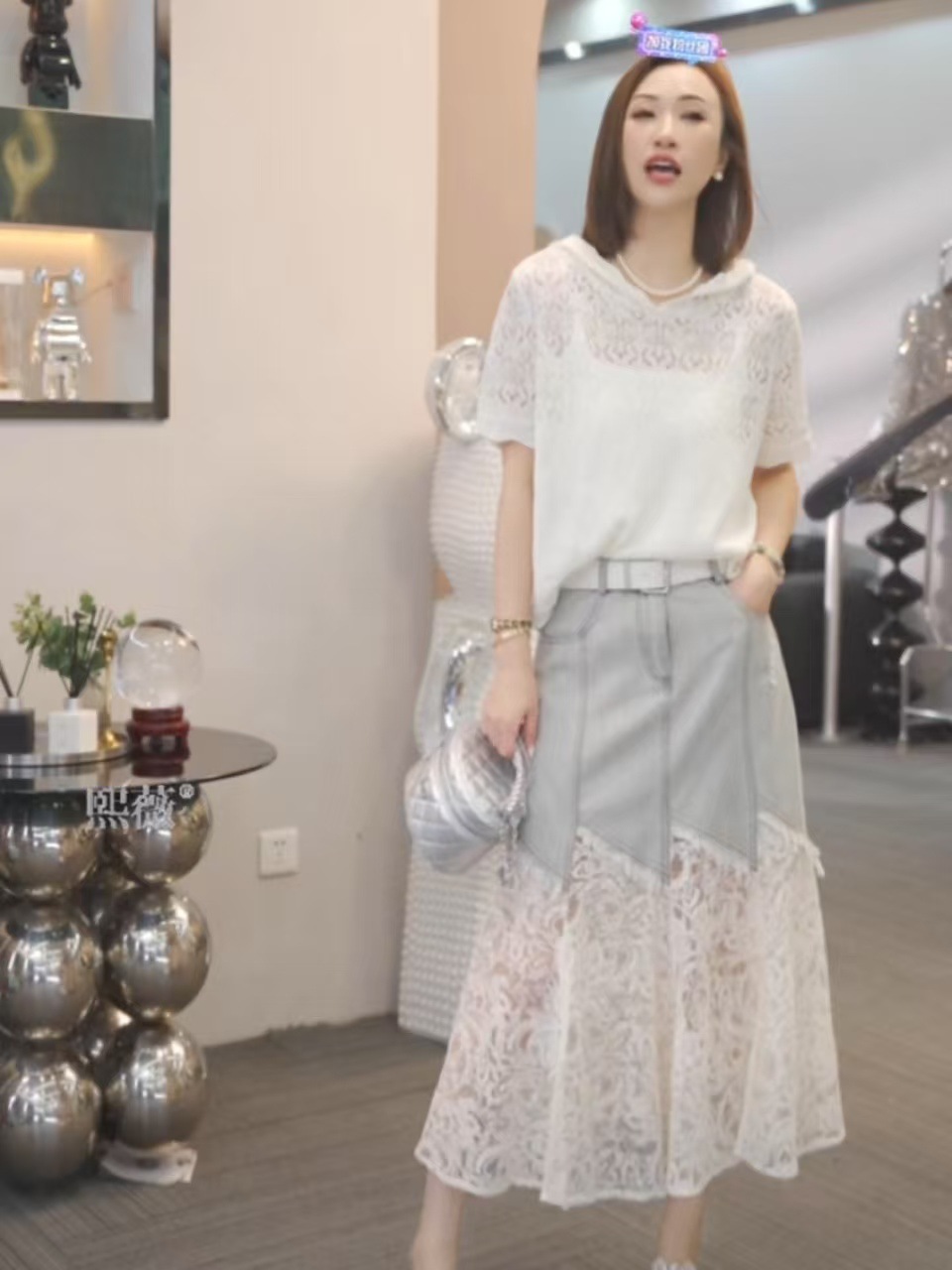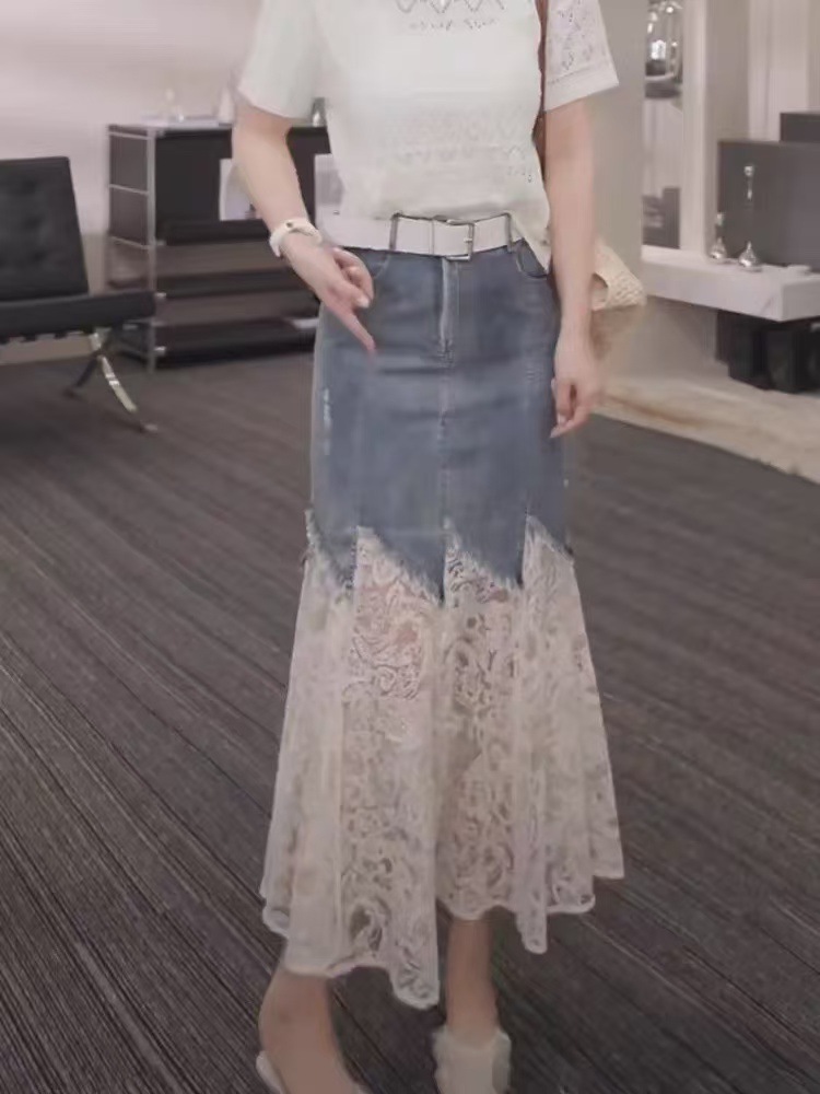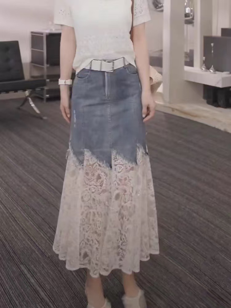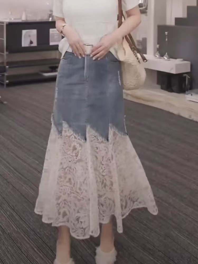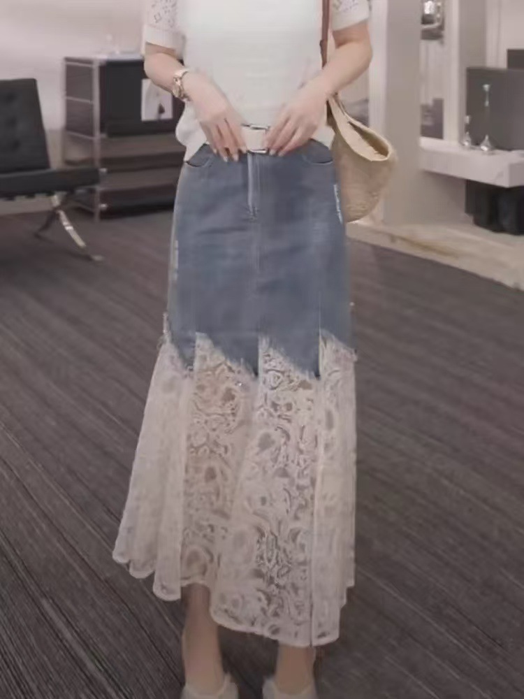 레이스 스티칭 데님 스커트 여자 2025 여름 높은 허리 불규칙한 가짜 투피스 중간 길이 스커트스토어 가기