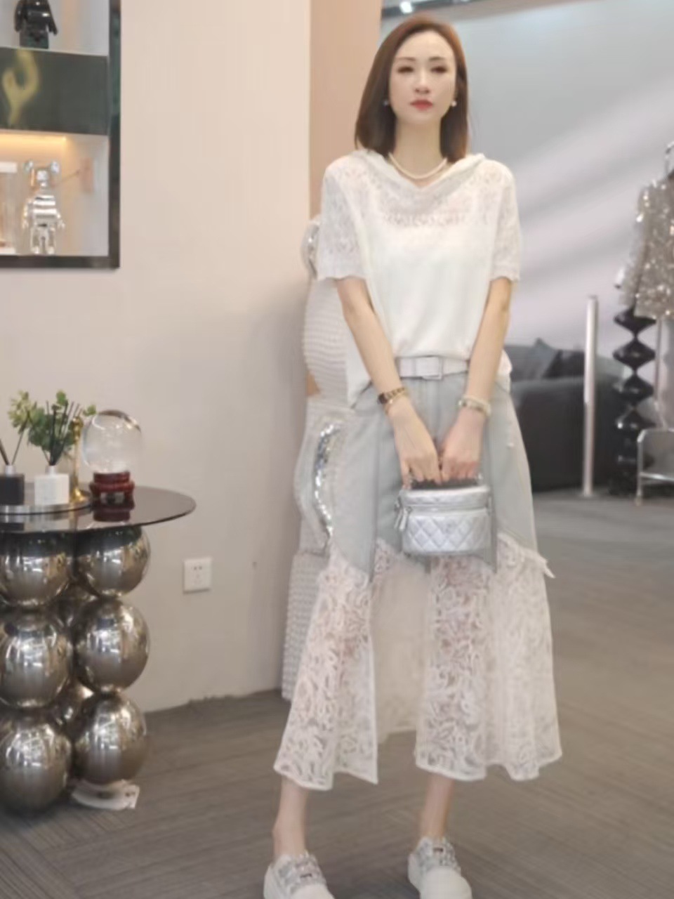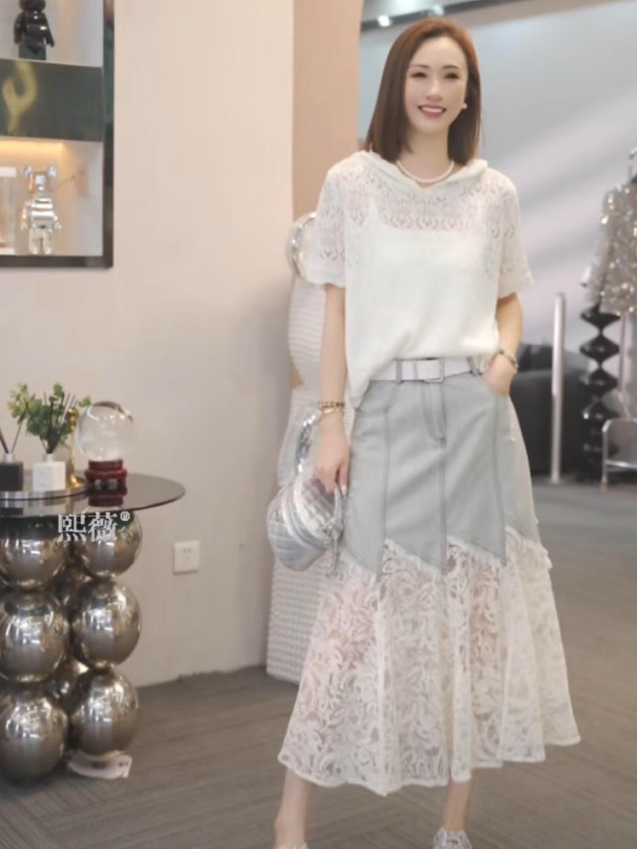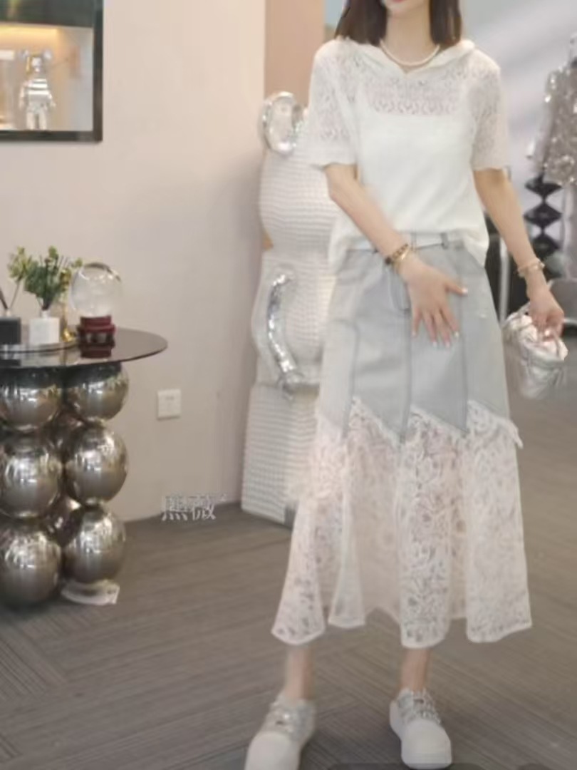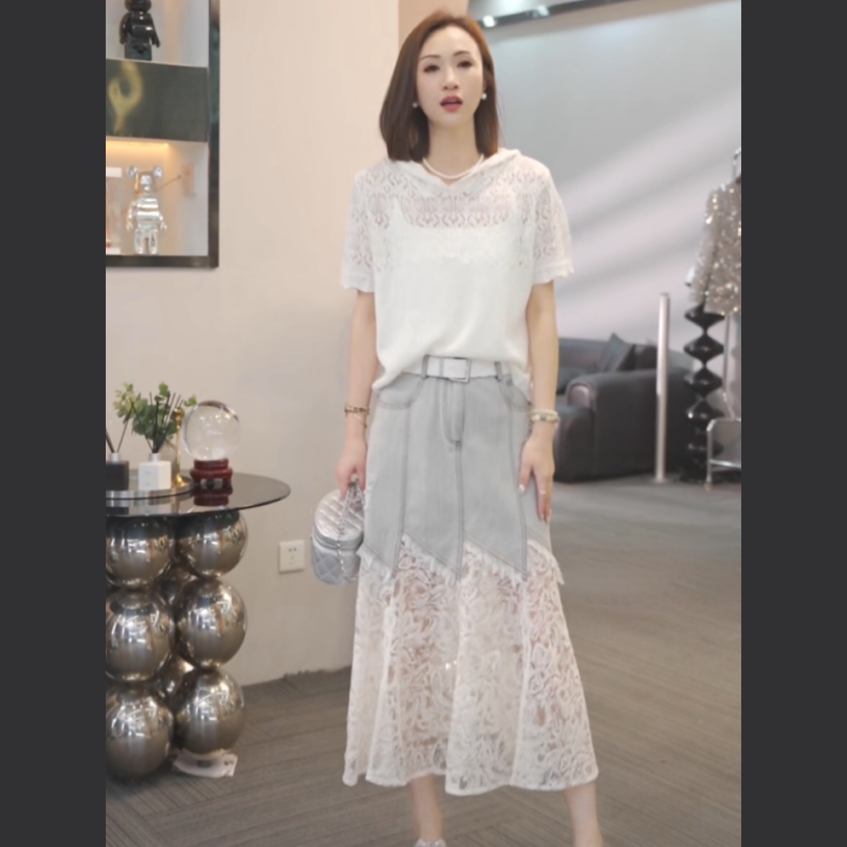 레이스 스티칭 데님 스커트 여자 2025 여름 높은 허리 불규칙한 가짜 투피스 중간 길이 스커트스토어 가기