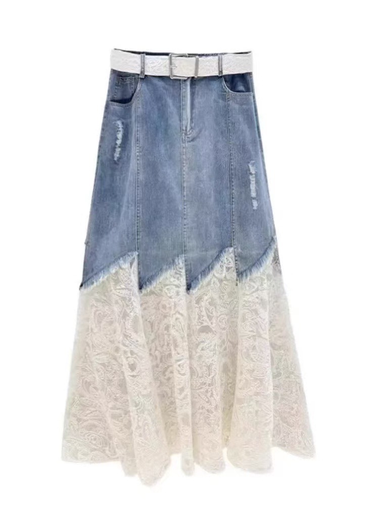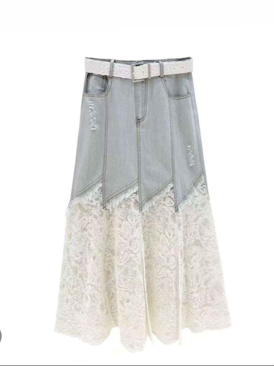 레이스 스티칭 데님 스커트 여자 2025 여름 높은 허리 불규칙한 가짜 투피스 중간 길이 스커트