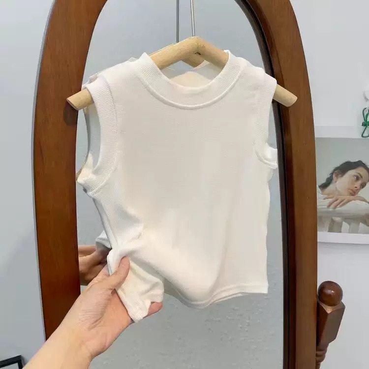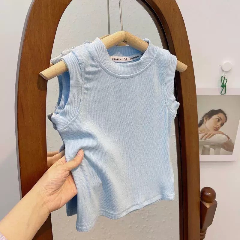 여자 조끼 2025 여름 새로운 어린이 스트레치 민소매 탑 솔리드 컬러 슬링 아기 소녀베이스 셔츠 외부 착용