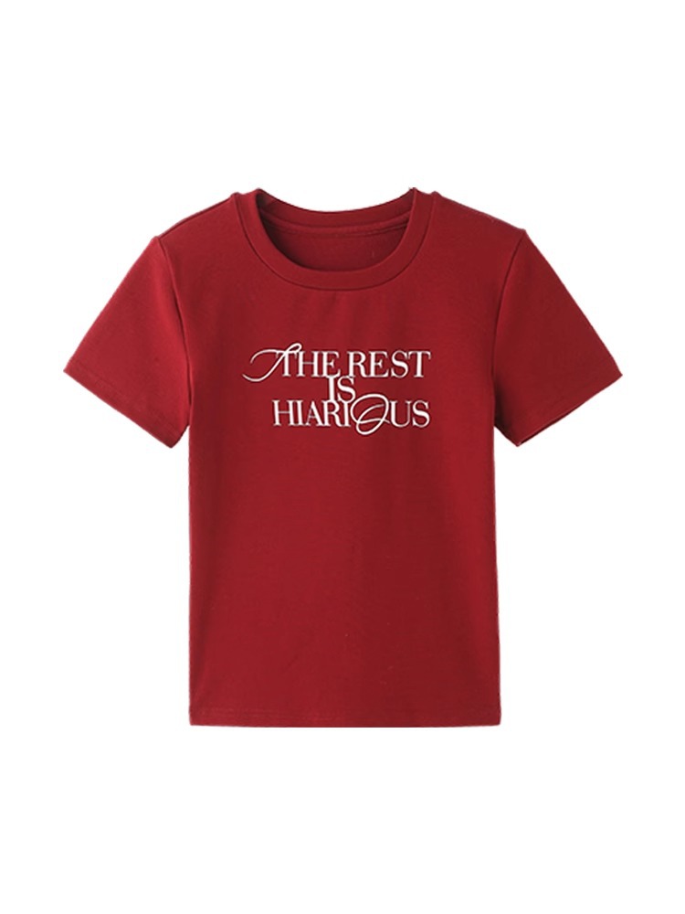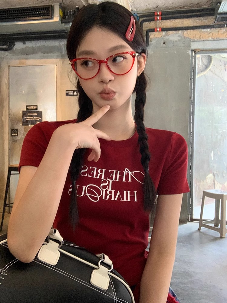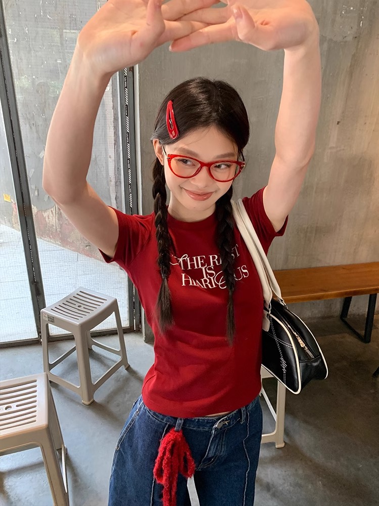 새로운 빨간 어깨 반팔 티셔츠 여성용 2025 년 여름 둥근 목 슬림 핏 슬림 핏 편지 인쇄 여성용 짧은 상단