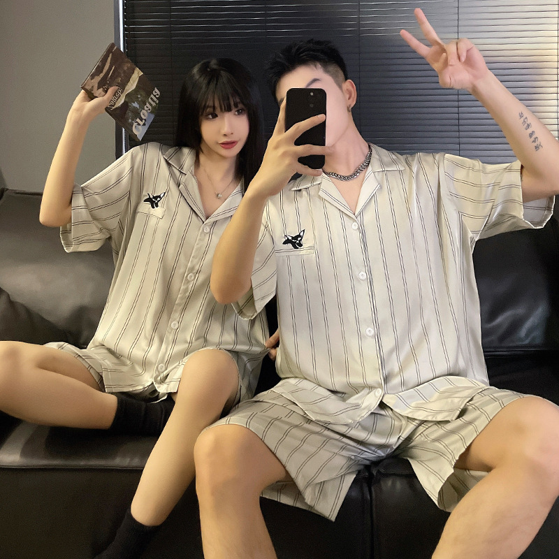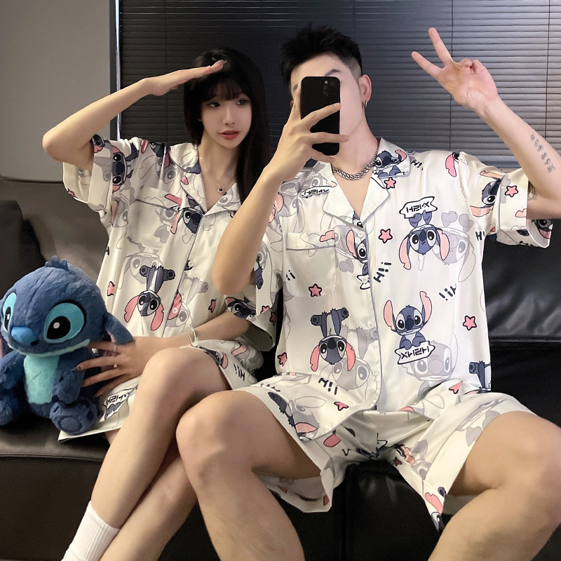 커플 잠옷 여성 여름 반소매 아이스 실크 얇은 2025 새로운 만화 남성 느슨한 플러스 사이즈 홈 의류 세트스토어 가기