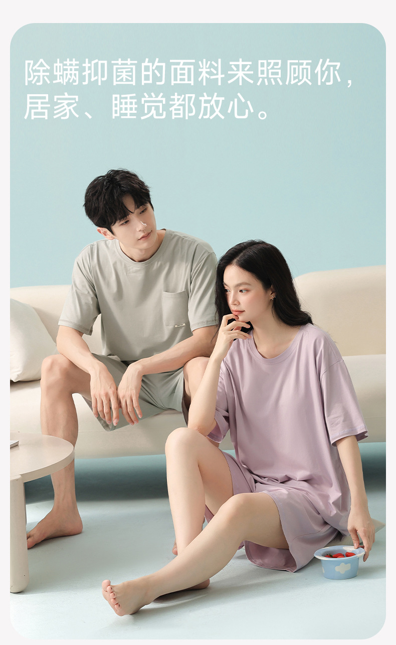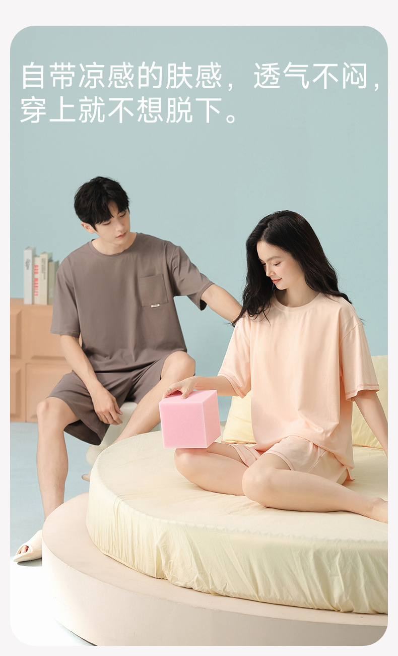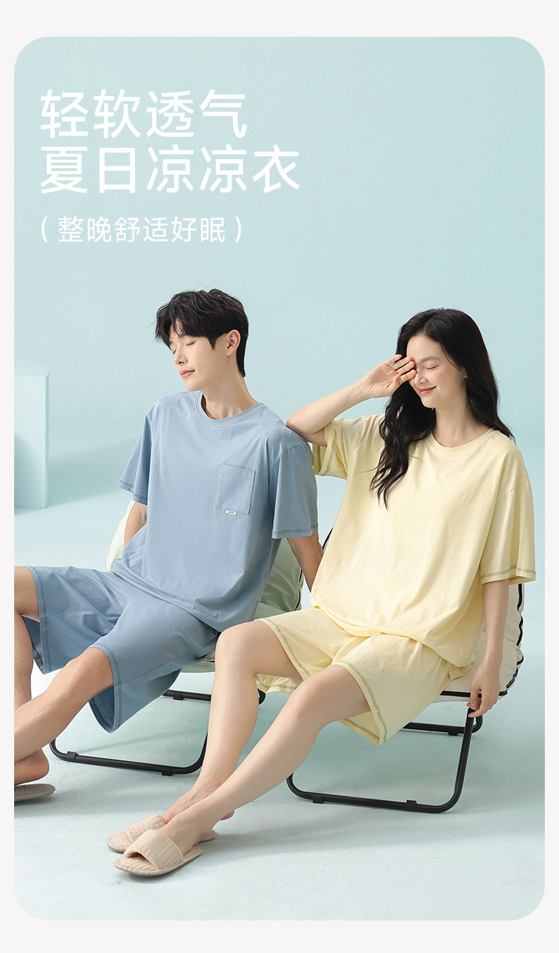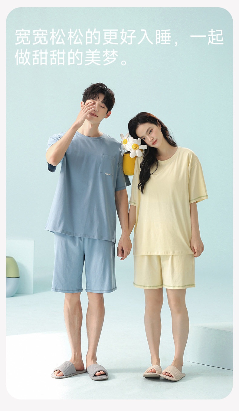 [아이스도자면] 여름 짧은 소매 가슴 패드 여성 커플 잠옷 순면 얇은 남성용 홈 의류 캐주얼 세트