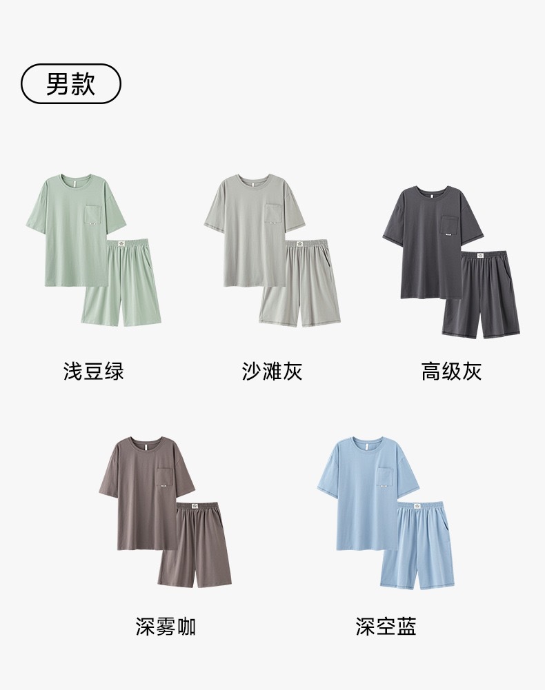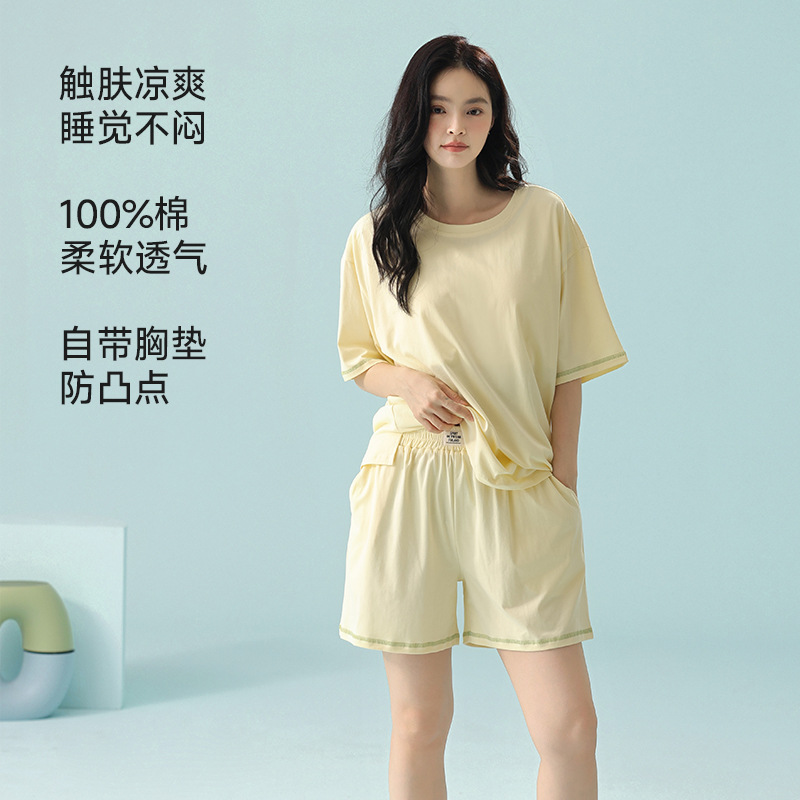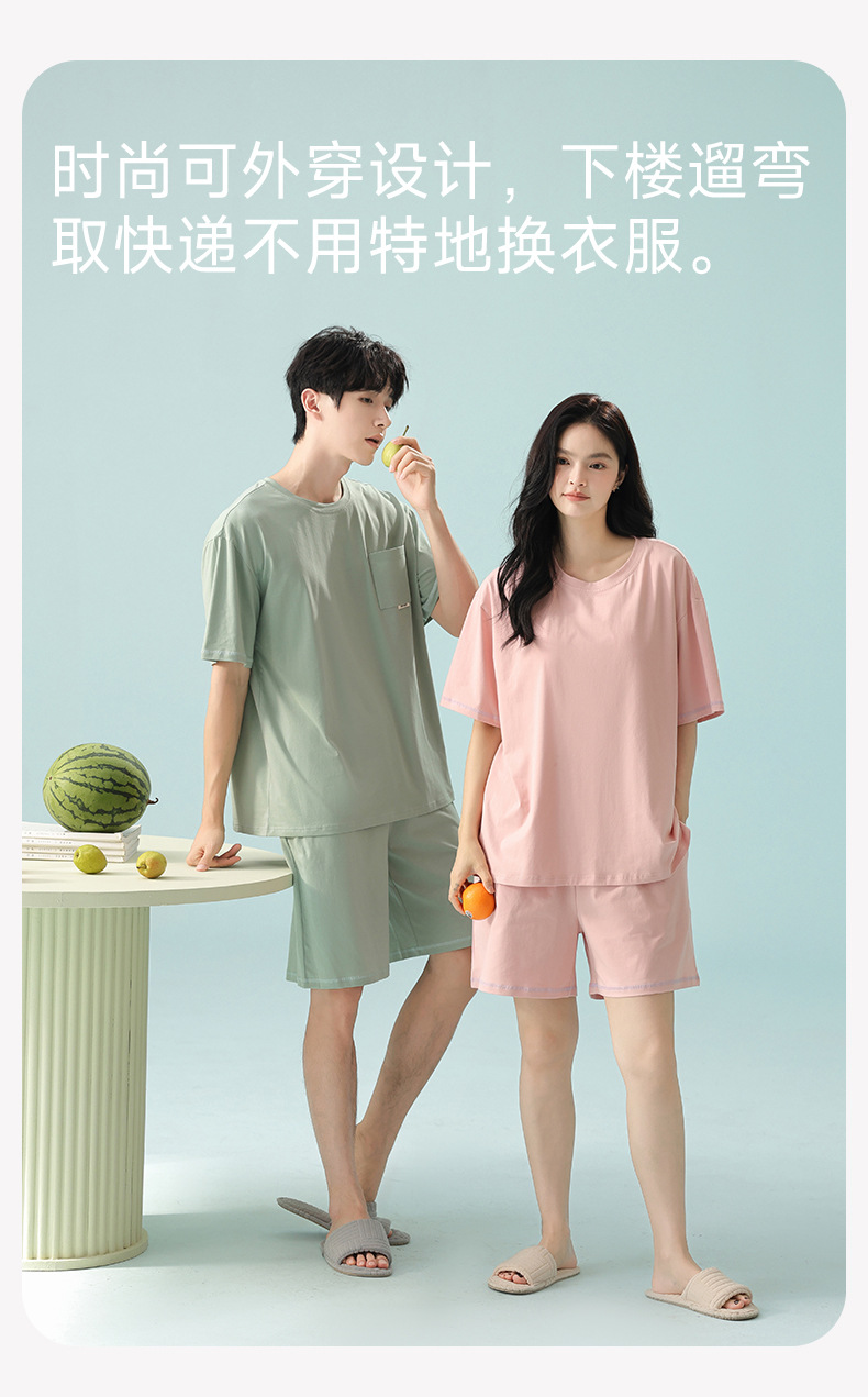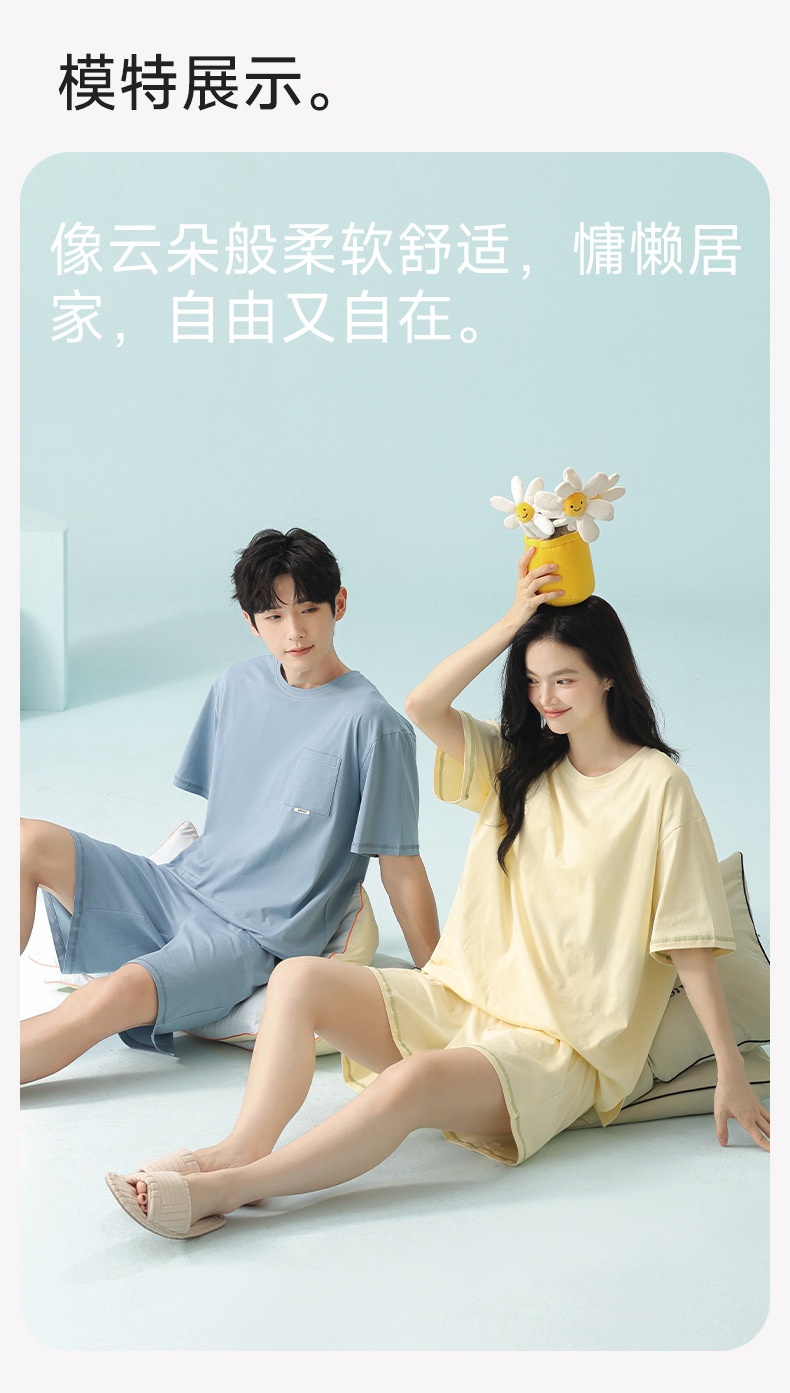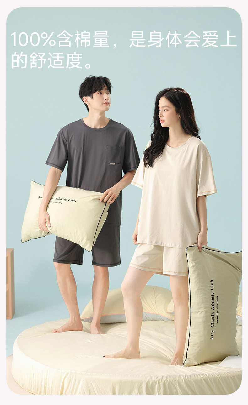 [아이스도자면] 여름 짧은 소매 가슴 패드 여성 커플 잠옷 순면 얇은 남성용 홈 의류 캐주얼 세트