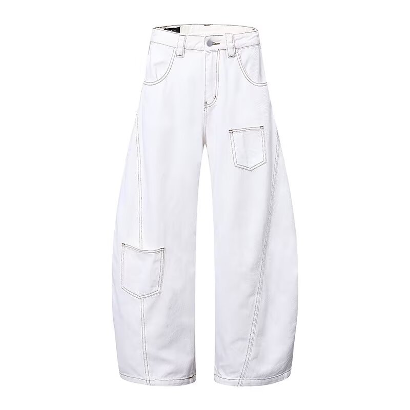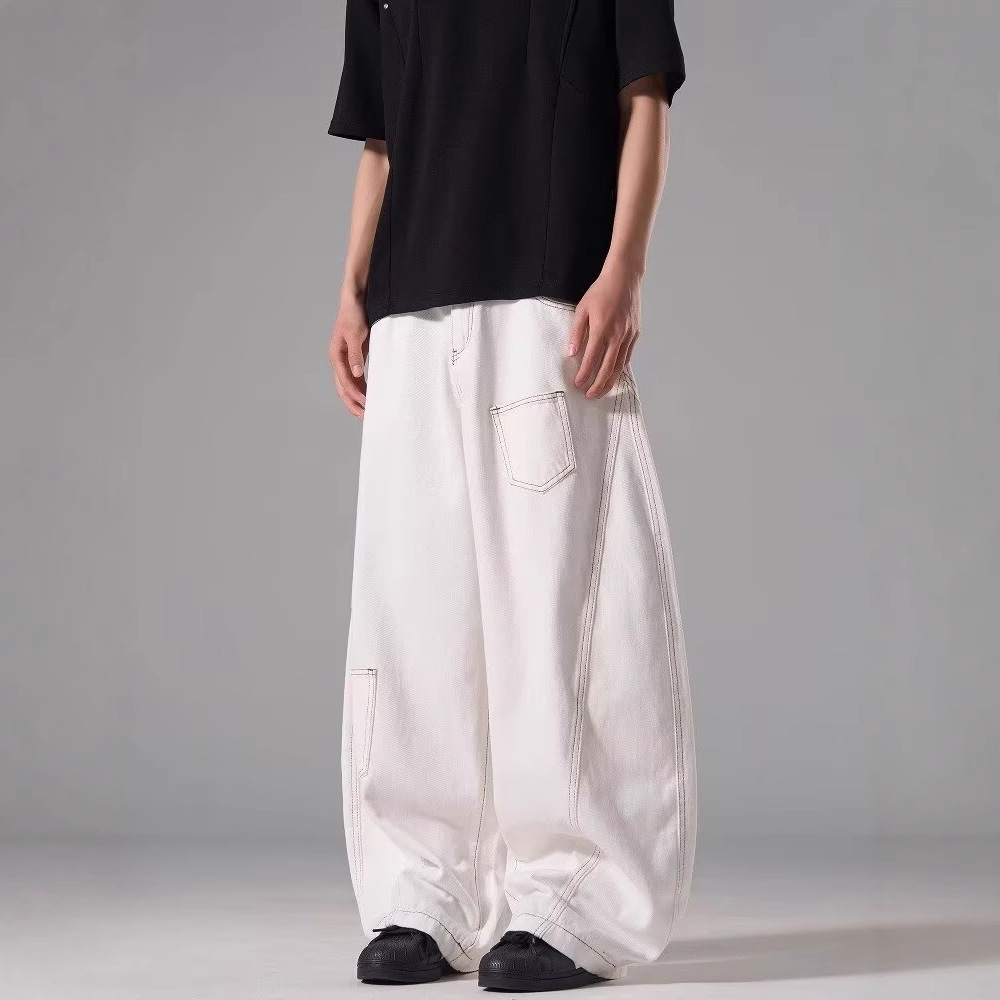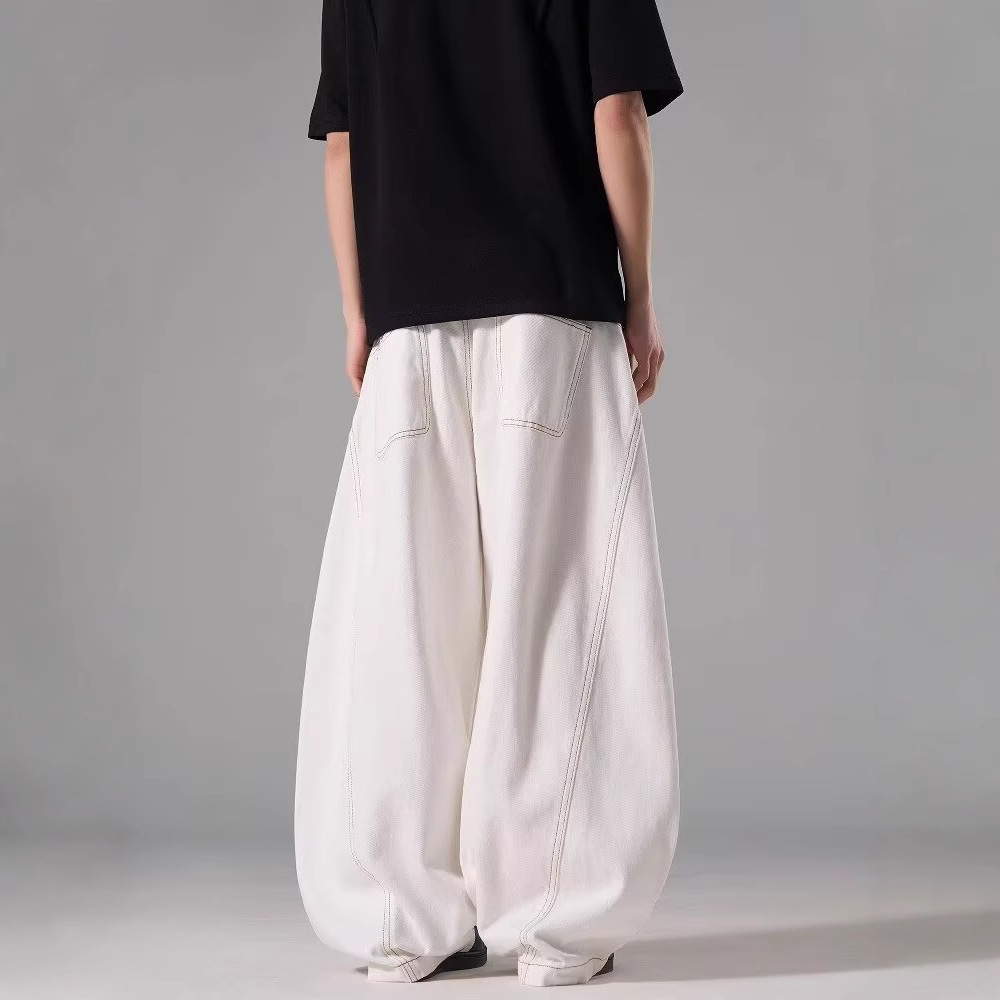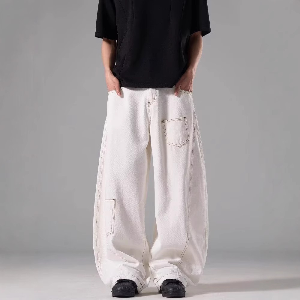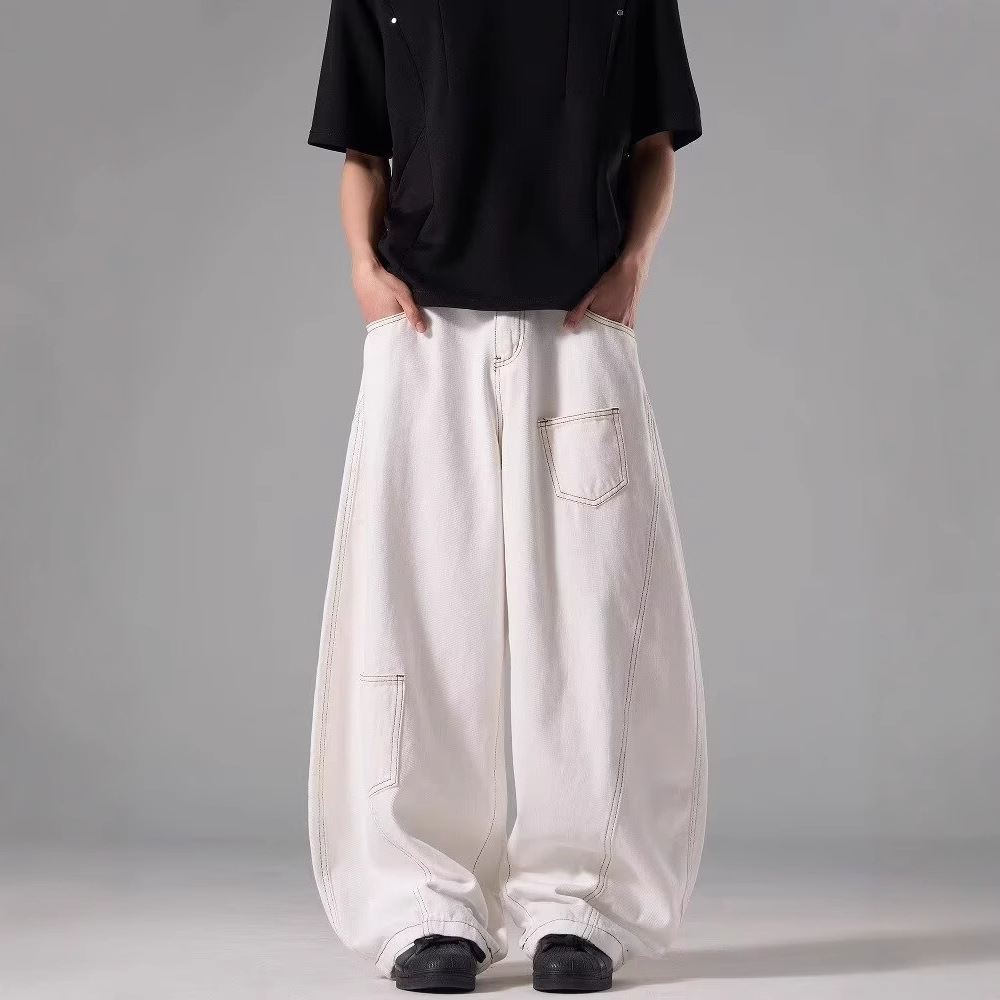 아메리칸 스타일 레트로 화이트 하이 웨이스트 Machete 청바지 남성 여름 새로운 하이 스트리트 디자인 센스 루즈 슬리밍 와이드 레그 바지스토어 가기