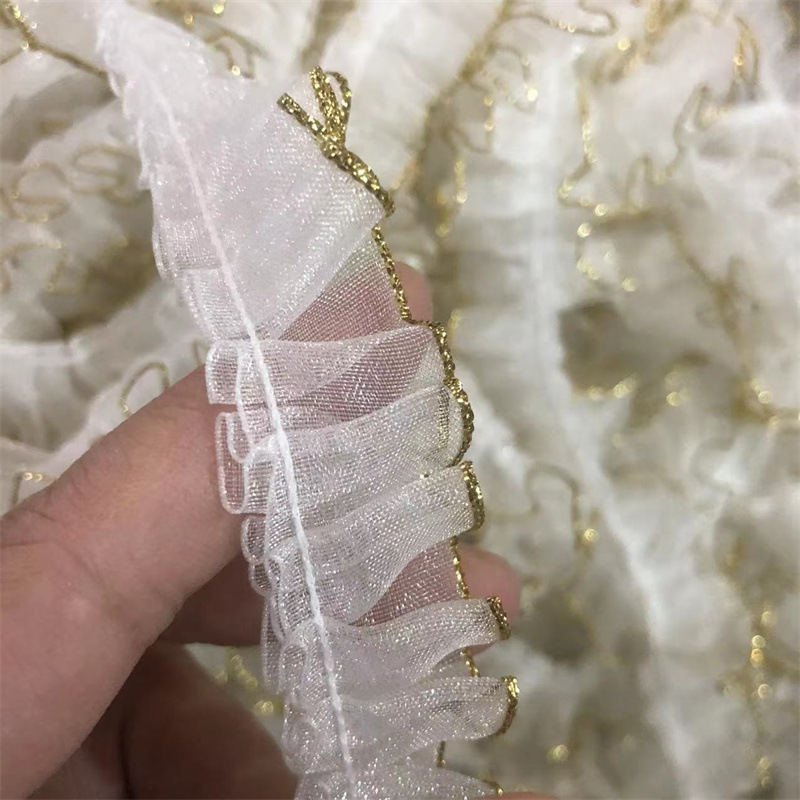 2cm 와이드 화이트 스노우 거즈 골드 실크 엣지 주름 레이스 공주 아기 옷 핸드메이드 DIY 장식 재료