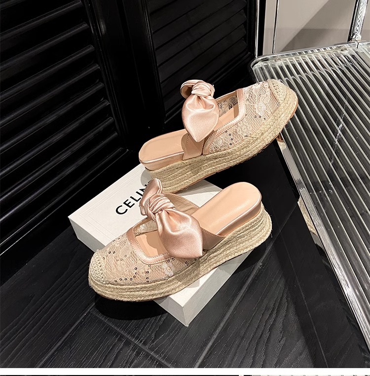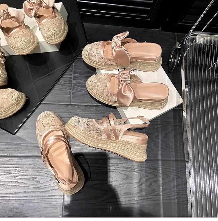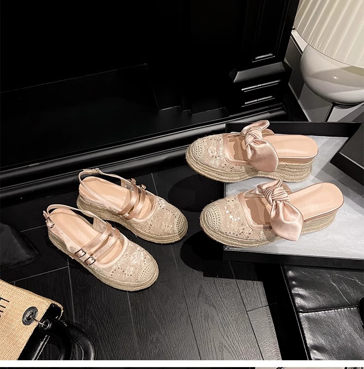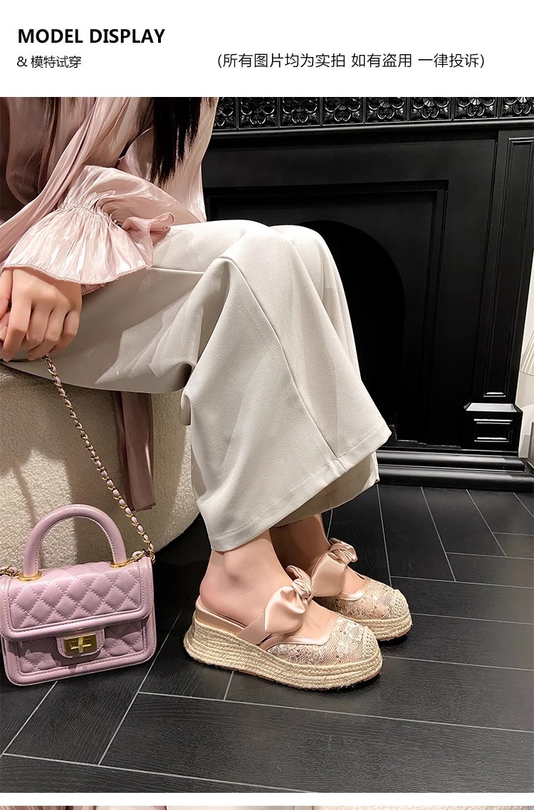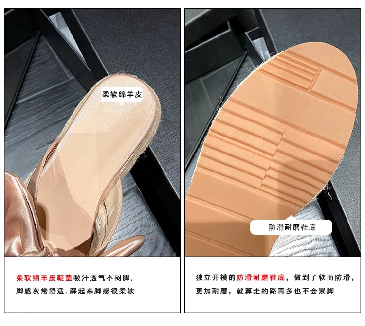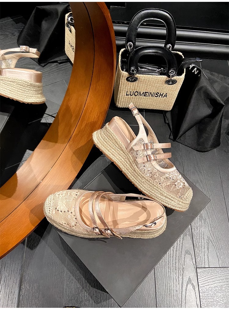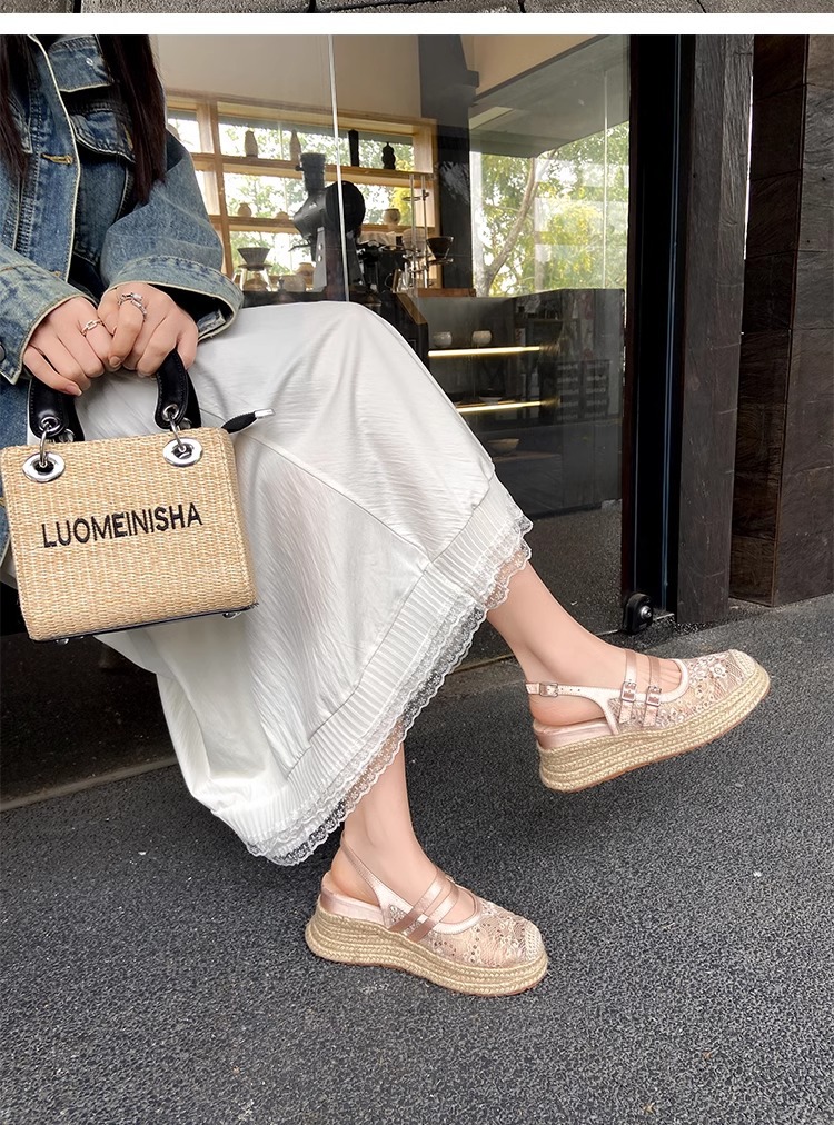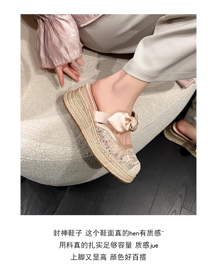 대량 재고 있음 ~ 새로운 웨지 힐 발가락 샌들 여성 라운드 발가락 2025 여름 두꺼운 밑창 뮬러 드래그 모리 여성 밀짚 여성 신발스토어 가기