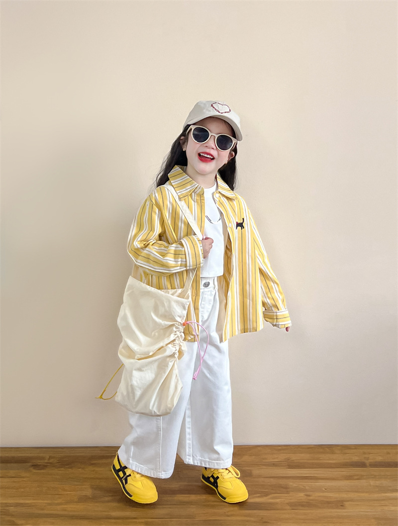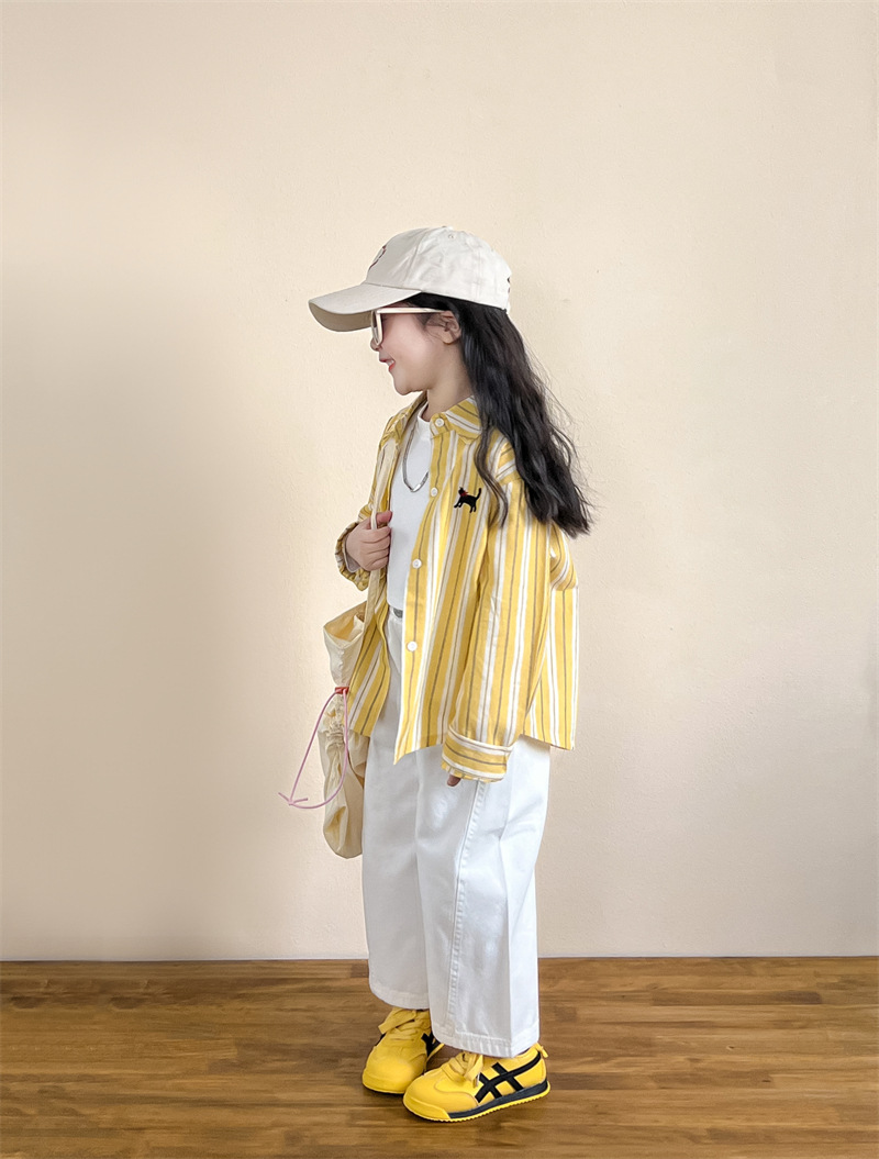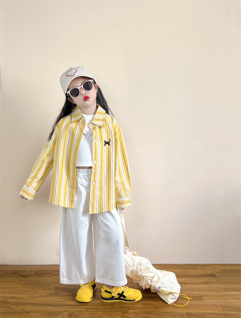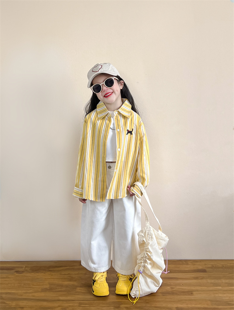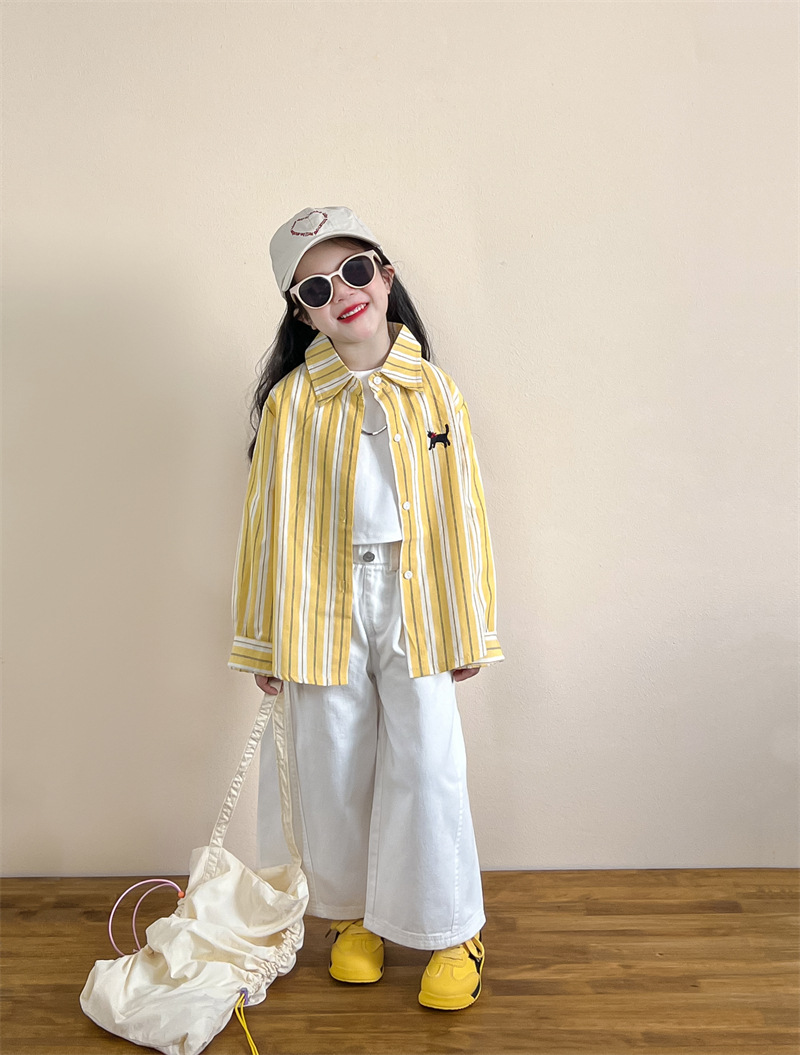 한국 캐주얼 소년 소녀 봄과 가을 자수 강아지 노란색 줄무늬 긴팔 셔츠 어린이 긴소매 탑 트렌디 한 대외 무역