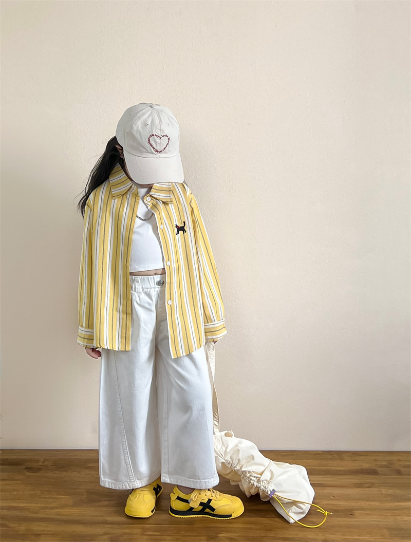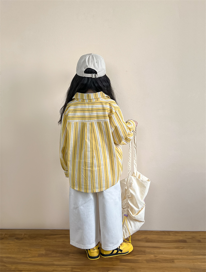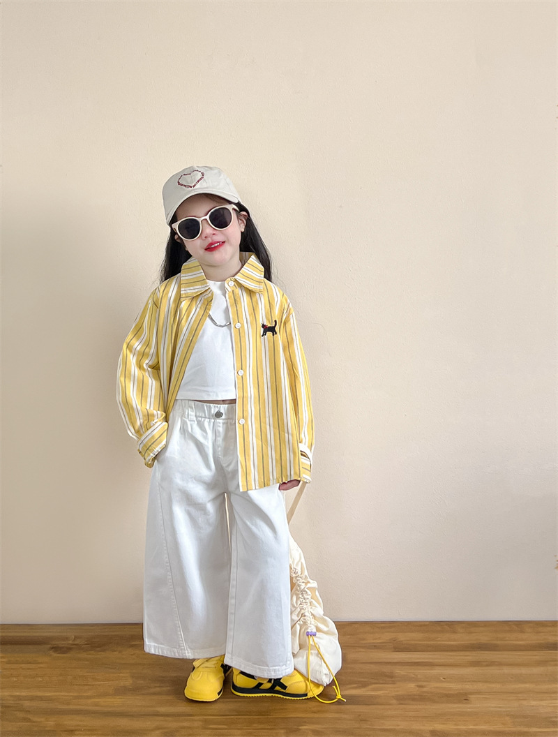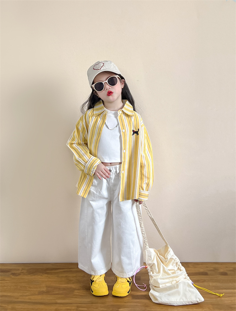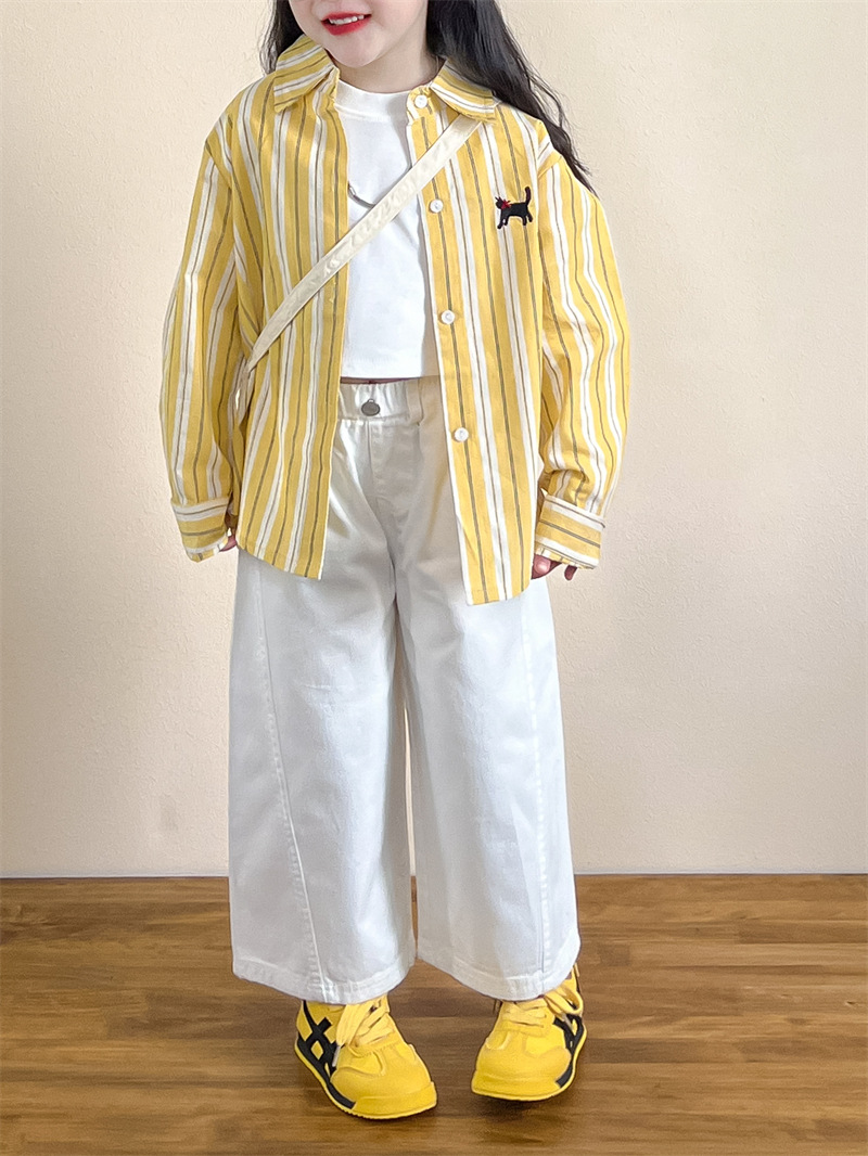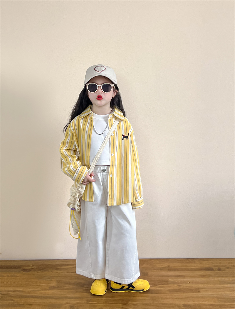 한국 캐주얼 소년 소녀 봄과 가을 자수 강아지 노란색 줄무늬 긴팔 셔츠 어린이 긴소매 탑 트렌디 한 대외 무역