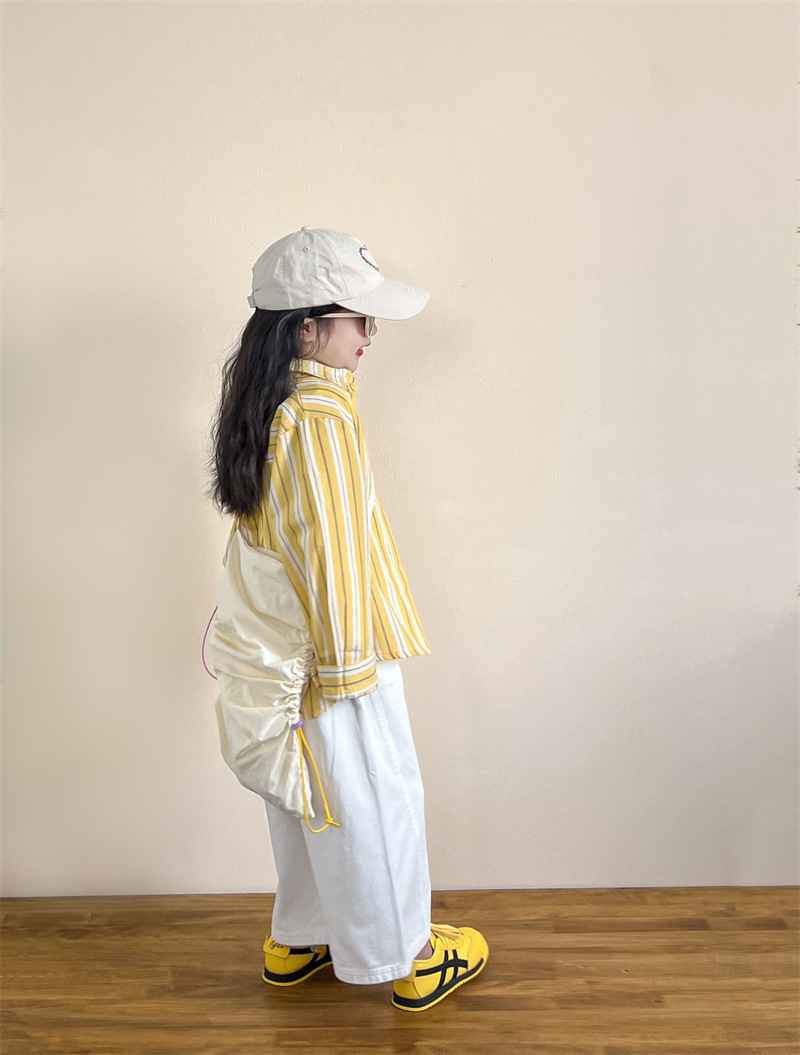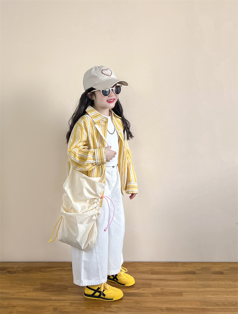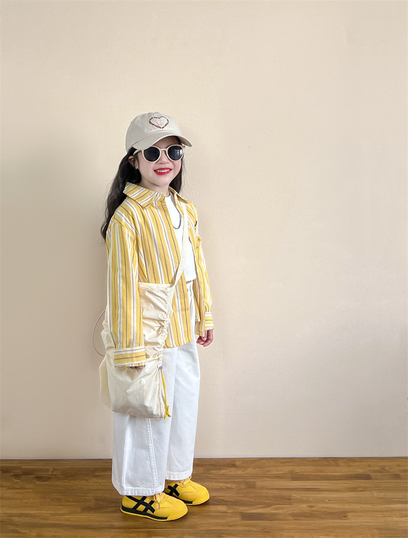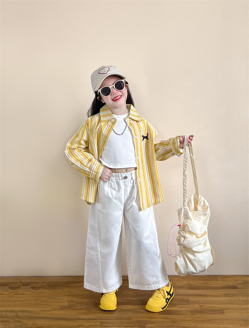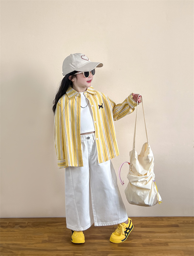 한국 캐주얼 소년 소녀 봄과 가을 자수 강아지 노란색 줄무늬 긴팔 셔츠 어린이 긴소매 탑 트렌디 한 대외 무역
