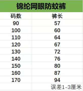 锦纶冰感蝴蝶网防蚊裤90-130 110-150 130-170