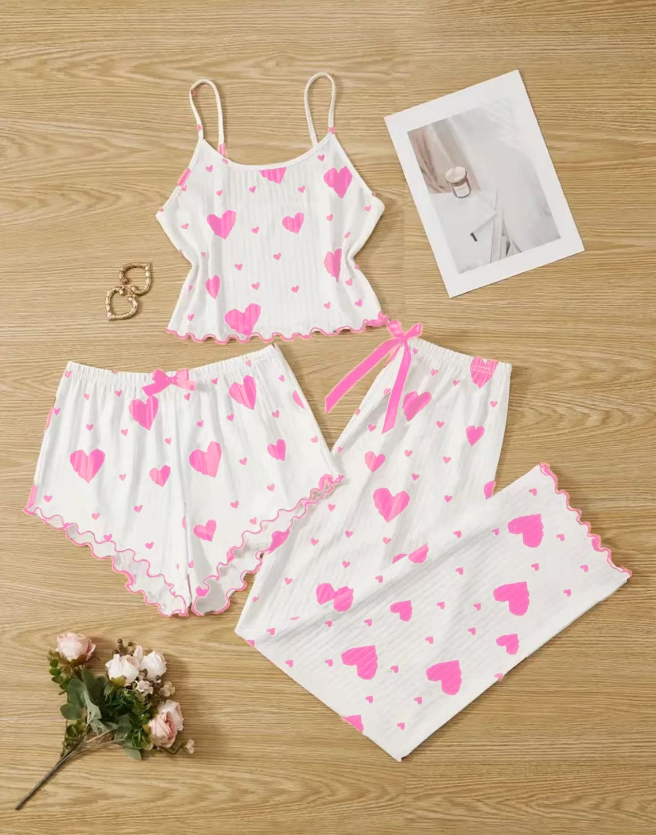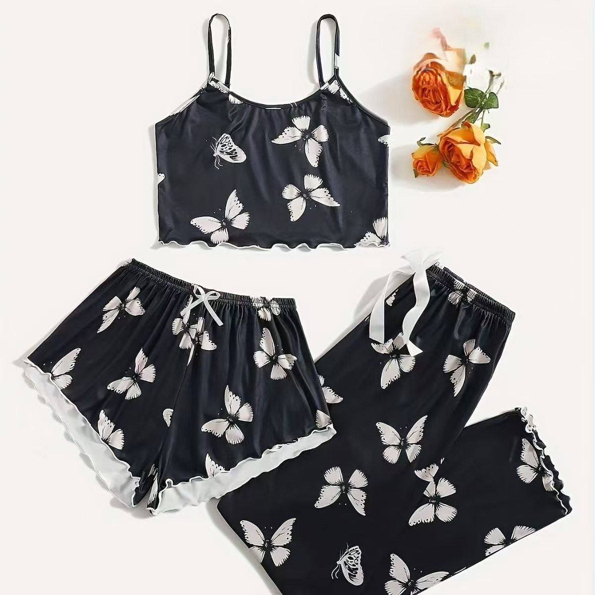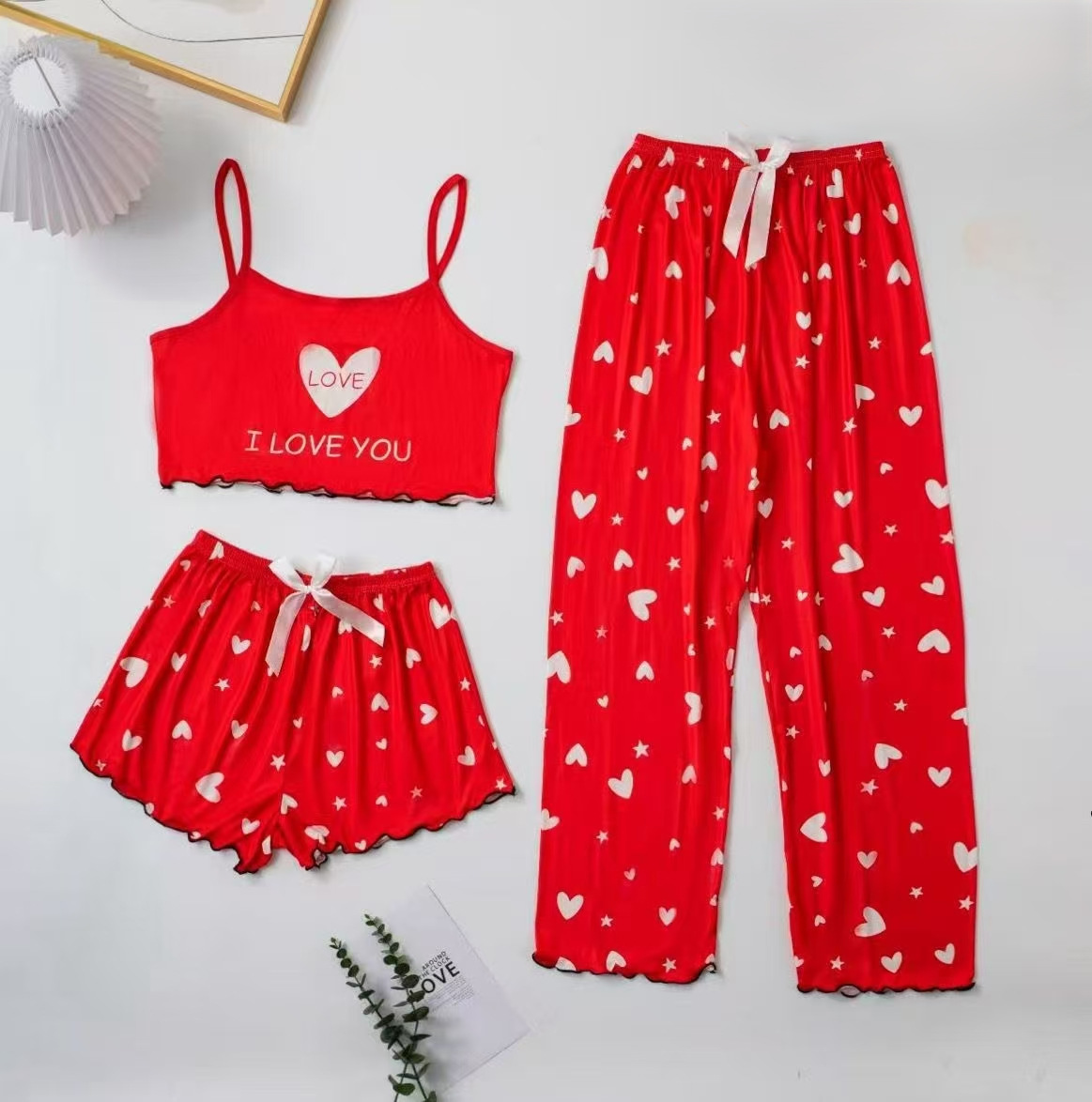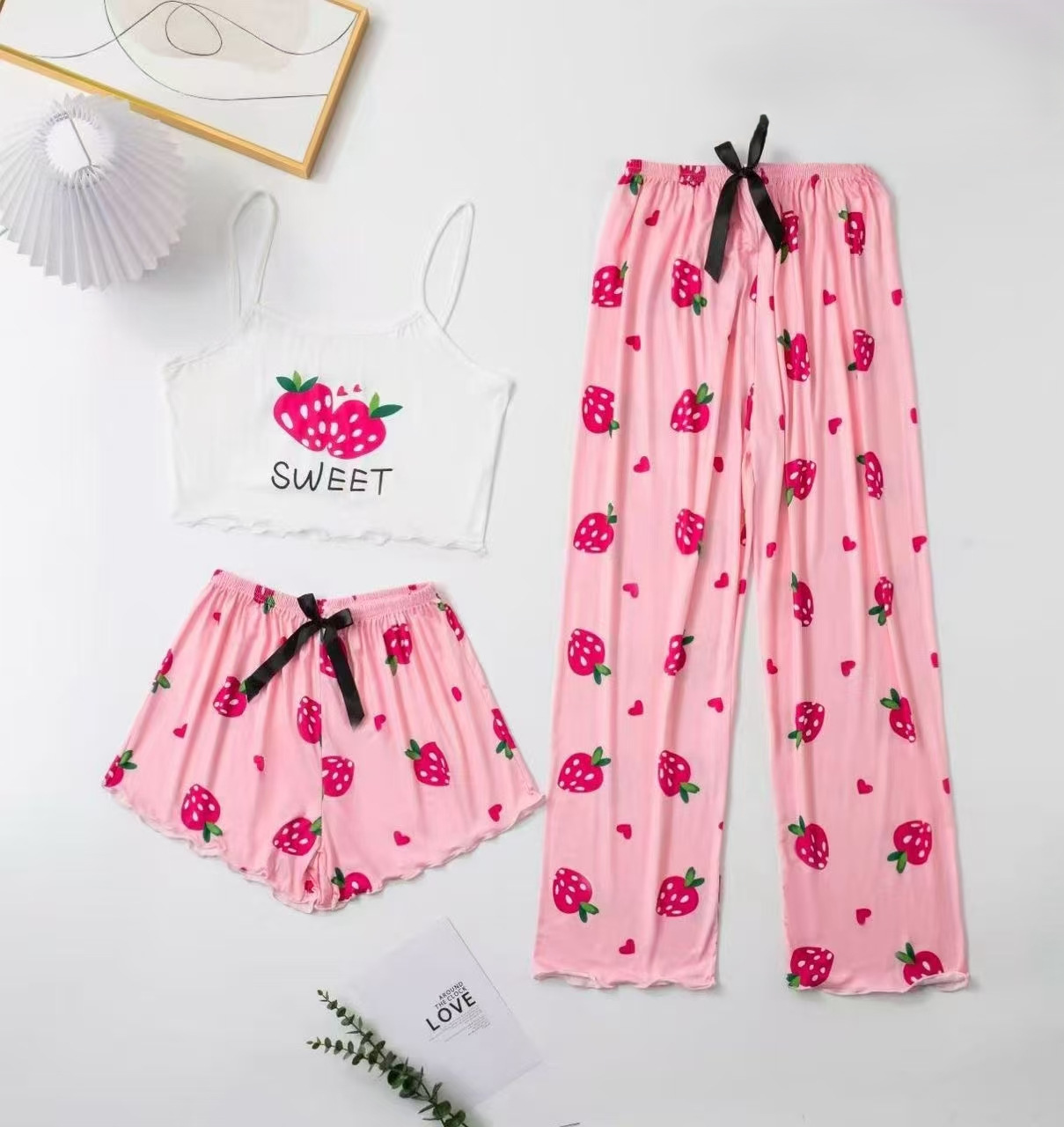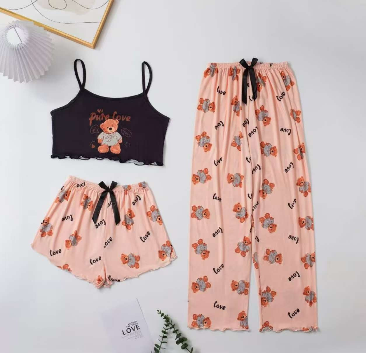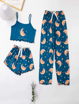2025 새로운 스타일 홈 의류 여성 잠옷 세트 슬링 인쇄 잠옷 세트 바지 3 조각 만화 7703