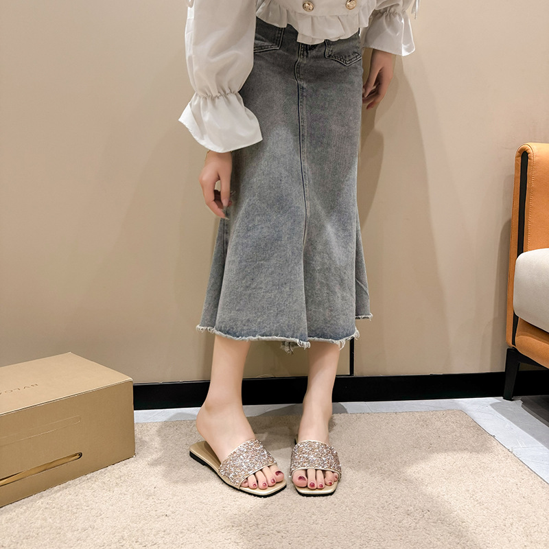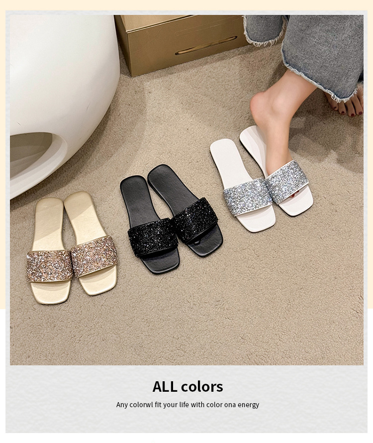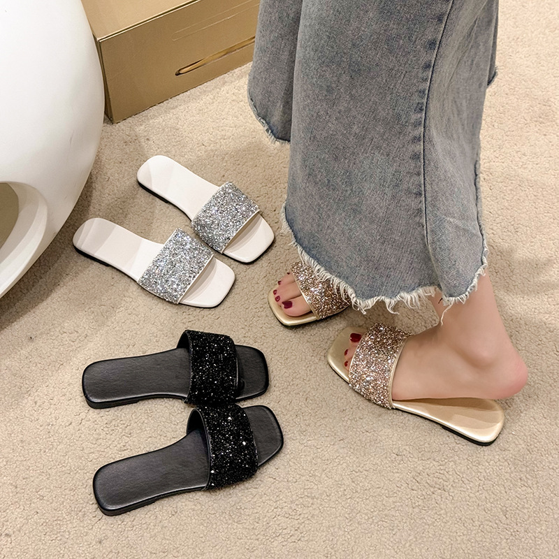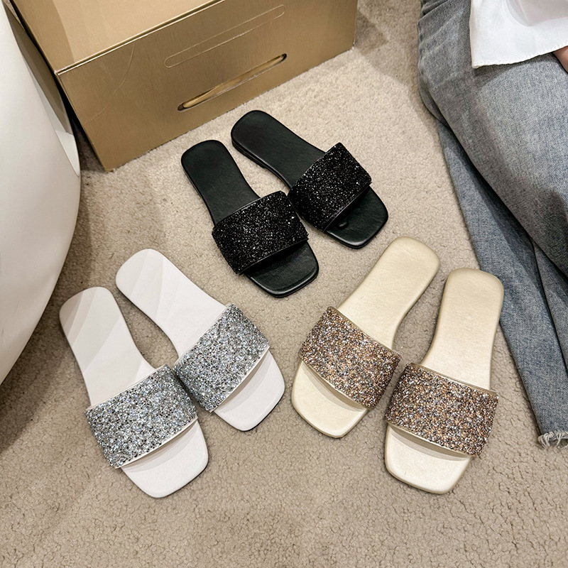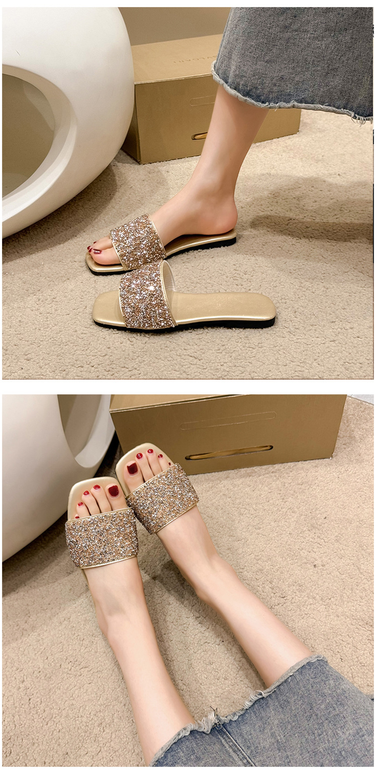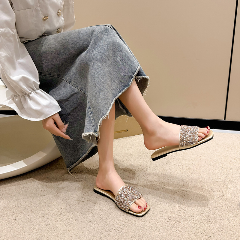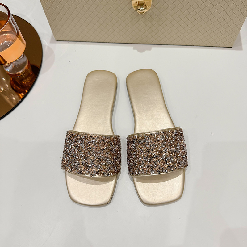 여성 플랫 슬리퍼 새로운 패션 골든 라인스톤 간단한 편안한 비치 여성용 플랫 슬리퍼 플러스 사이즈스토어 가기