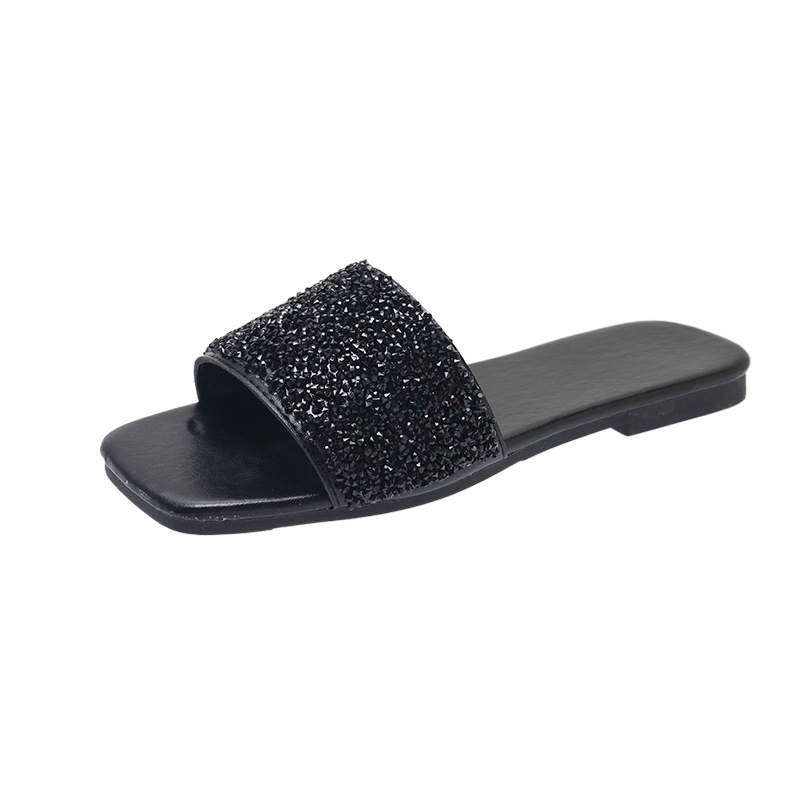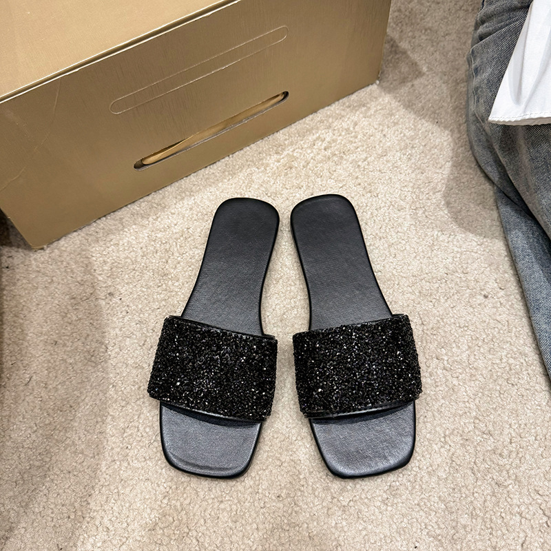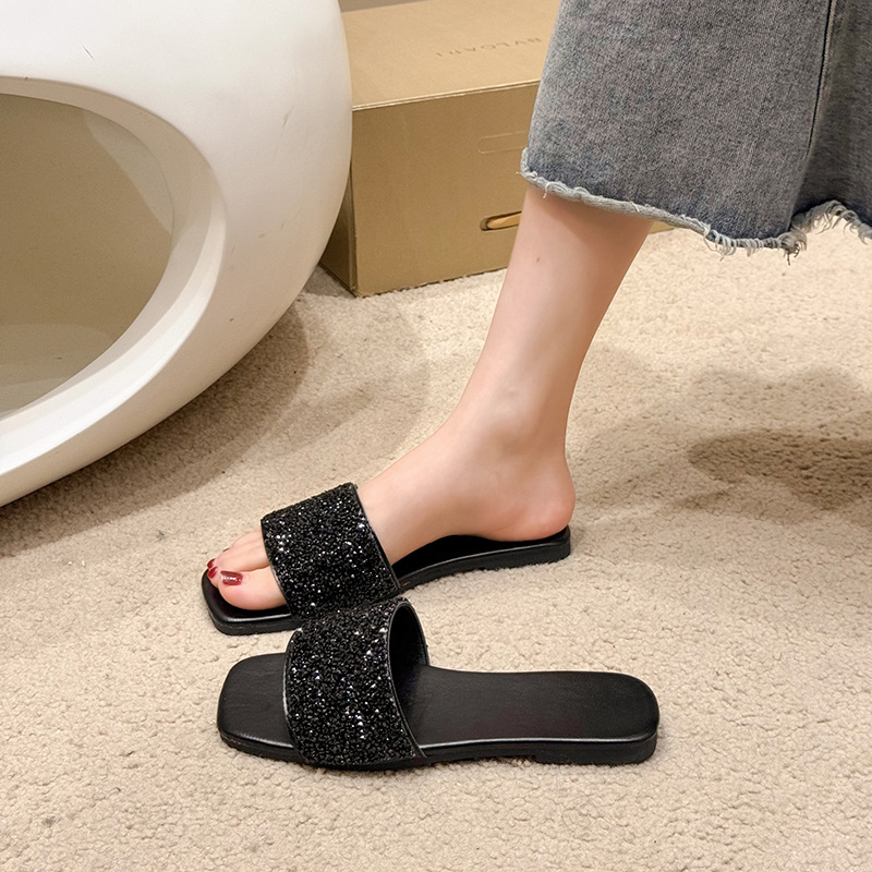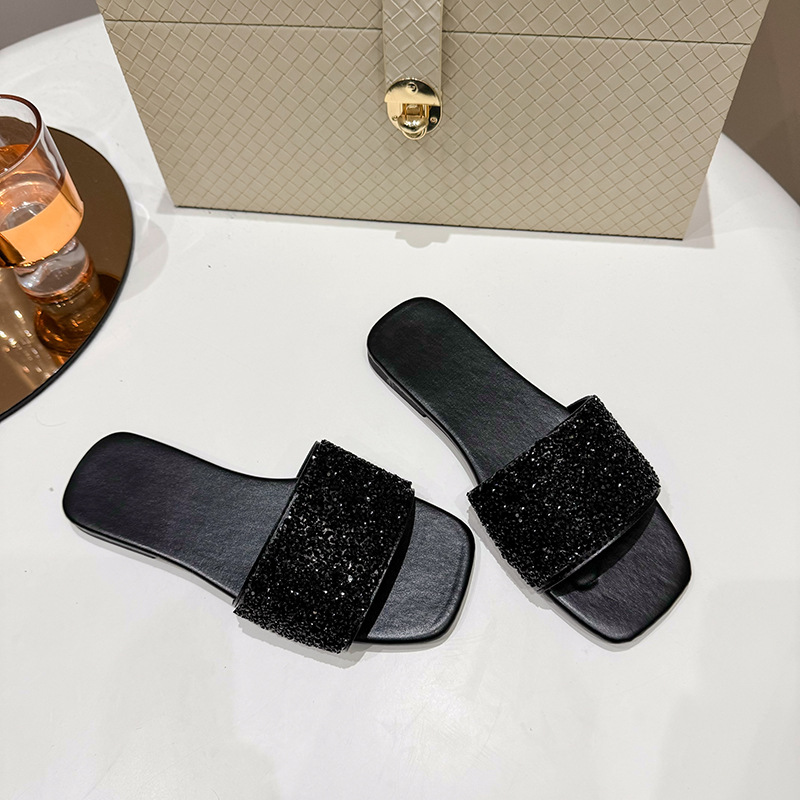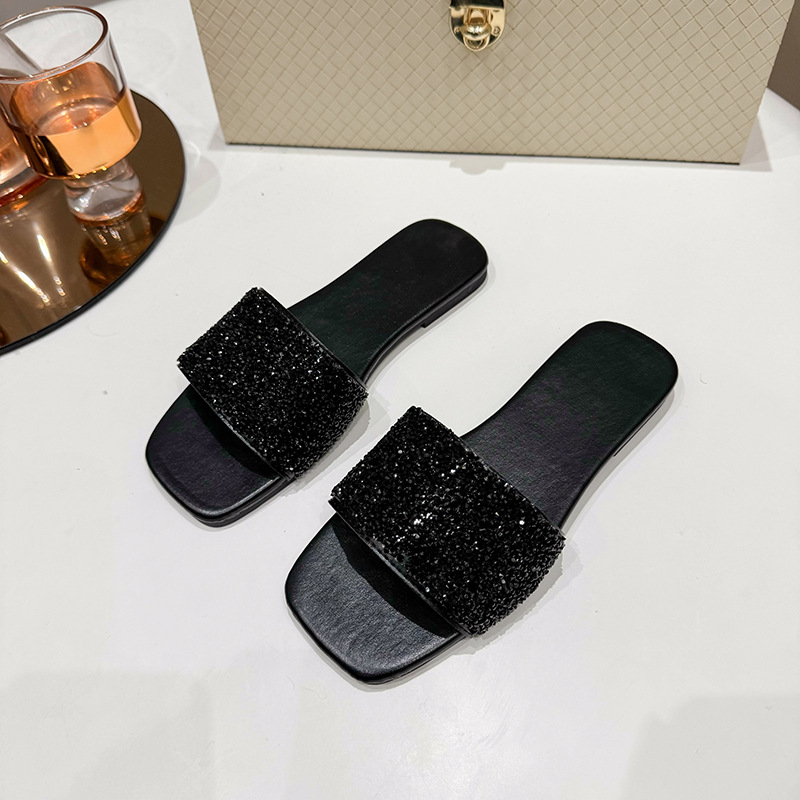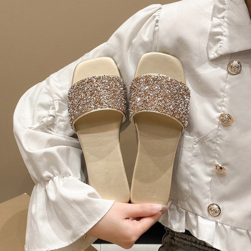 여성 플랫 슬리퍼 새로운 패션 골든 라인스톤 간단한 편안한 비치 여성용 플랫 슬리퍼 플러스 사이즈