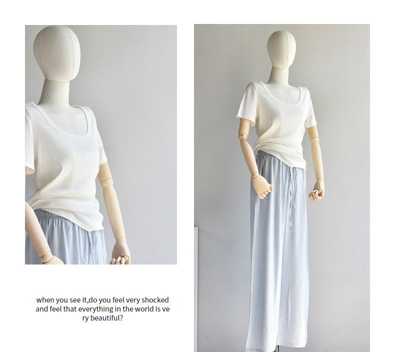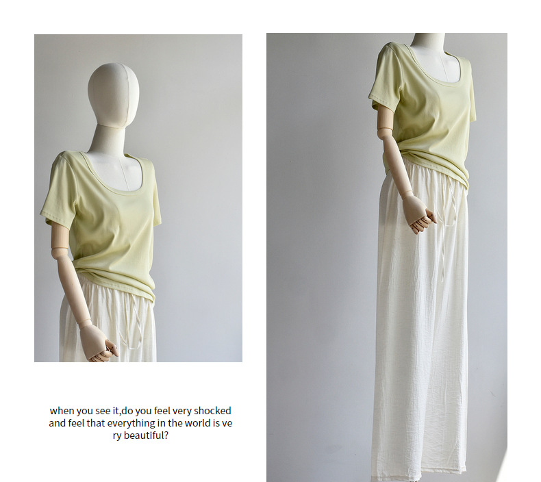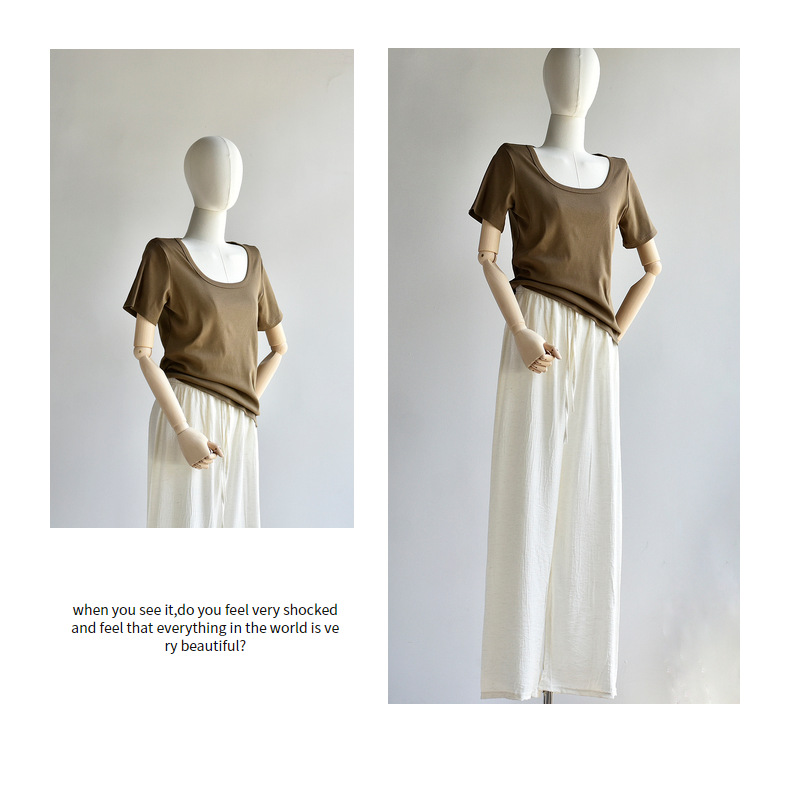 [유코시 방정식 T] 여름 새 여성 U-넥 스퀘어 넥 화이트 루즈 티셔츠 짧은 소매 낮은 목 어깨 탑