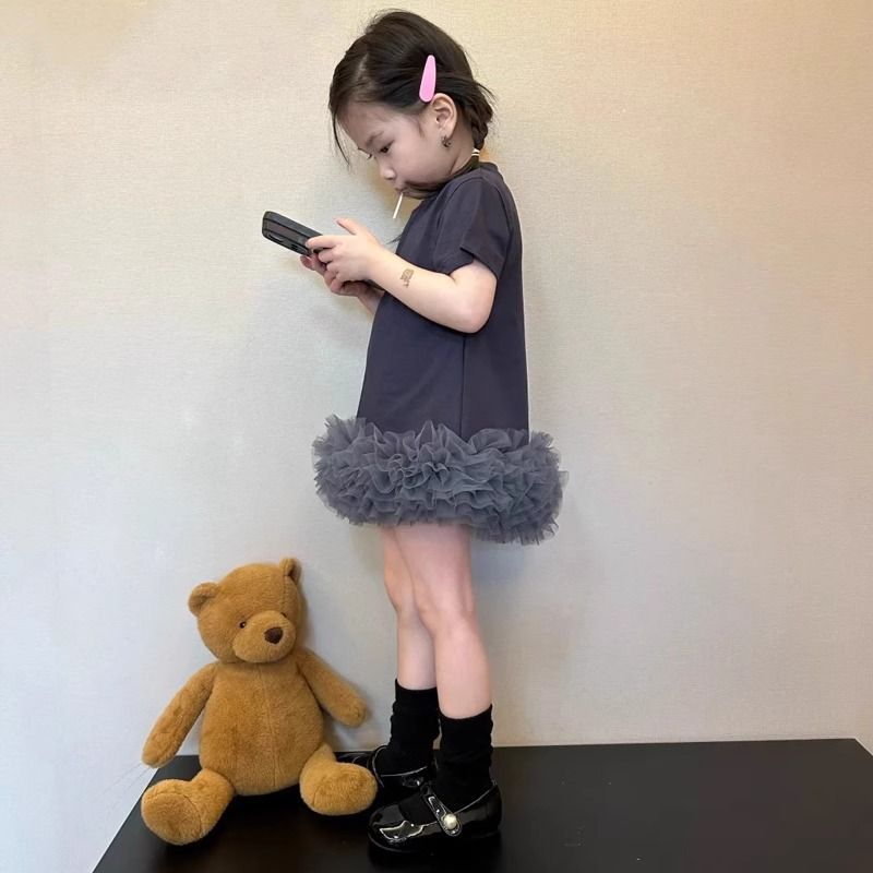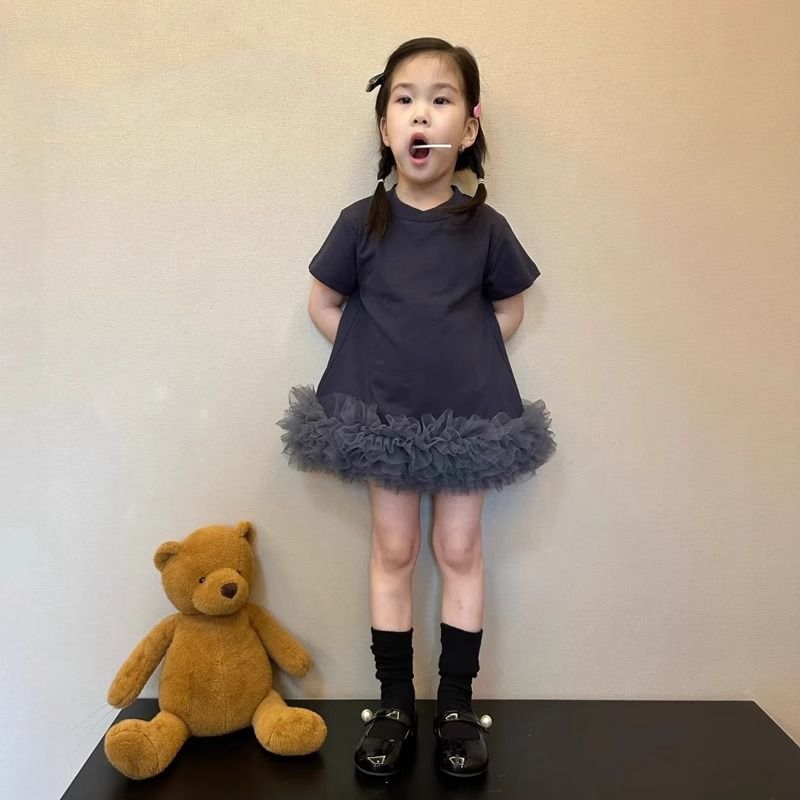 어린 소녀 한국 스타일 유행 간단한 단색 달콤한 반팔 티셔츠 드레스 어린 아이 여름 스타일 드레스스토어 가기