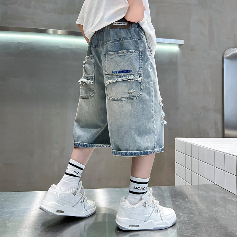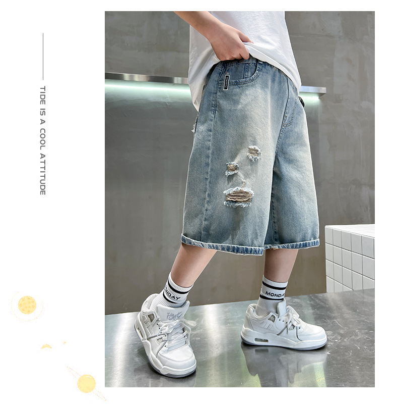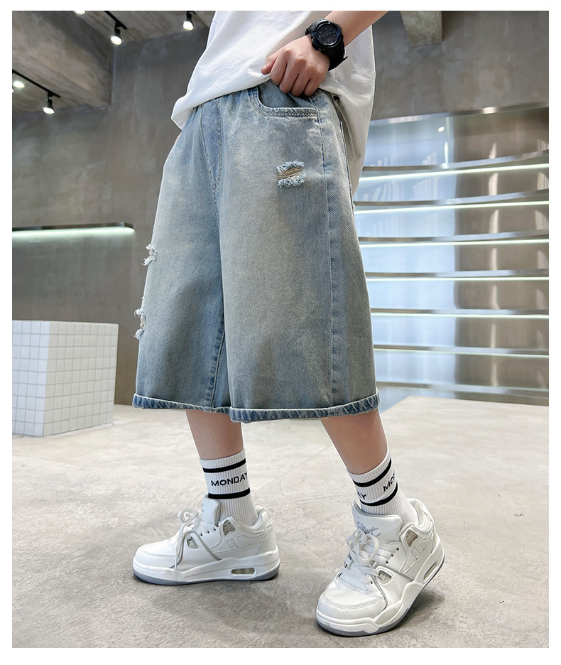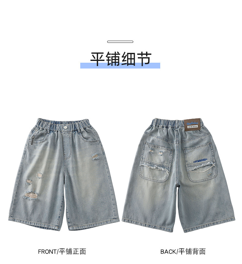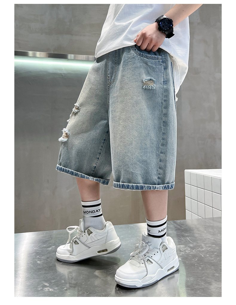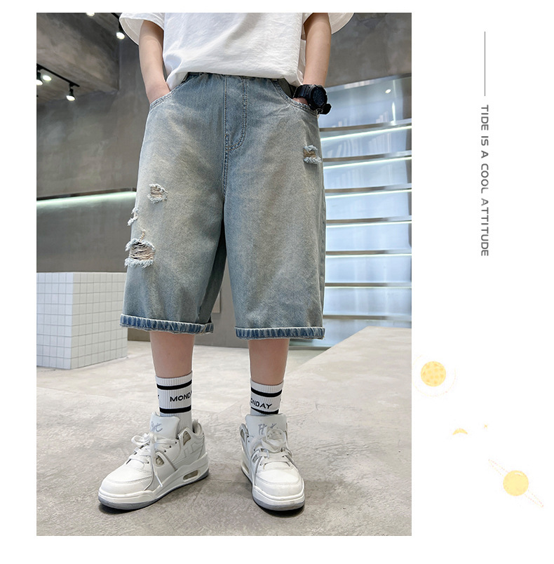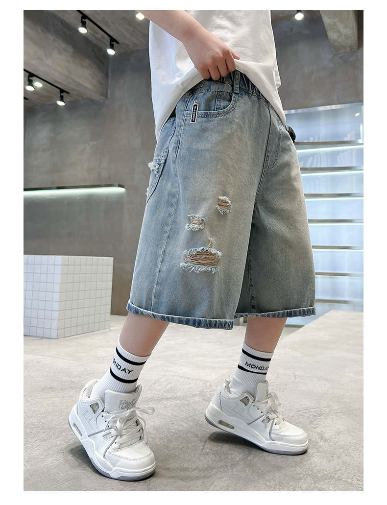 남아용 멋진 데미지 데님 반바지 2026년 신상 아동용 중대형 남아 5부/7부 중간 길이 바지 트렌디스토어 가기