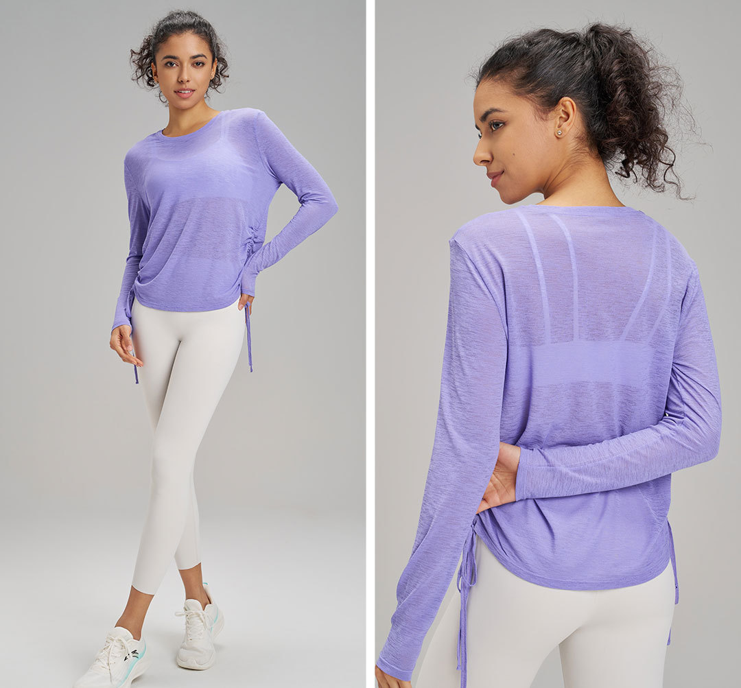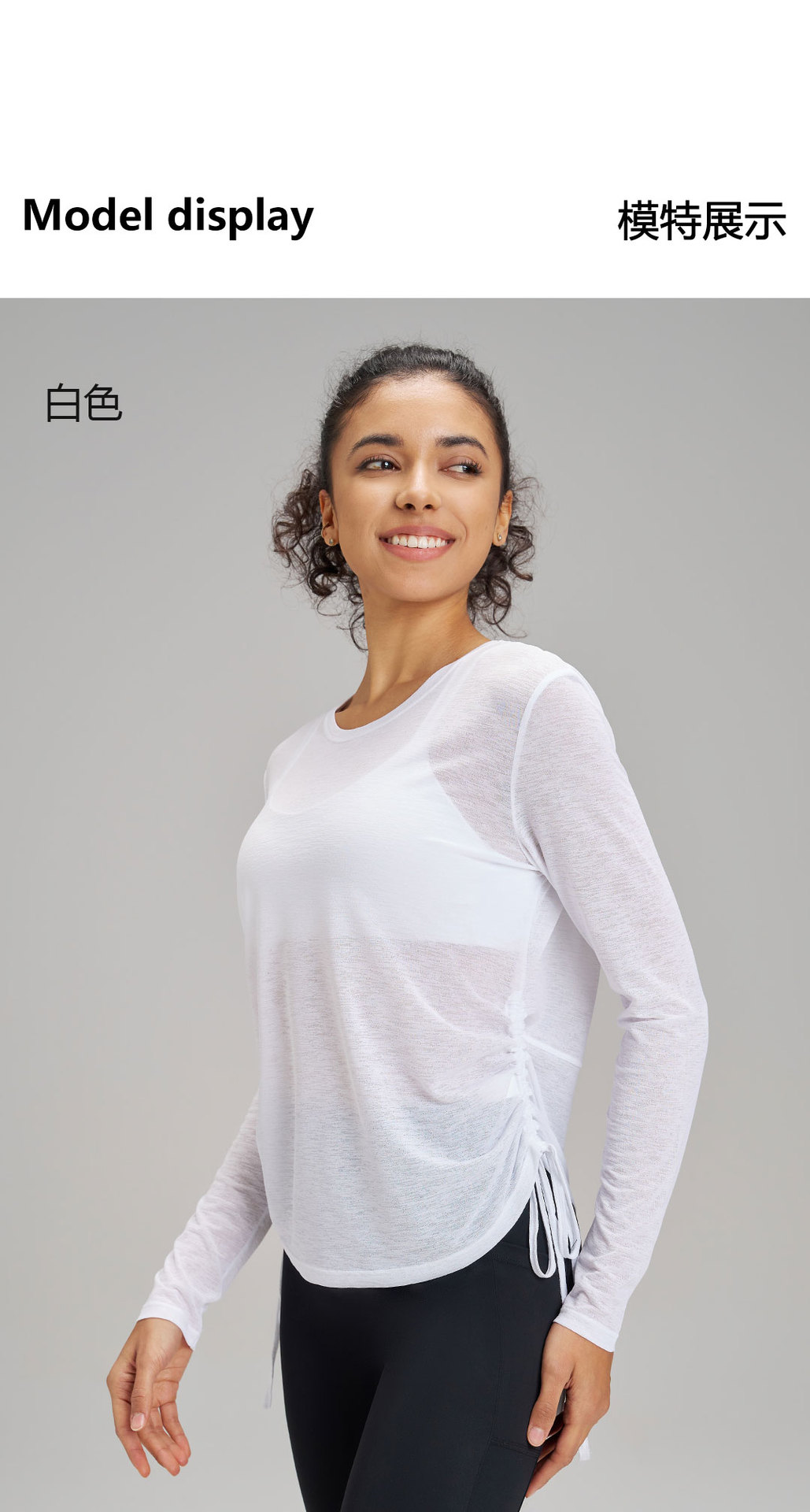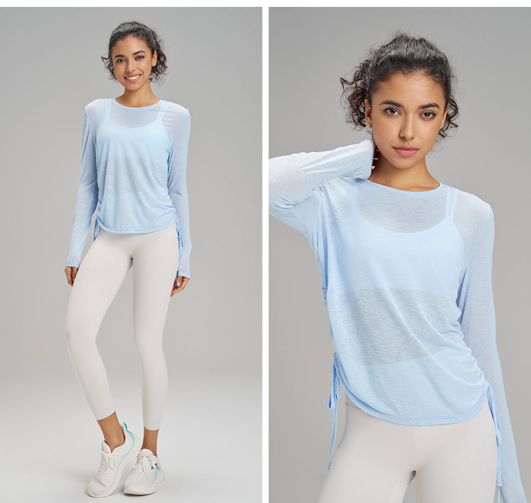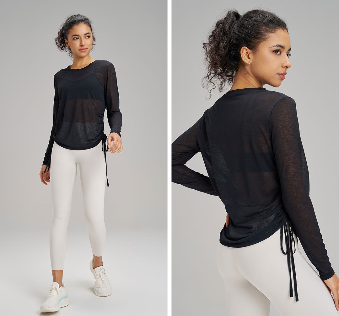 메쉬 통기성 Drawstring 긴 소매 탑 스포츠 피트니스 요가 티셔츠 빠른 건조 관점 느슨한 요가 착용 여성