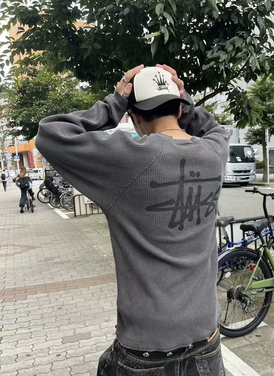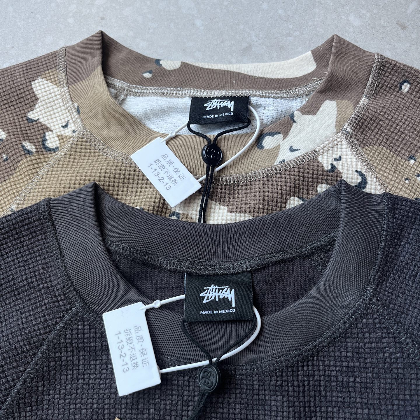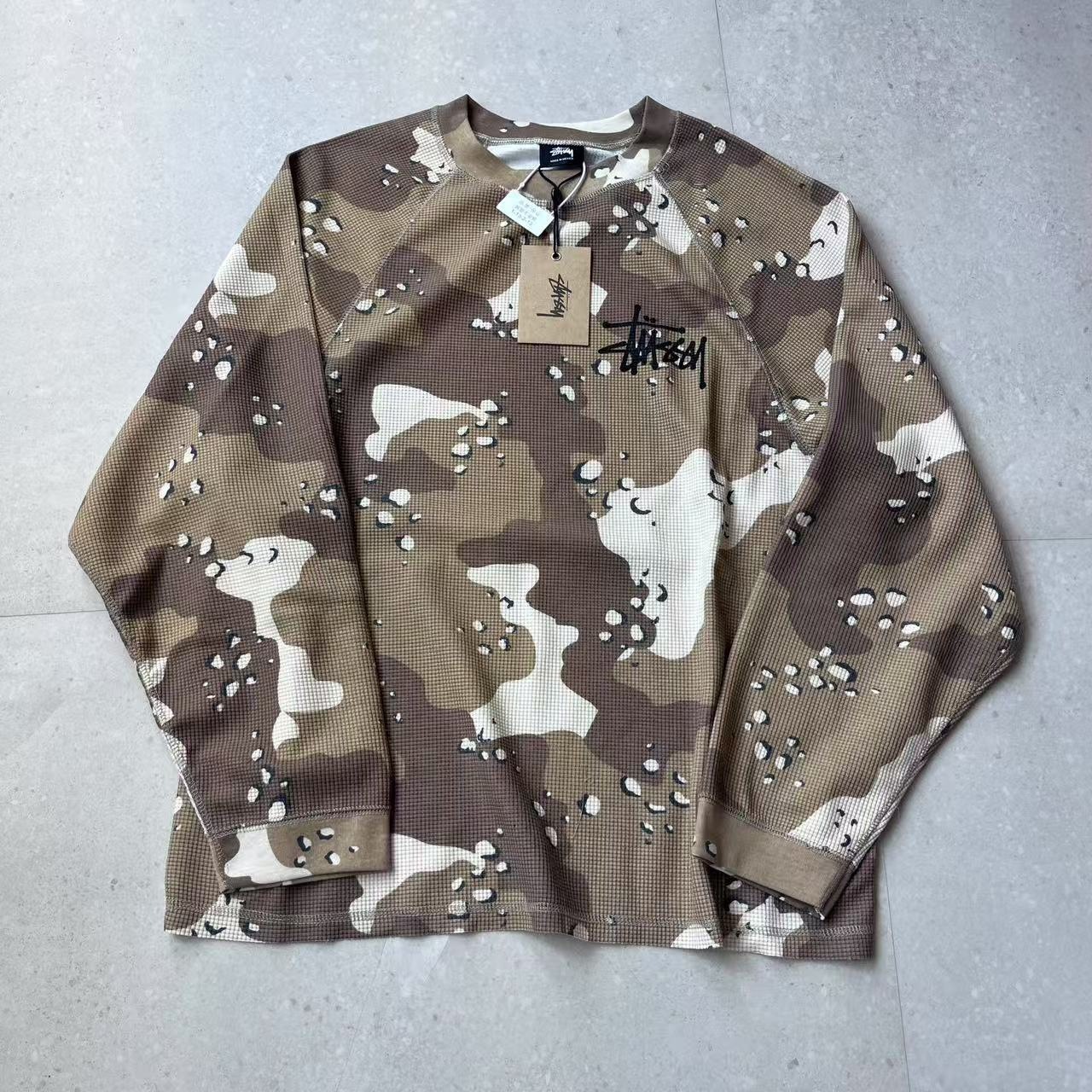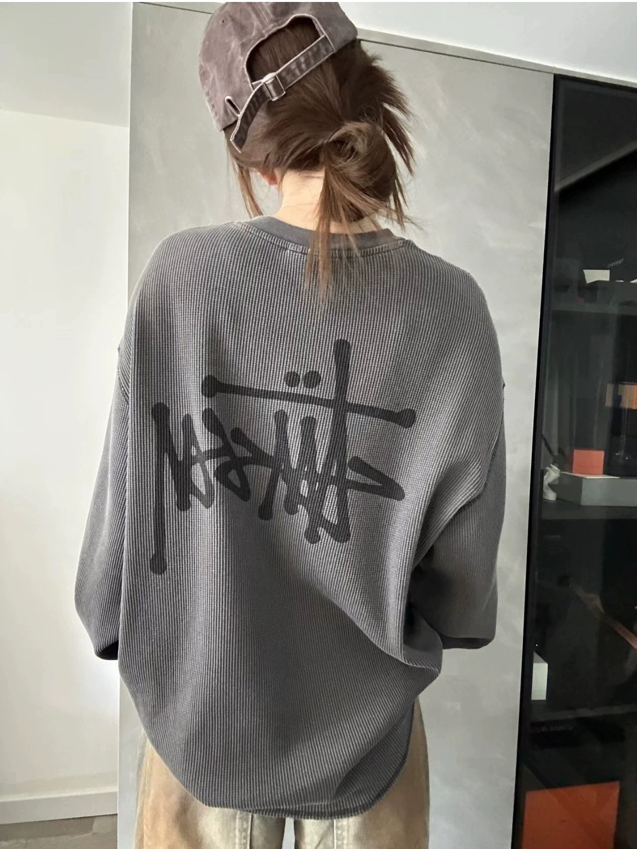 국경 간 고품질 STU 위장 와플 헐렁한 커플 복고풍 툴링 둥근 목 스웨터 긴팔 티셔츠베이스 셔츠