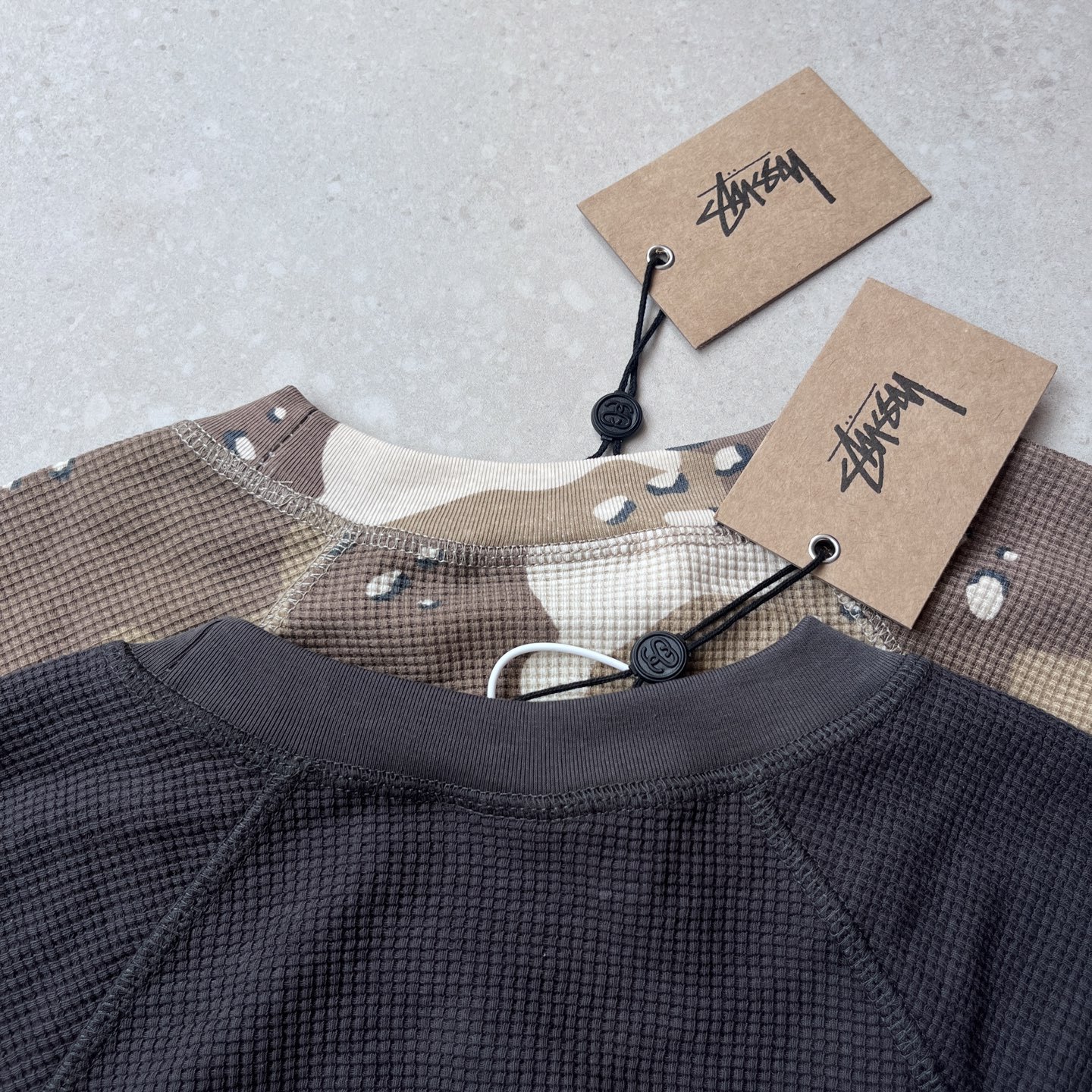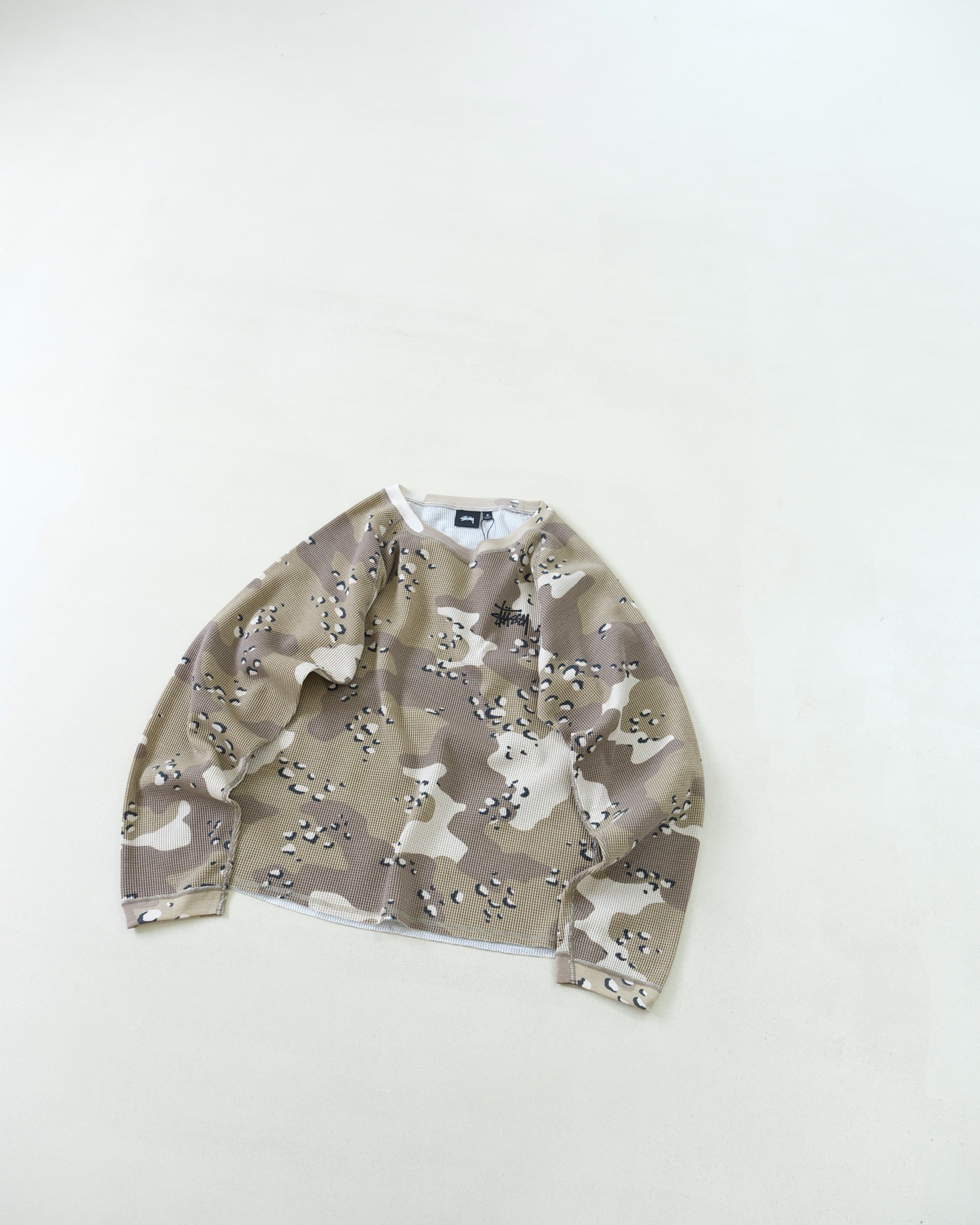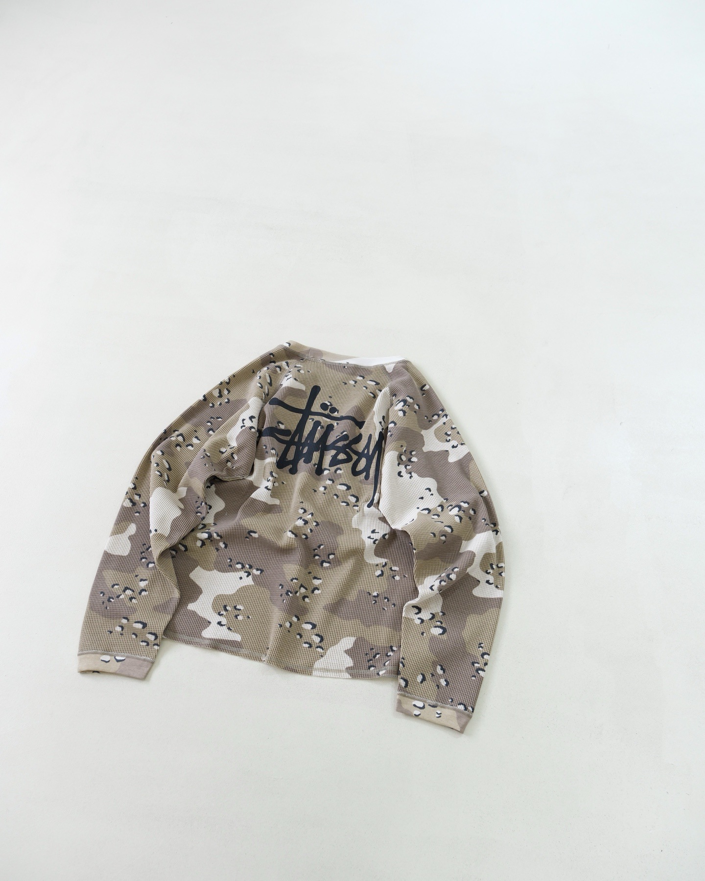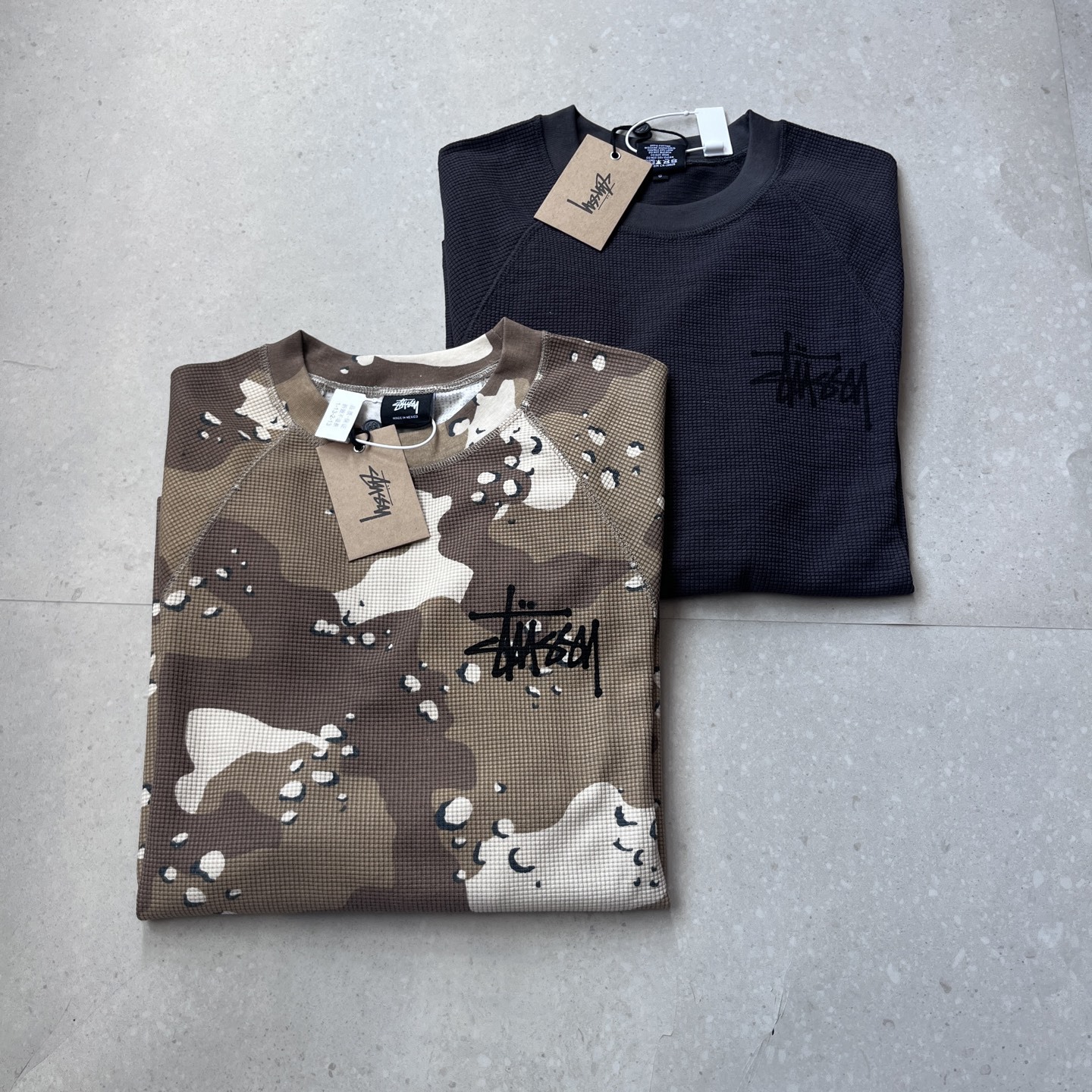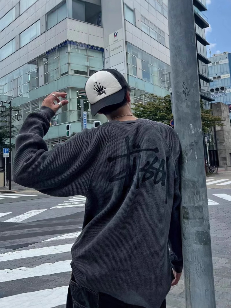 국경 간 고품질 STU 위장 와플 헐렁한 커플 복고풍 툴링 둥근 목 스웨터 긴팔 티셔츠베이스 셔츠