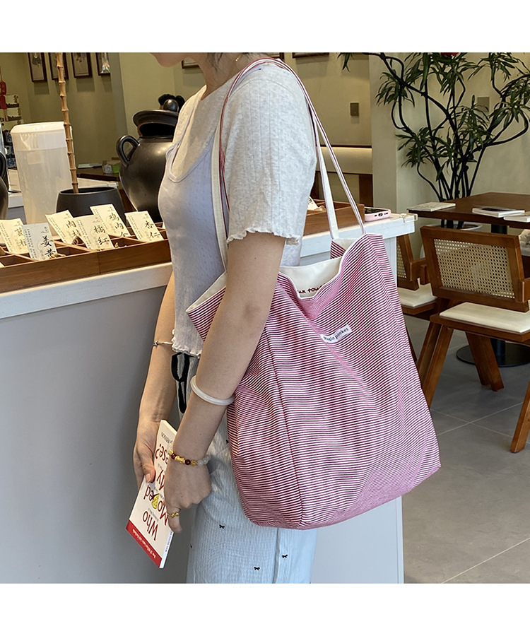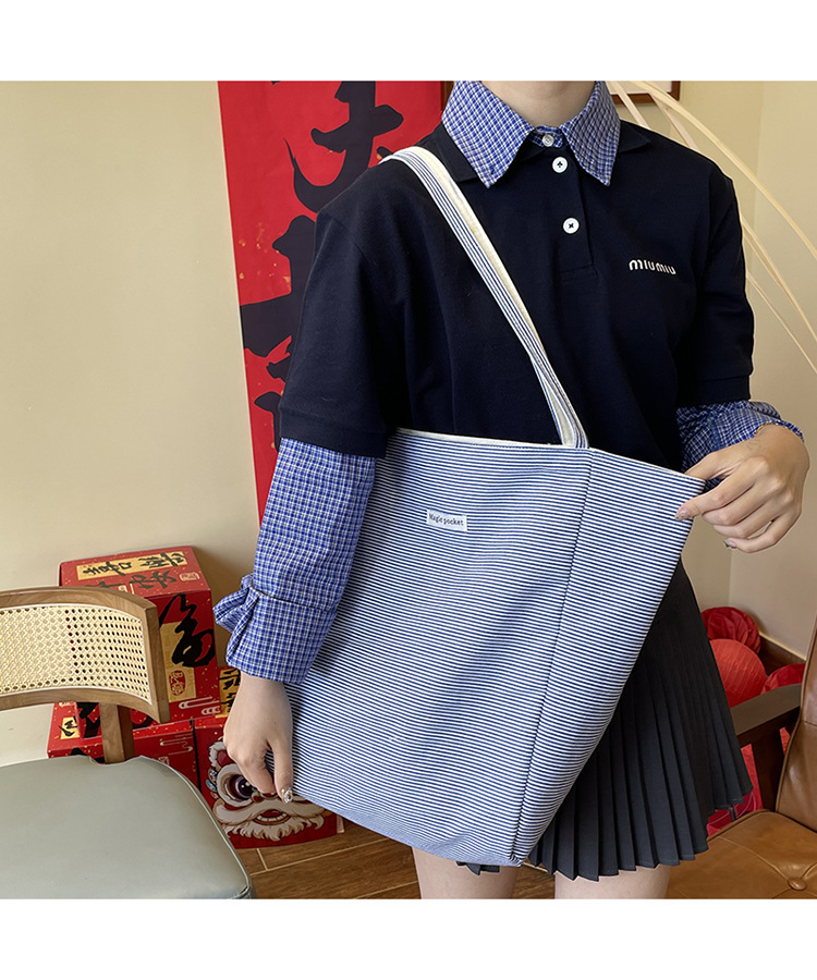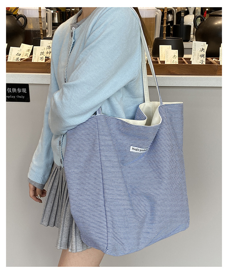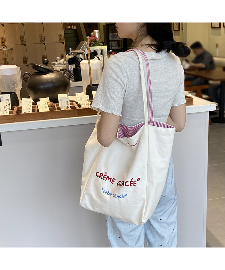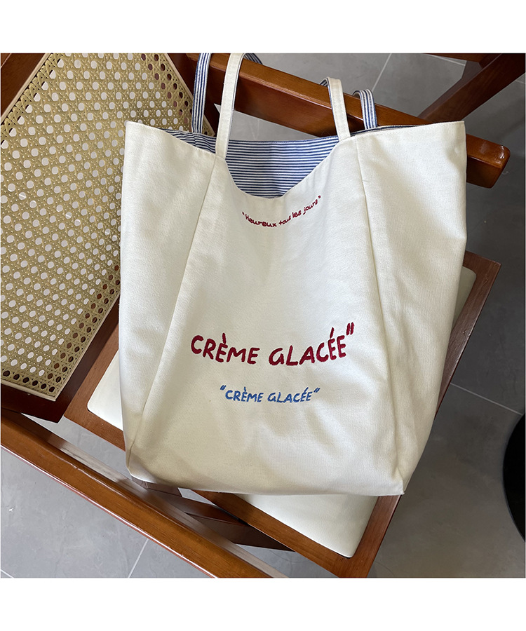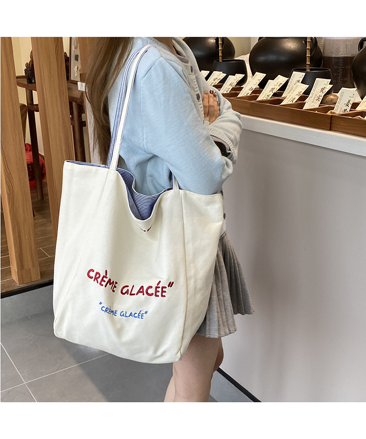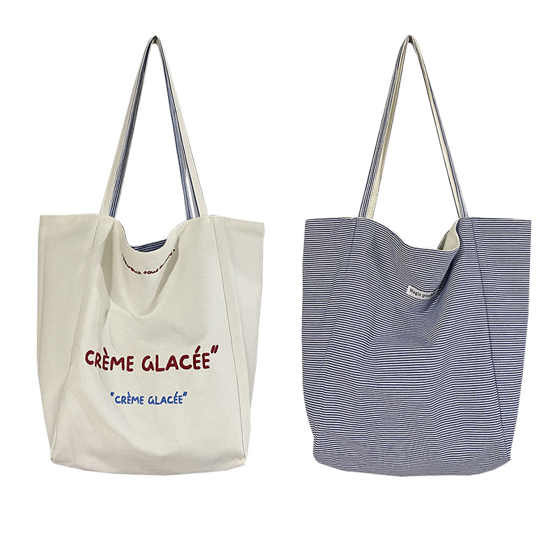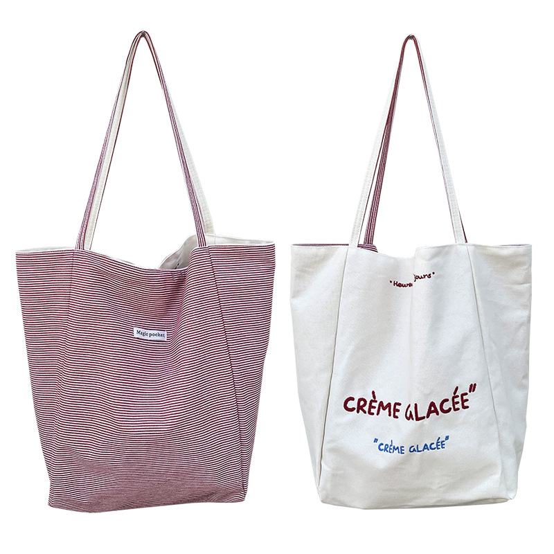 새로운 스타일 긍정적이고 반전 된 양면 줄무늬 어깨 가방 대용량 토트 백 고급 질감 자수 학생 캔버스 백스토어 가기