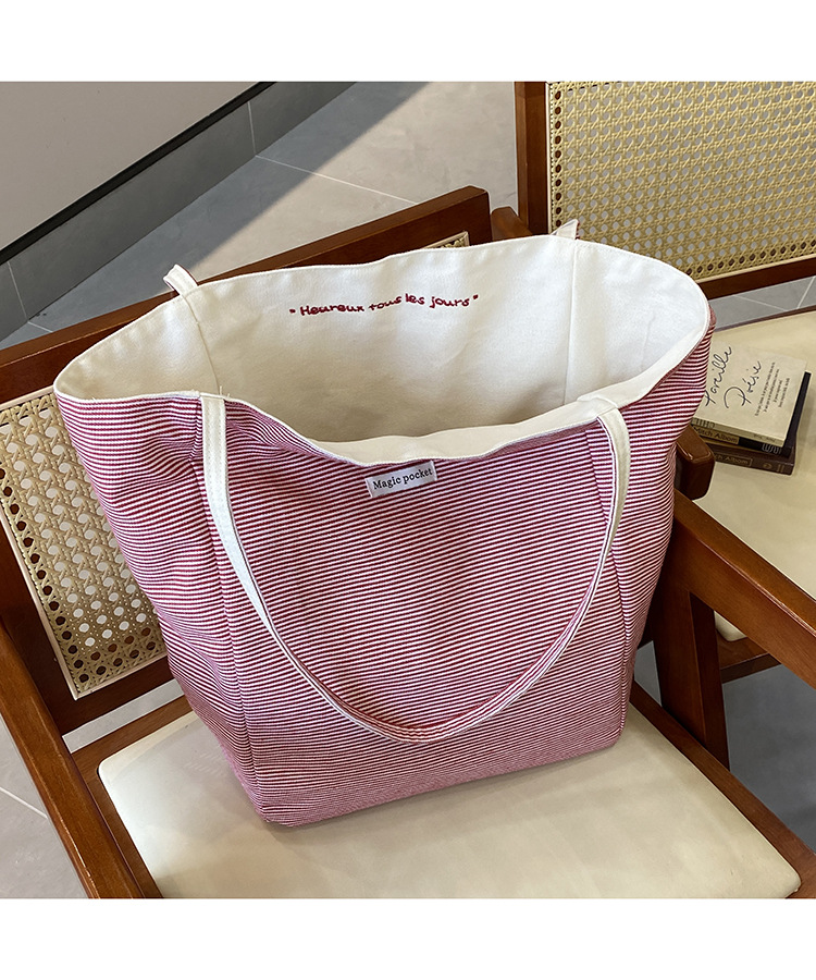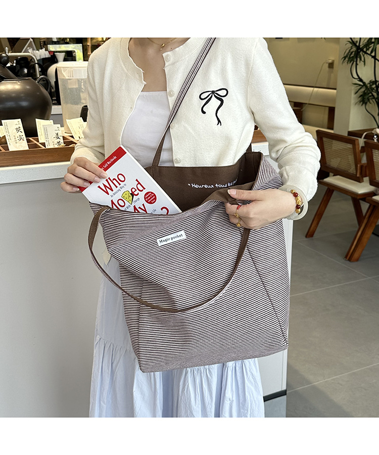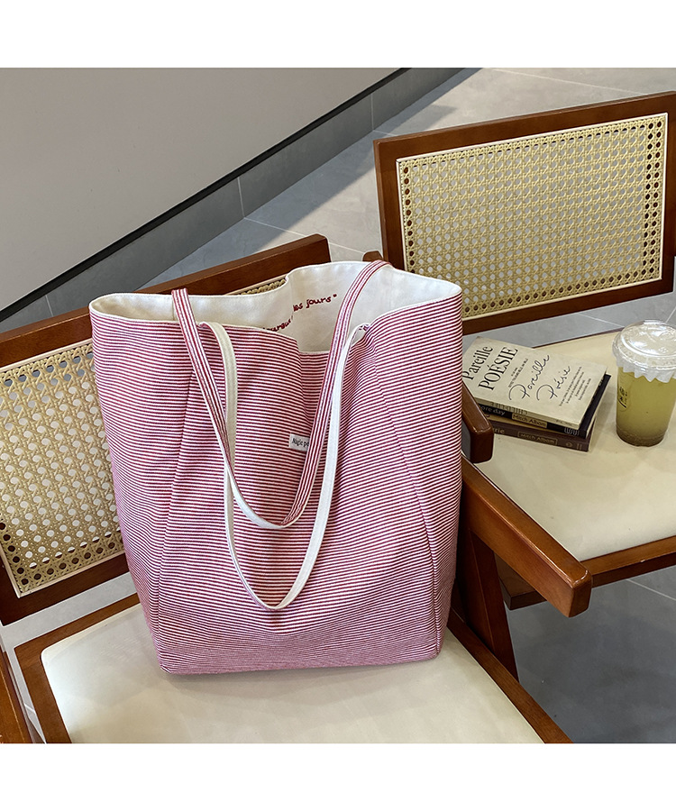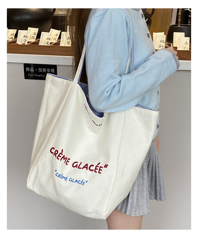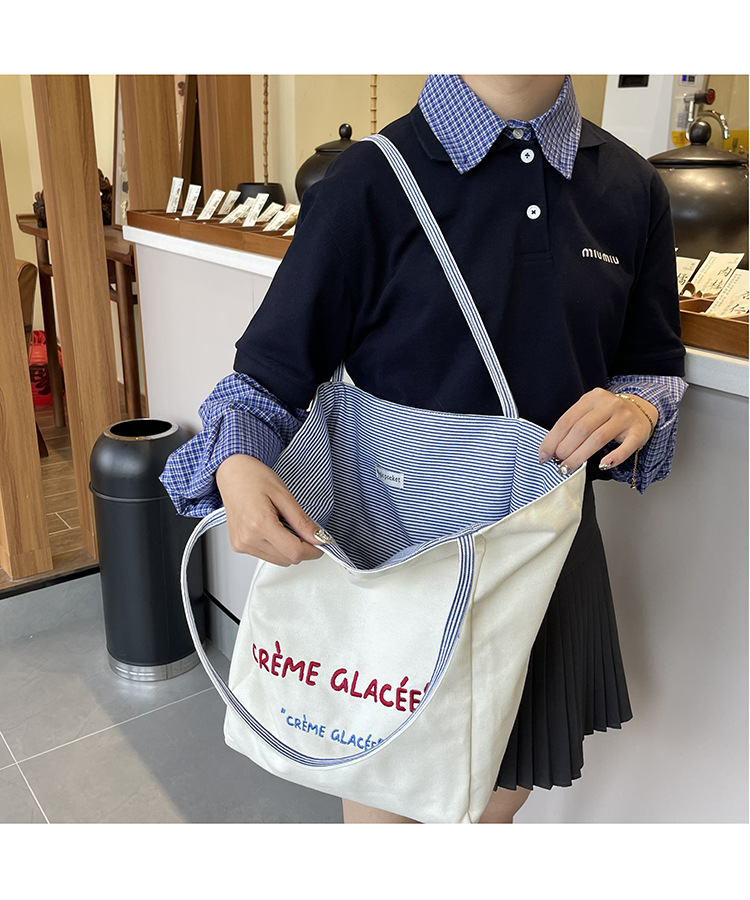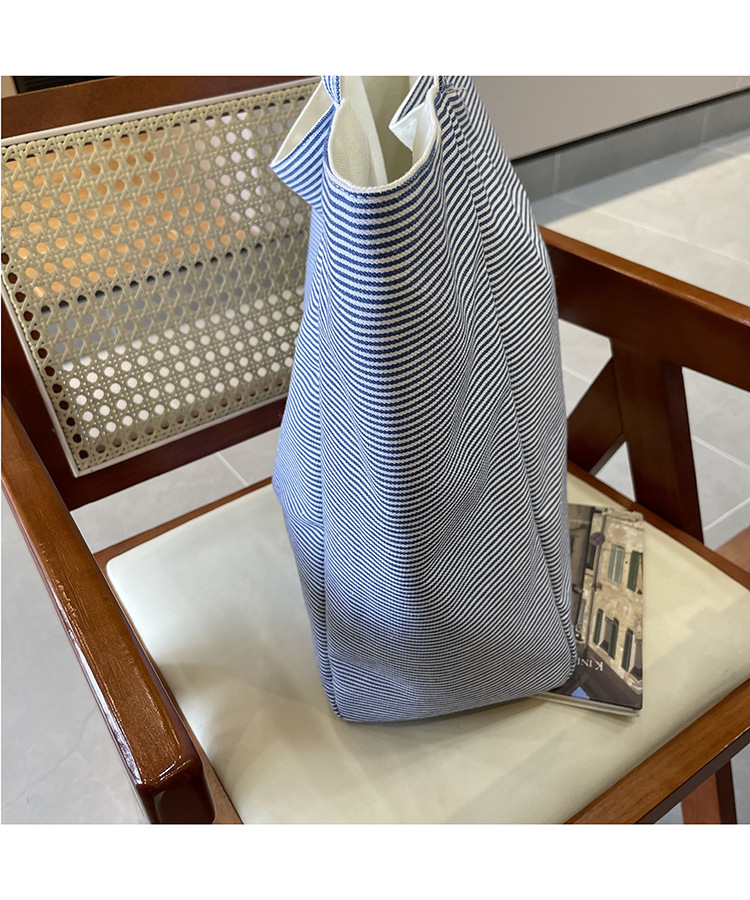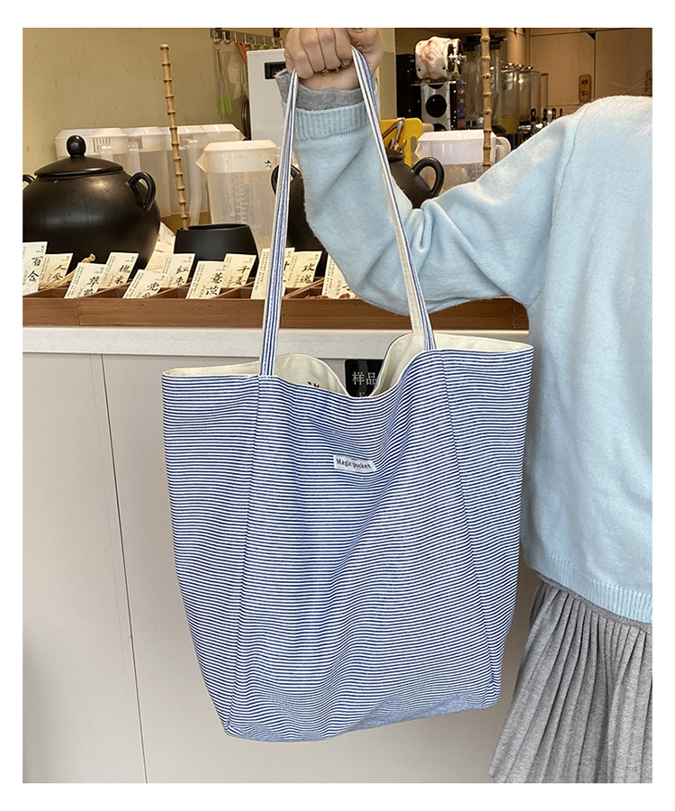 새로운 스타일 긍정적이고 반전 된 양면 줄무늬 어깨 가방 대용량 토트 백 고급 질감 자수 학생 캔버스 백스토어 가기