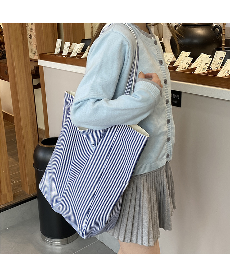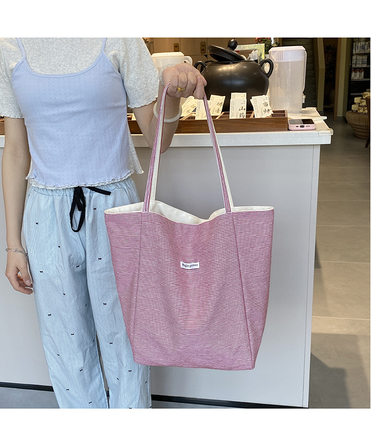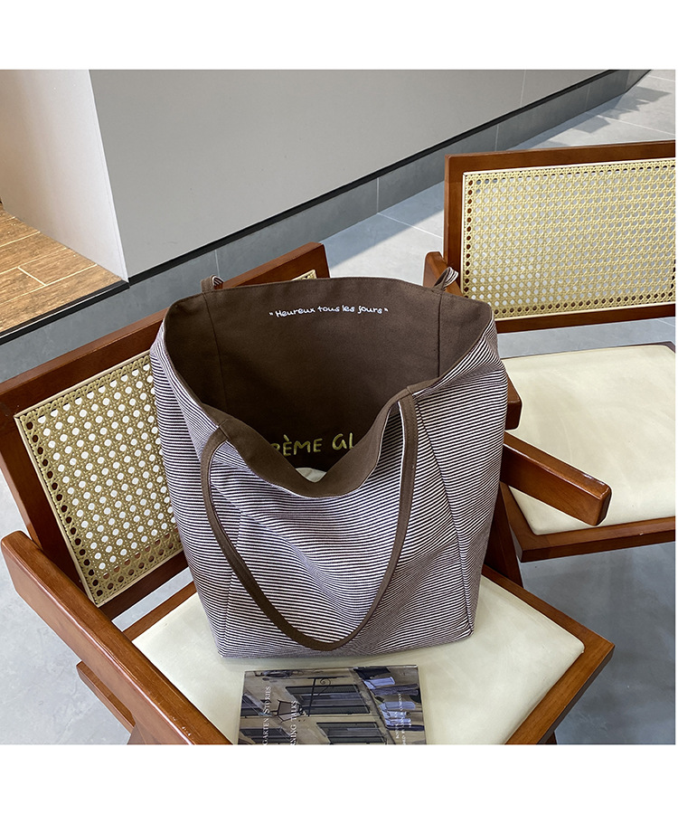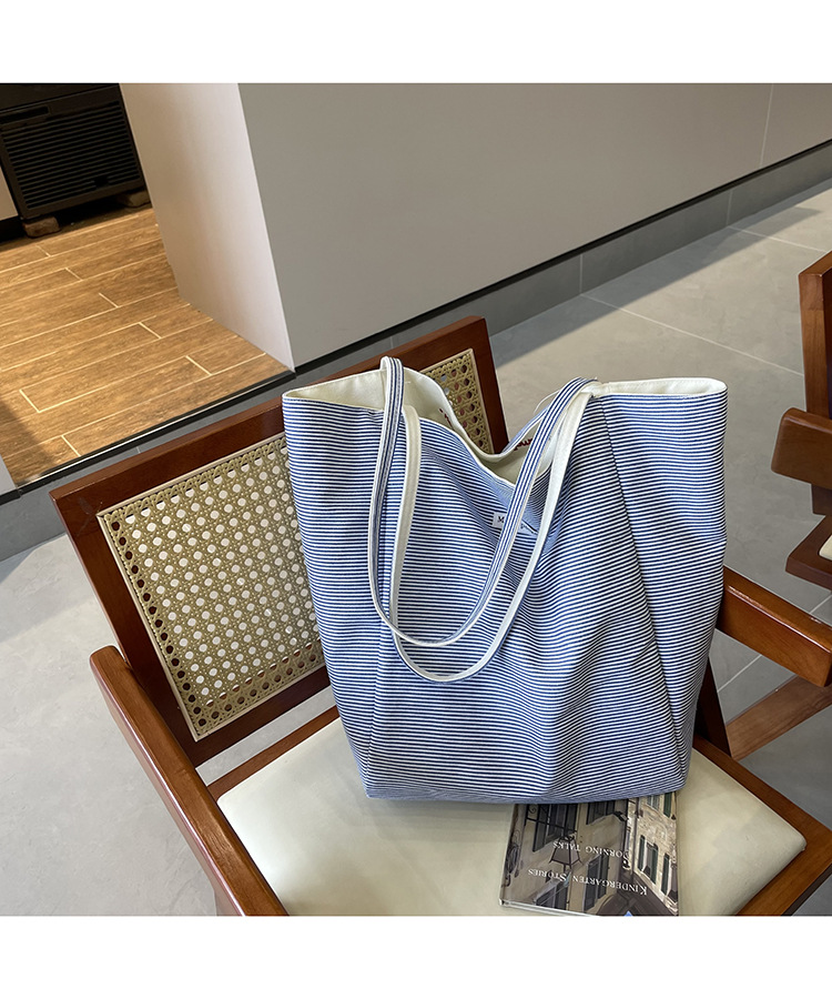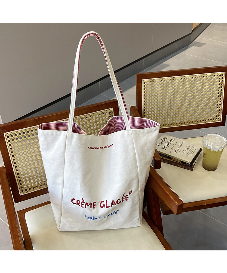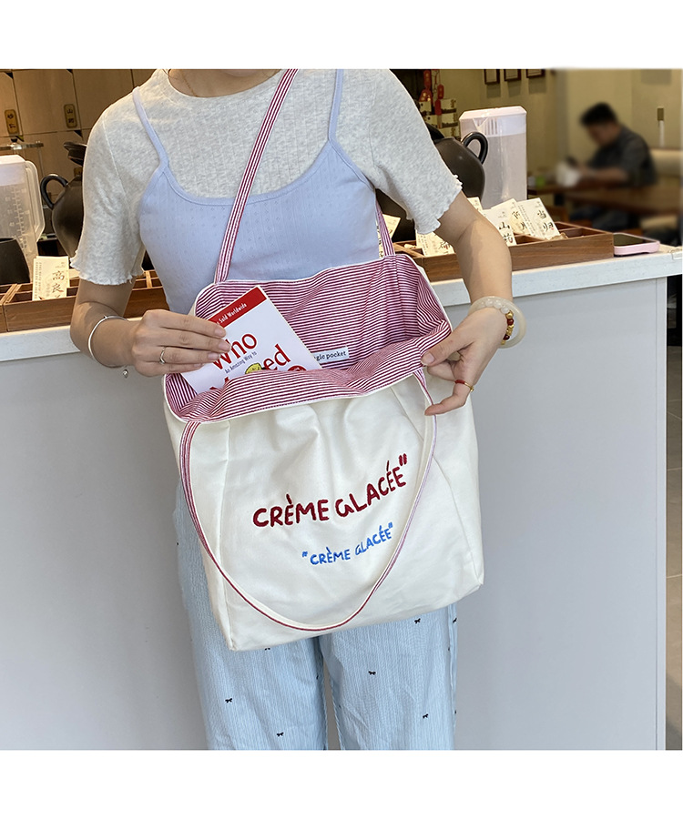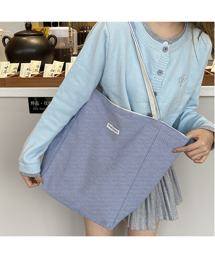 새로운 스타일 긍정적이고 반전 된 양면 줄무늬 어깨 가방 대용량 토트 백 고급 질감 자수 학생 캔버스 백스토어 가기