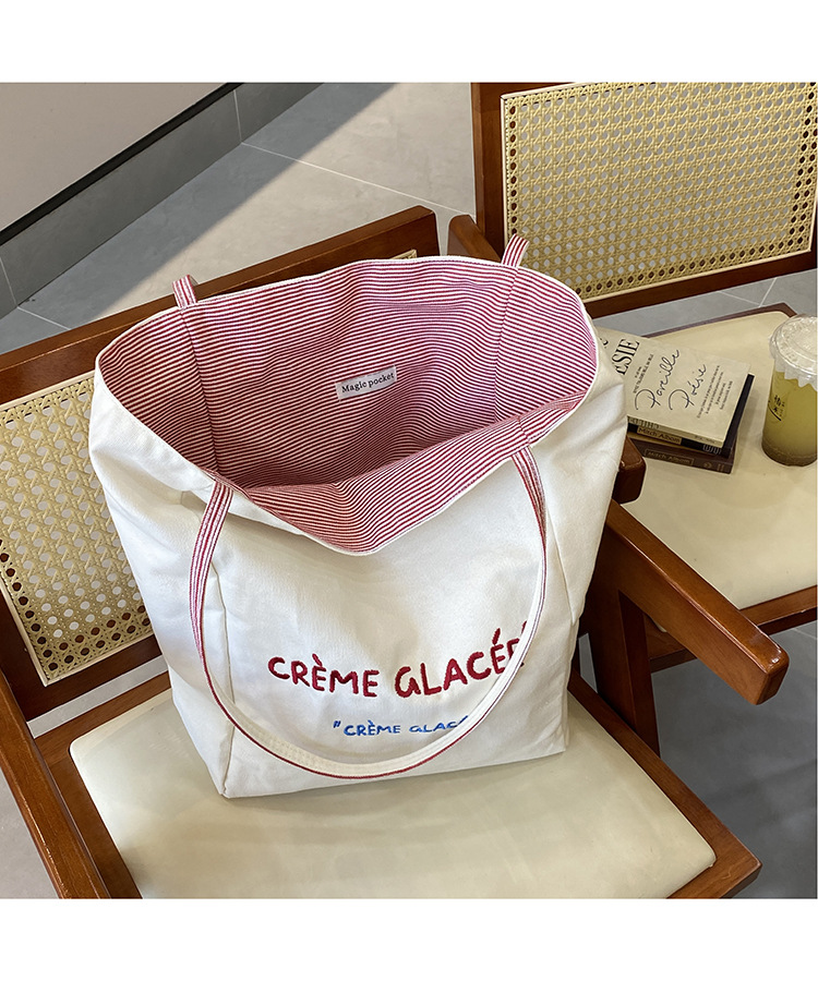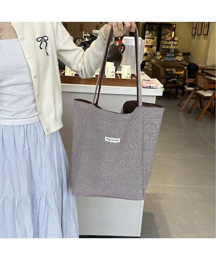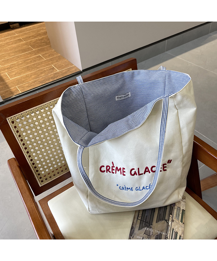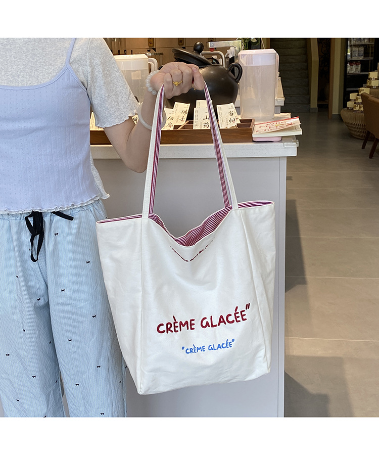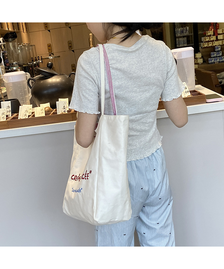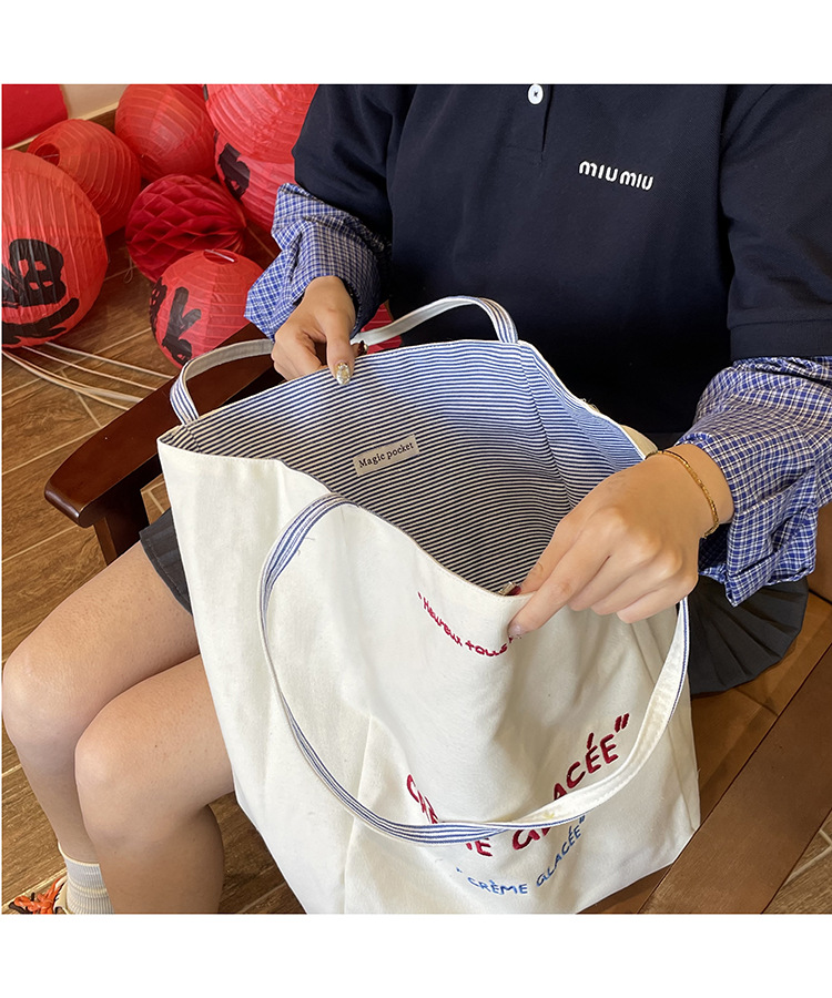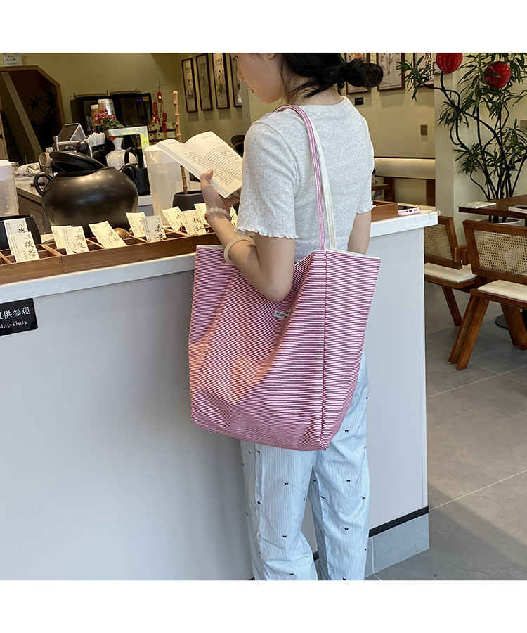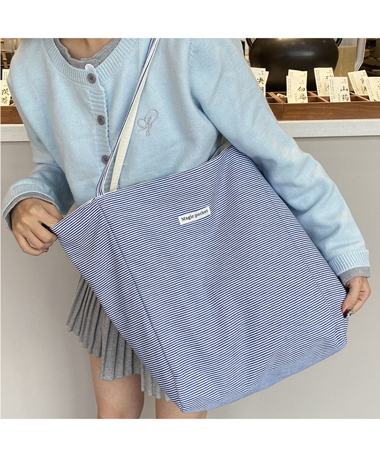 새로운 스타일 긍정적이고 반전 된 양면 줄무늬 어깨 가방 대용량 토트 백 고급 질감 자수 학생 캔버스 백스토어 가기