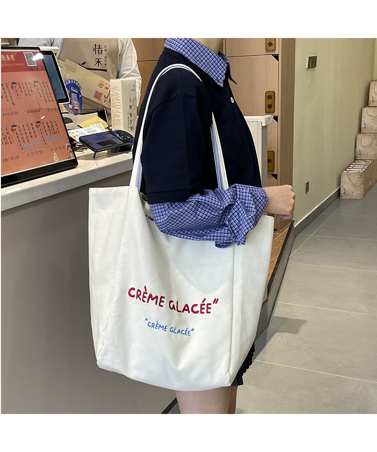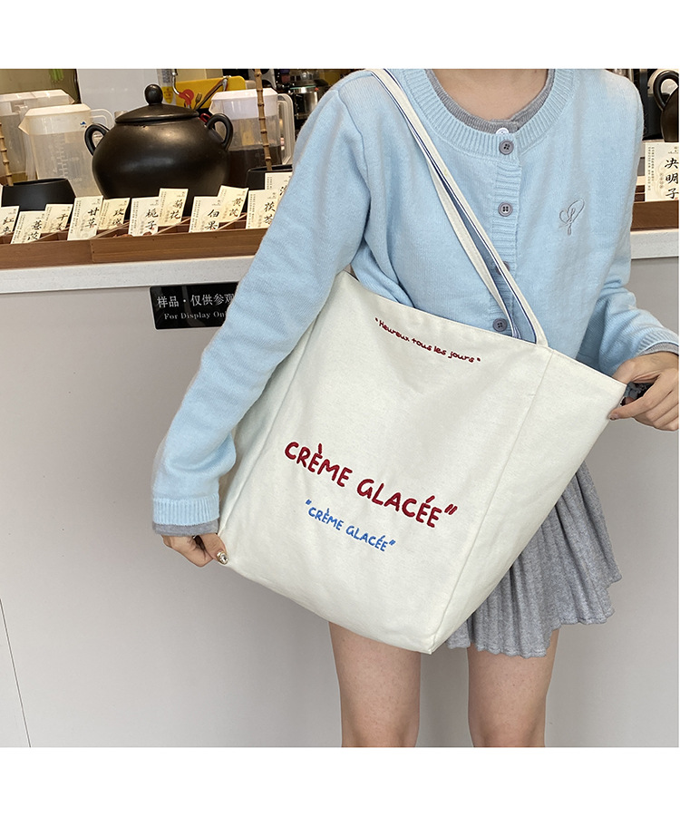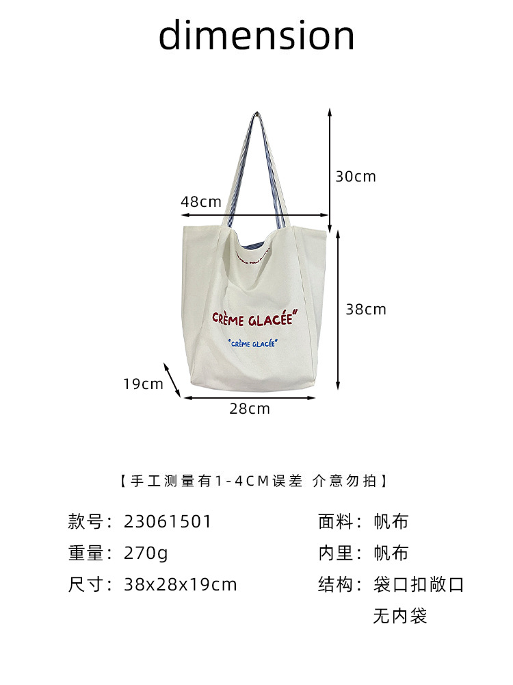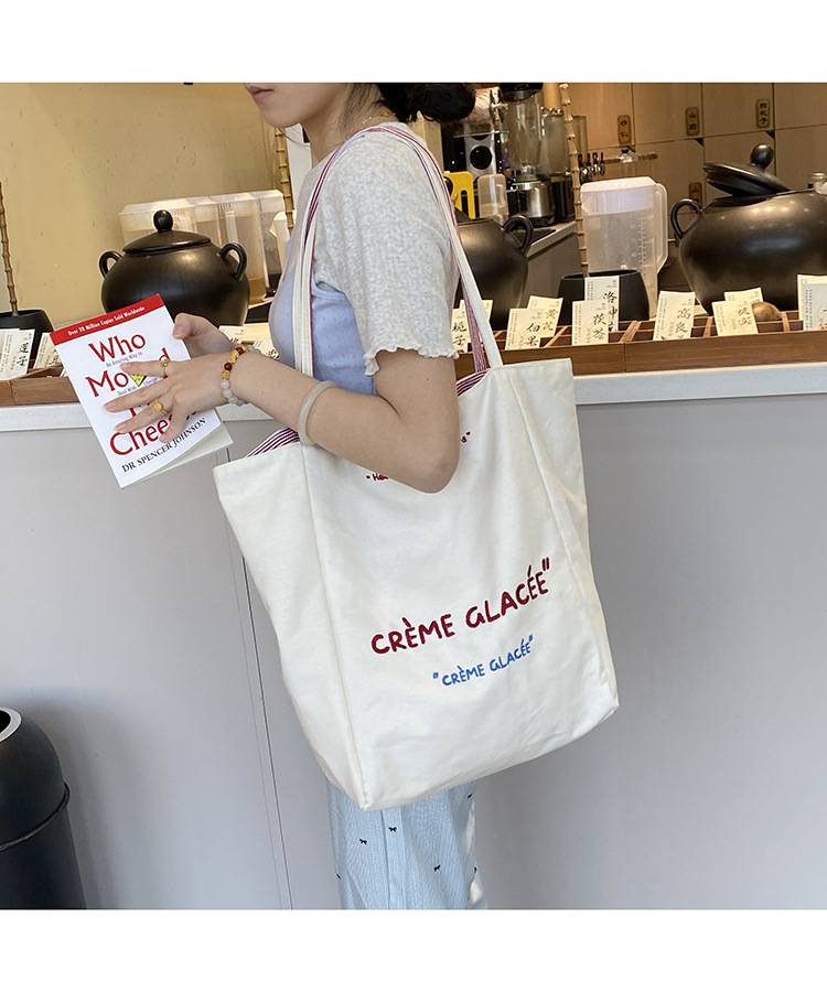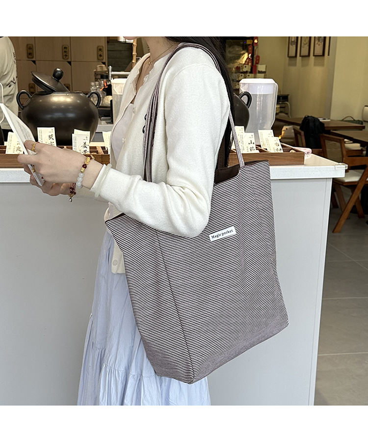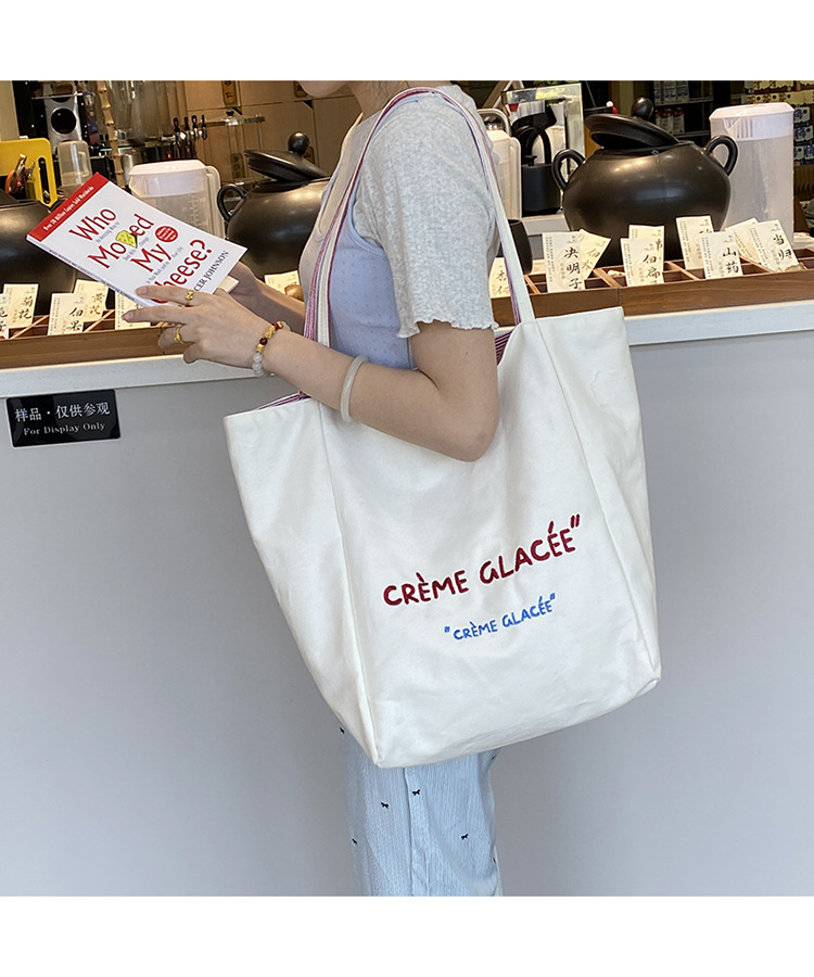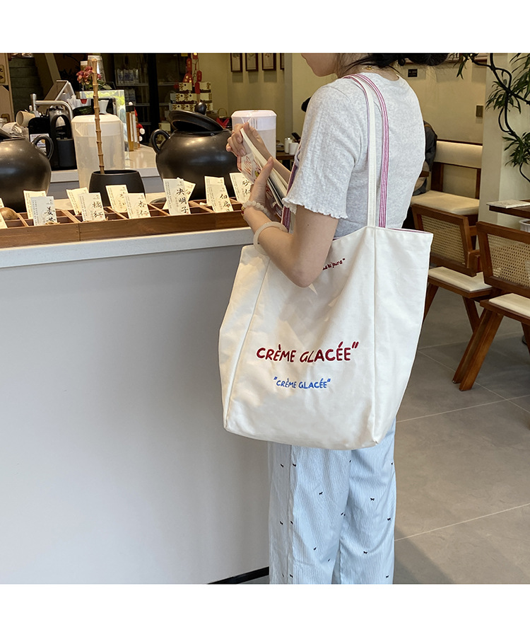 새로운 스타일 긍정적이고 반전 된 양면 줄무늬 어깨 가방 대용량 토트 백 고급 질감 자수 학생 캔버스 백스토어 가기