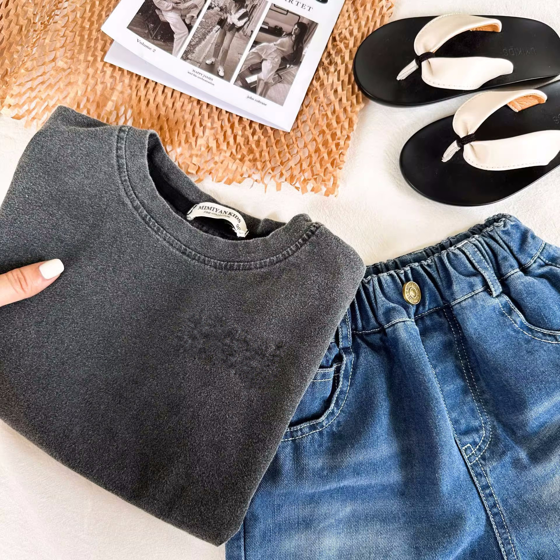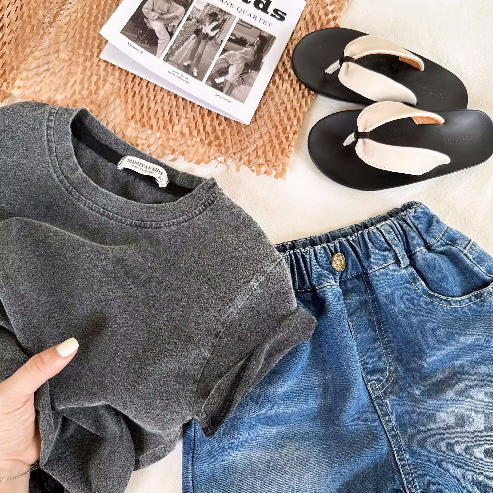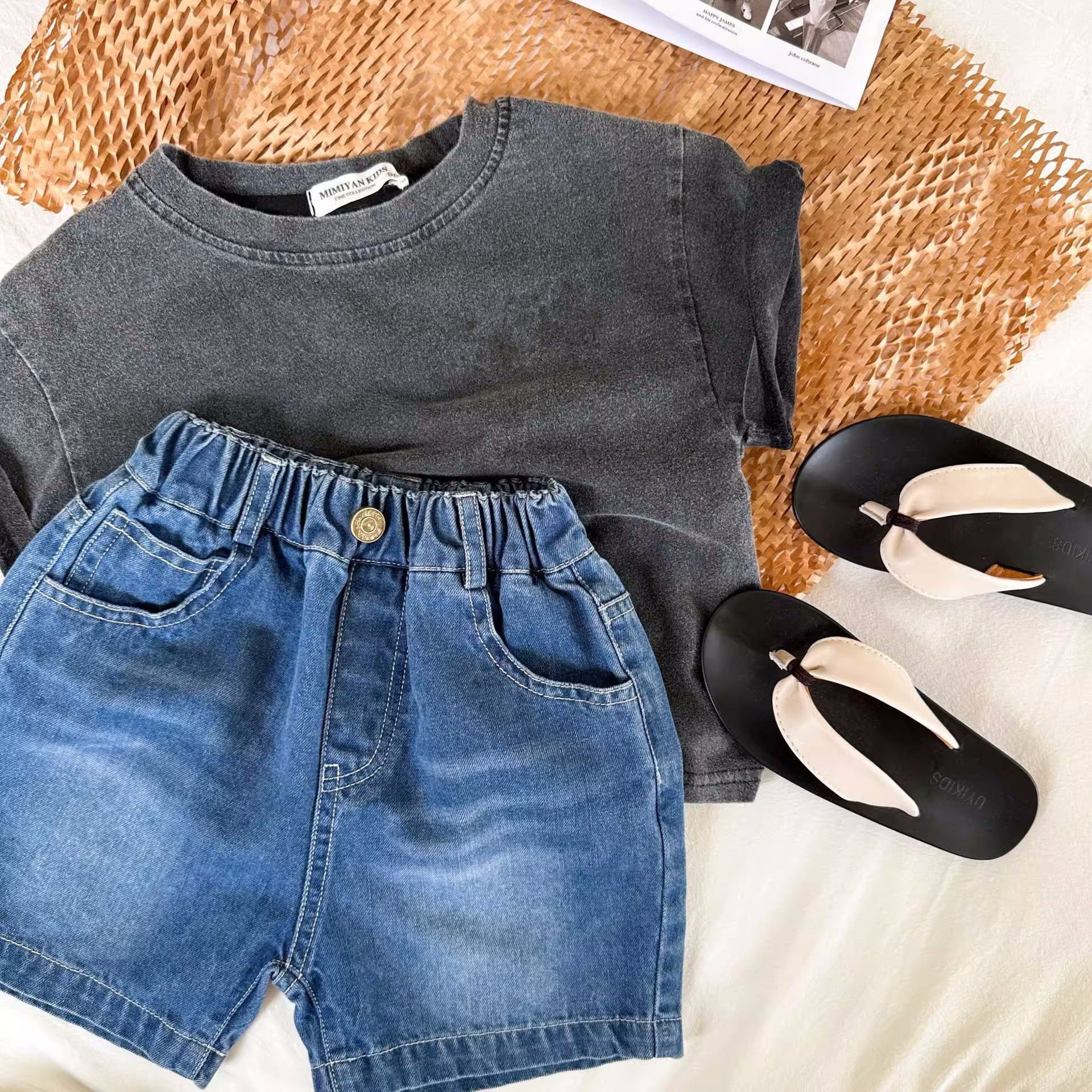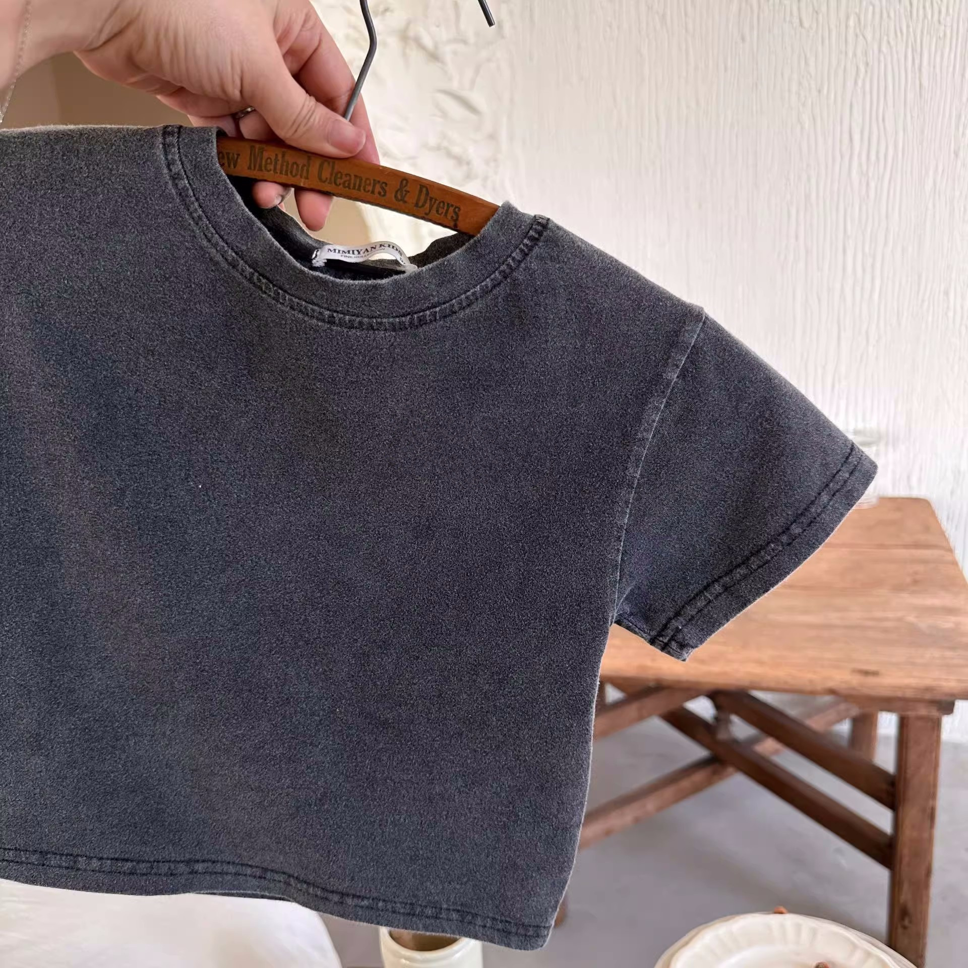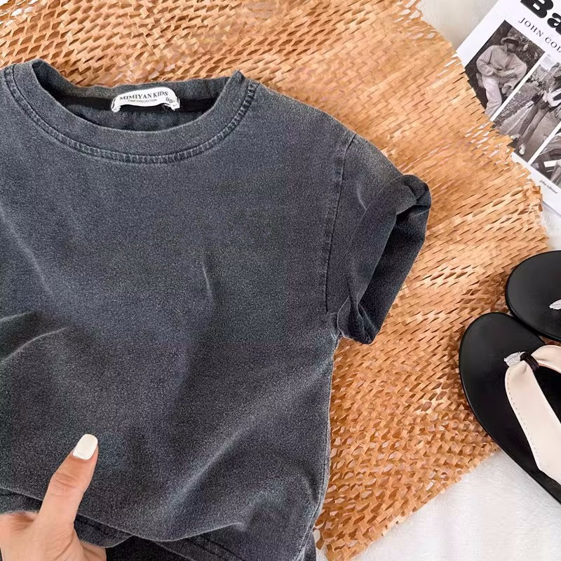 중소 규모의 유아면 세탁 오래된 검은 반팔 티셔츠 여름 얇은 소년 소녀 패션 단색 재킷 도매스토어 가기