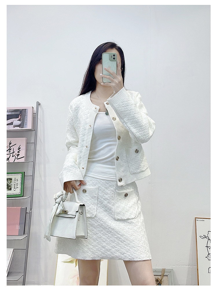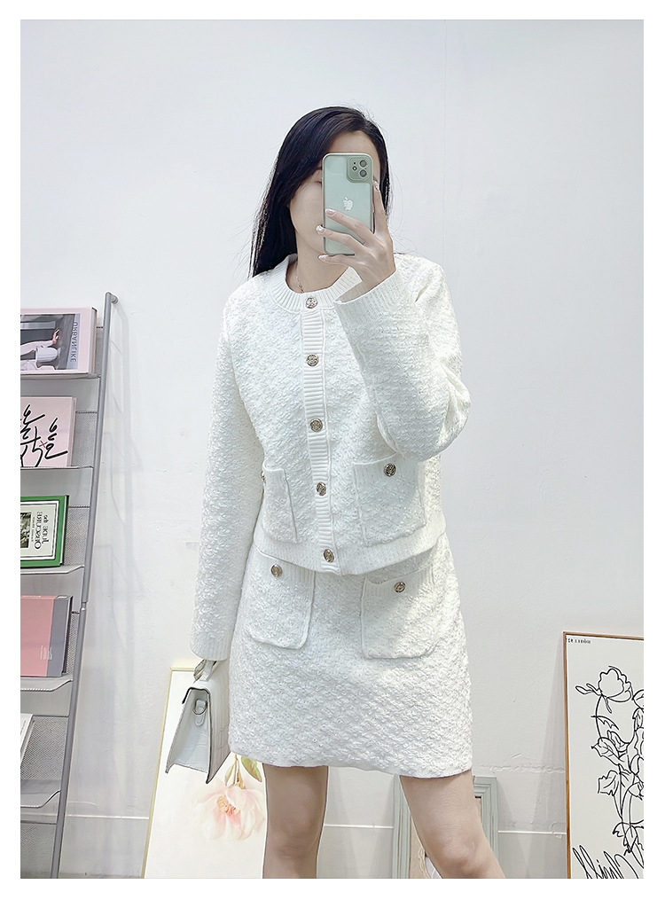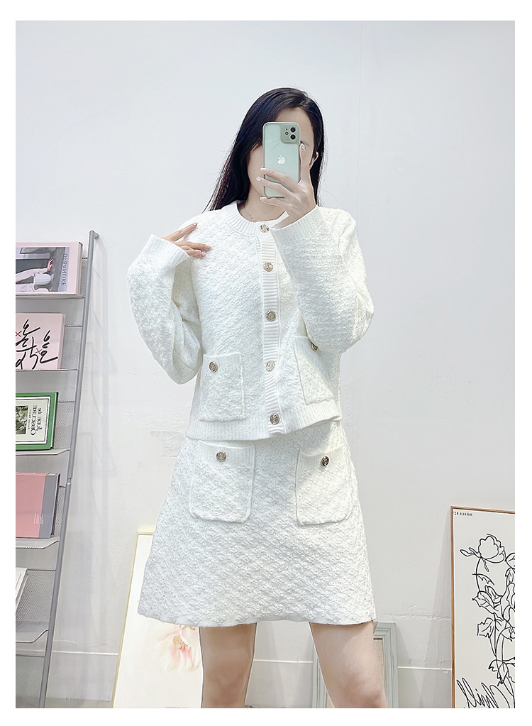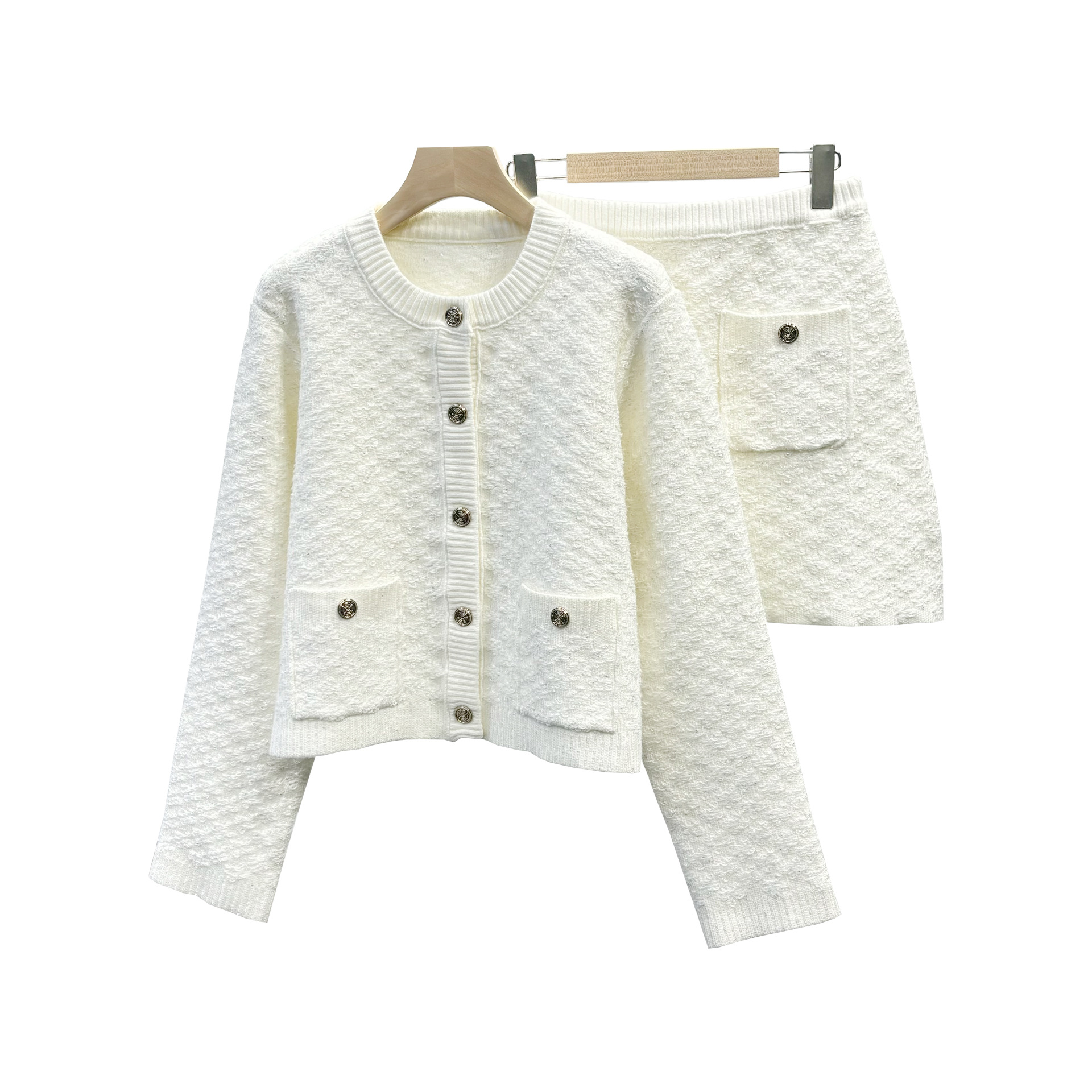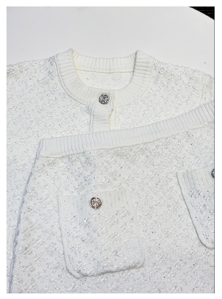 M의 새로운 프랑스 스타일 여성복 상의, 스팽글 라운드넥 긴팔 니트 가디건 + 샤넬 스타일 투피스 스커트 세트