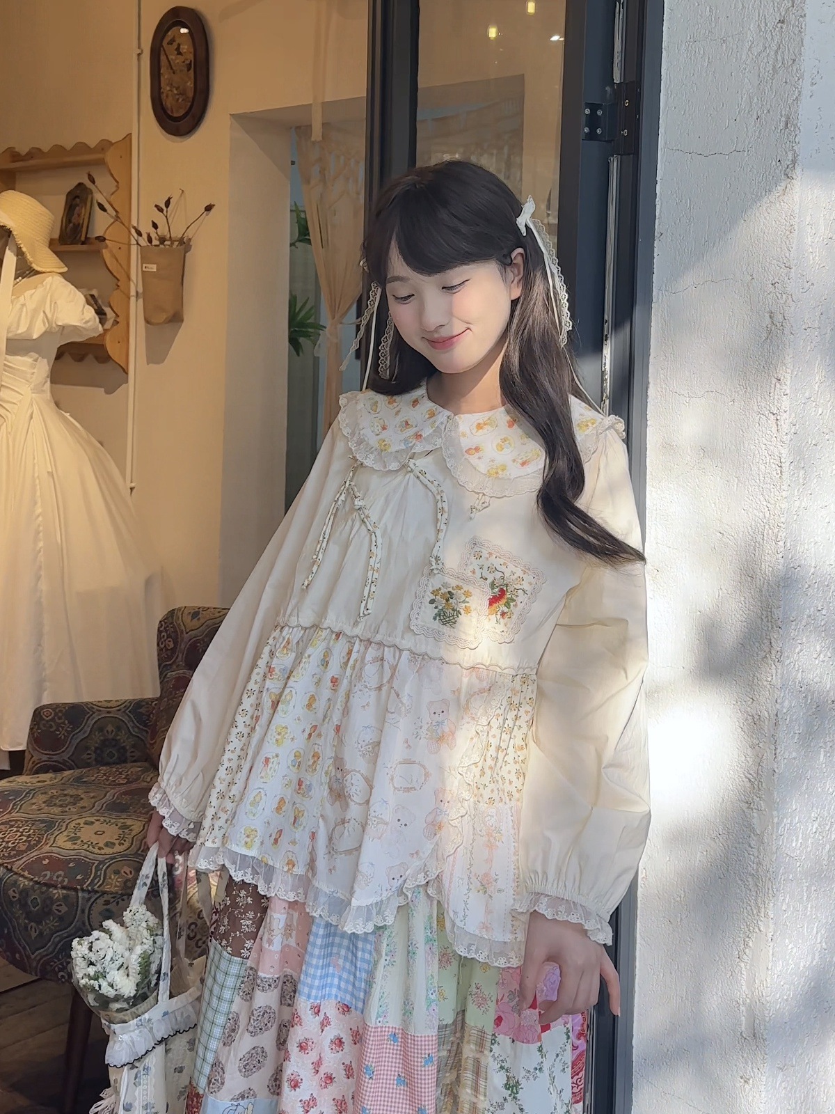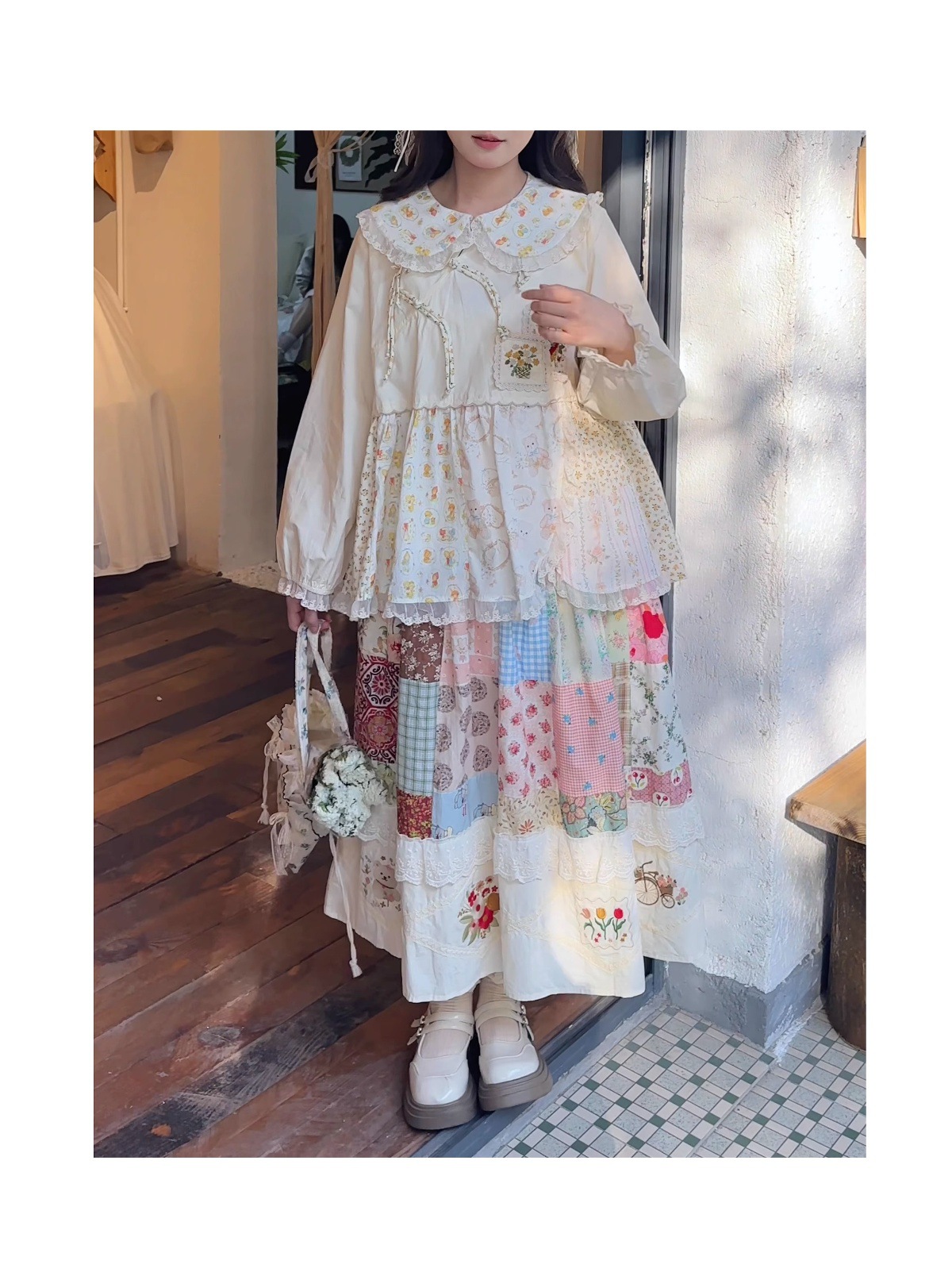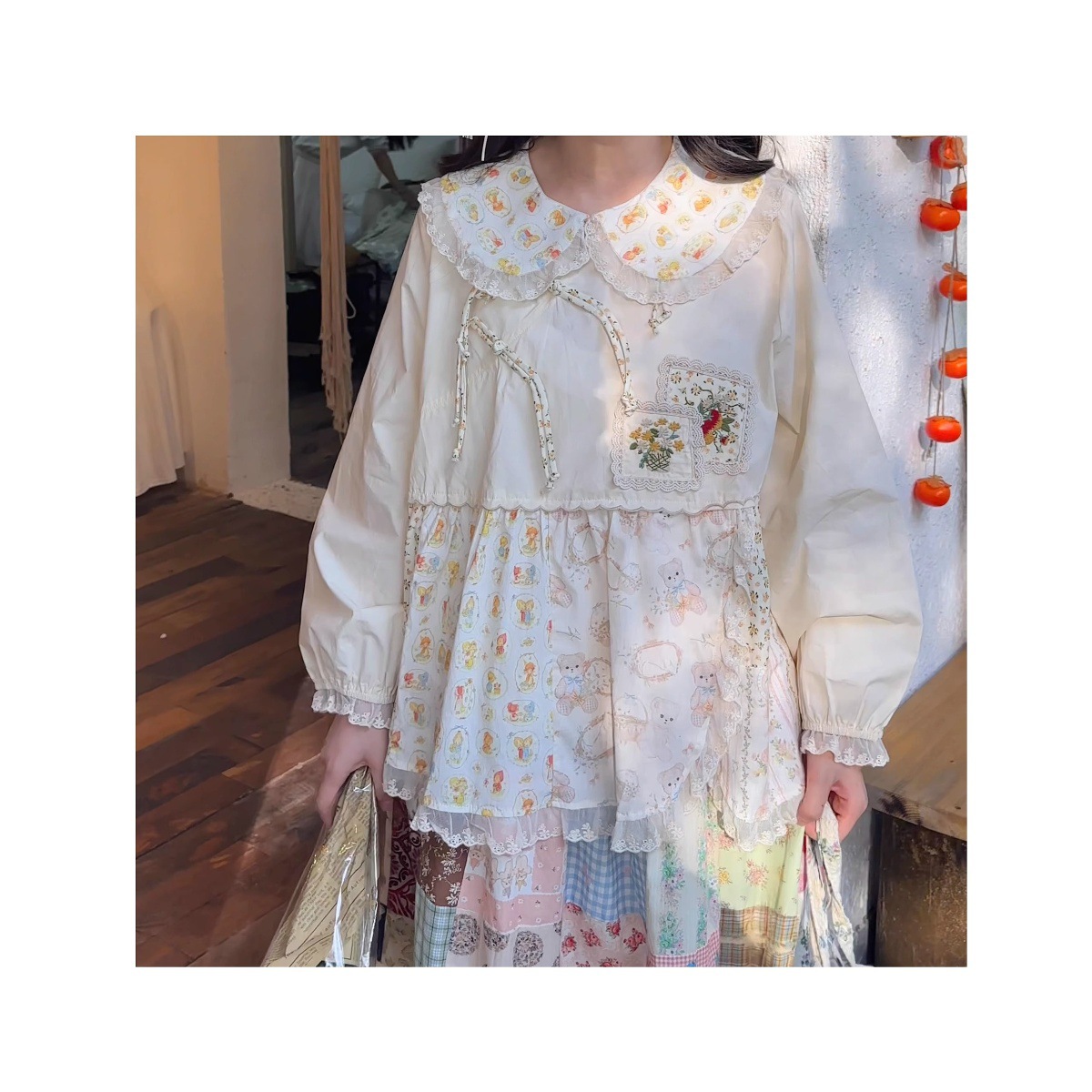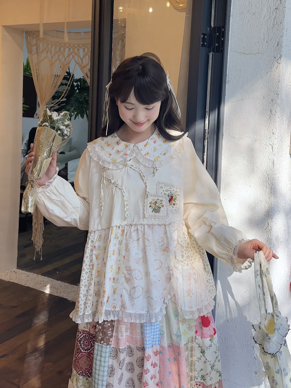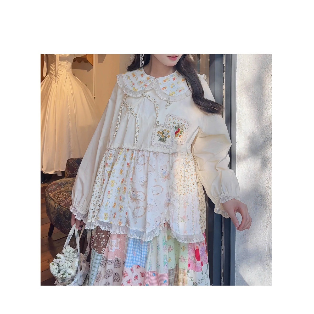 예술적 레트로 느슨한 인형 칼라 소녀의 꽃 패치 워크 레이스 긴 소매 셔츠 달콤한 인형 셔츠 탑스토어 가기
