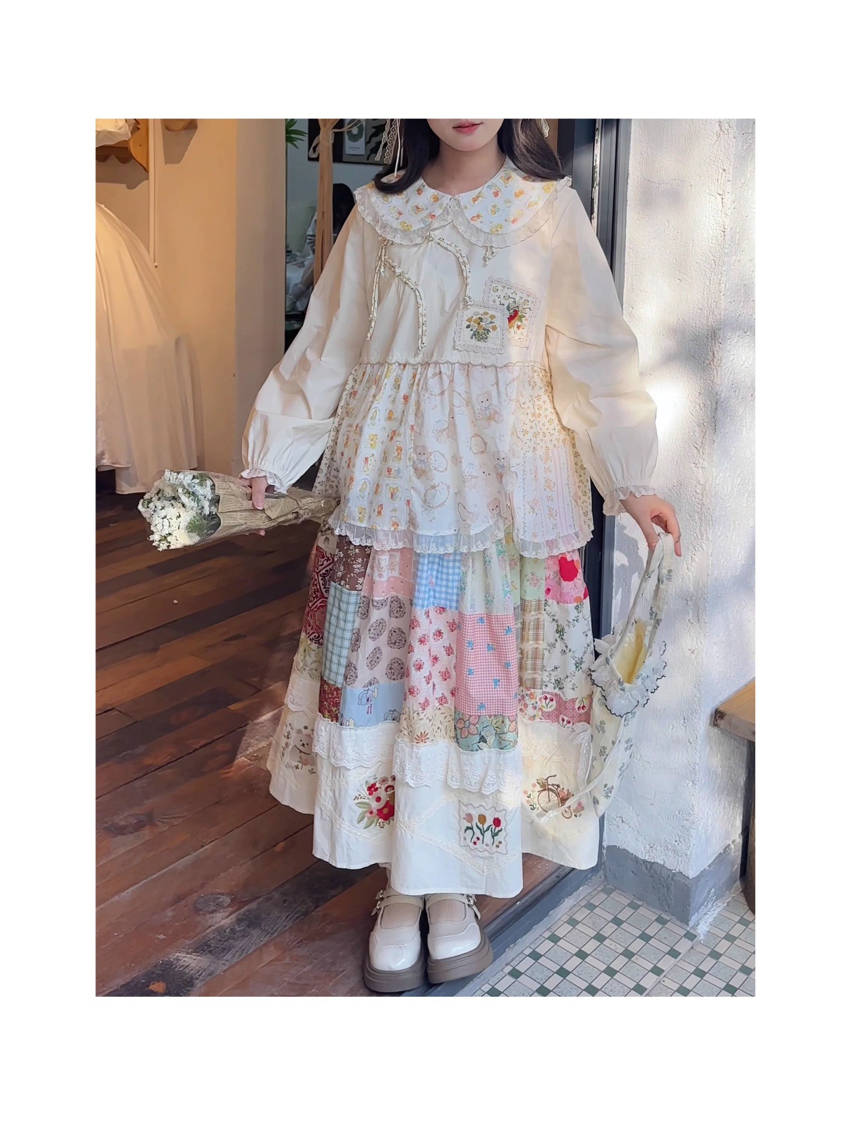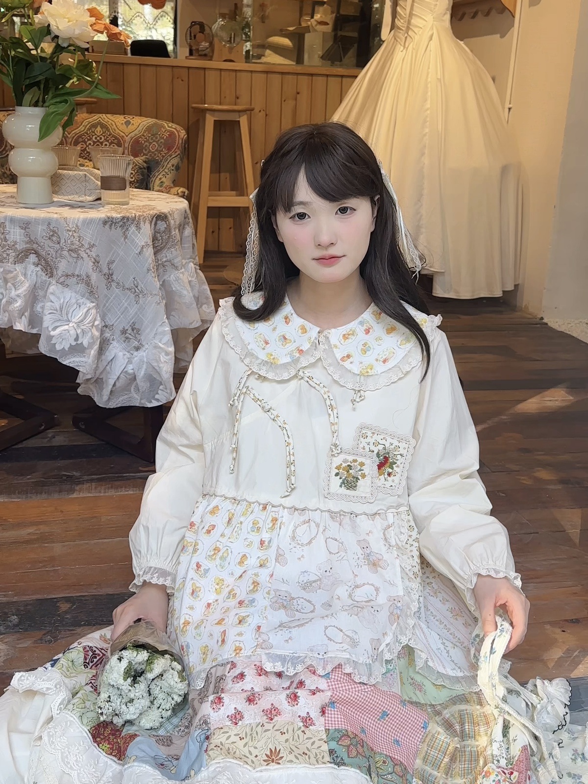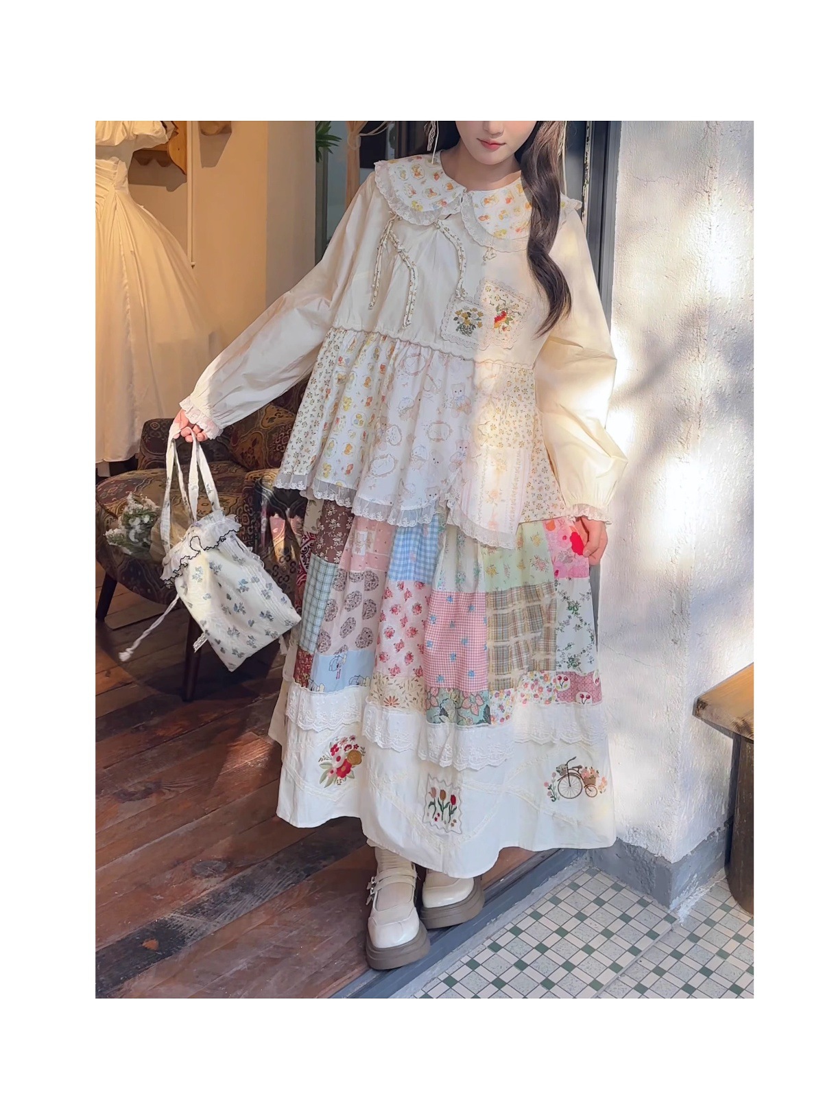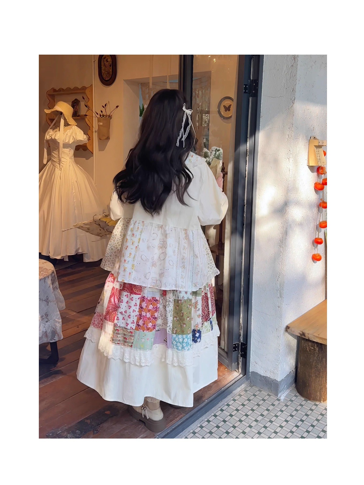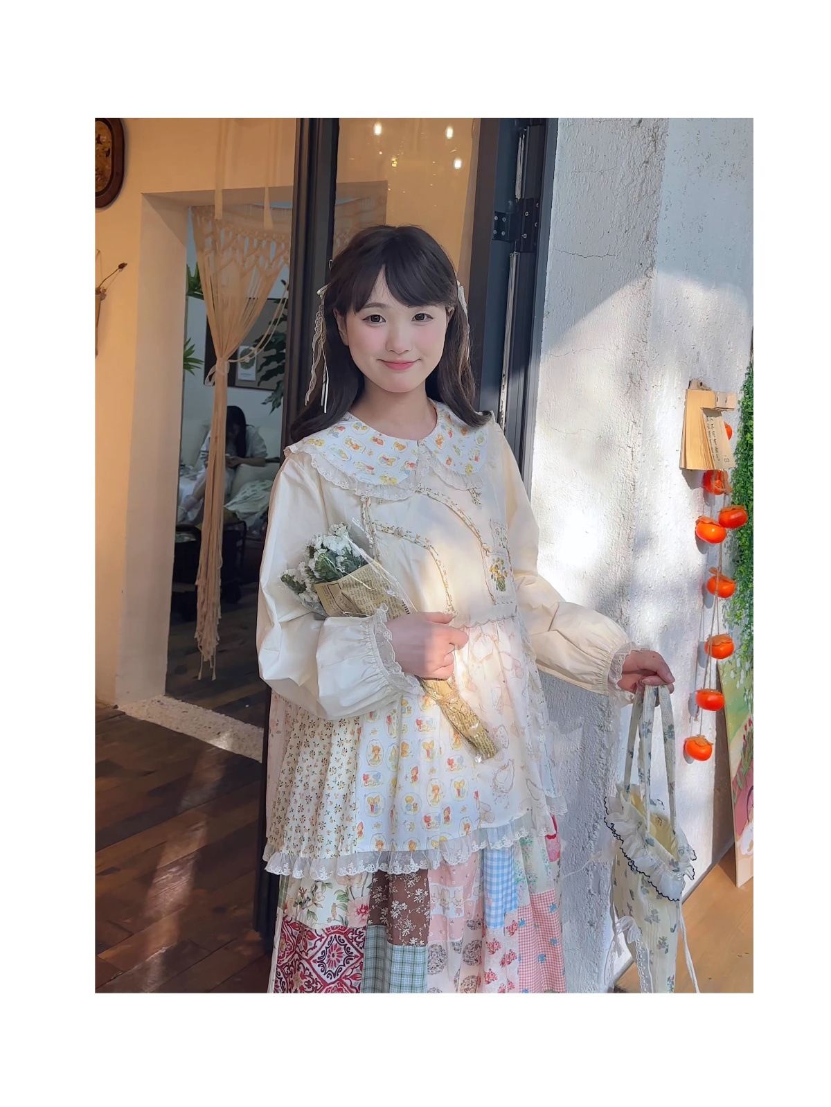 예술적 레트로 느슨한 인형 칼라 소녀의 꽃 패치 워크 레이스 긴 소매 셔츠 달콤한 인형 셔츠 탑스토어 가기