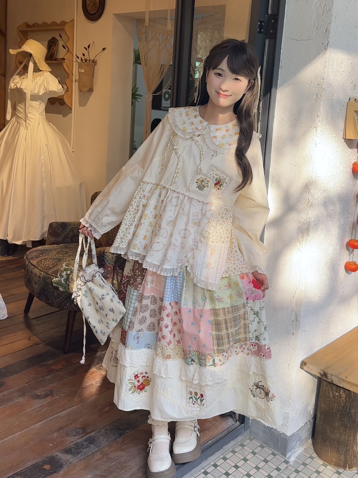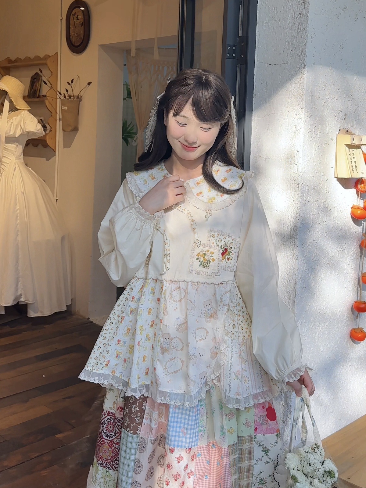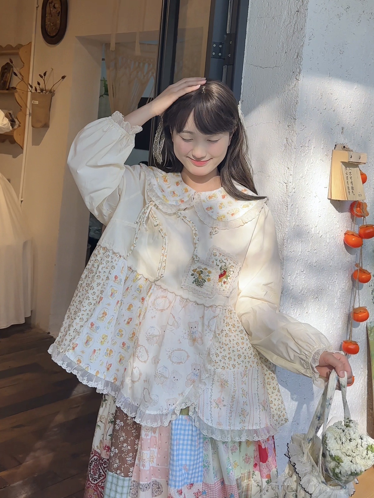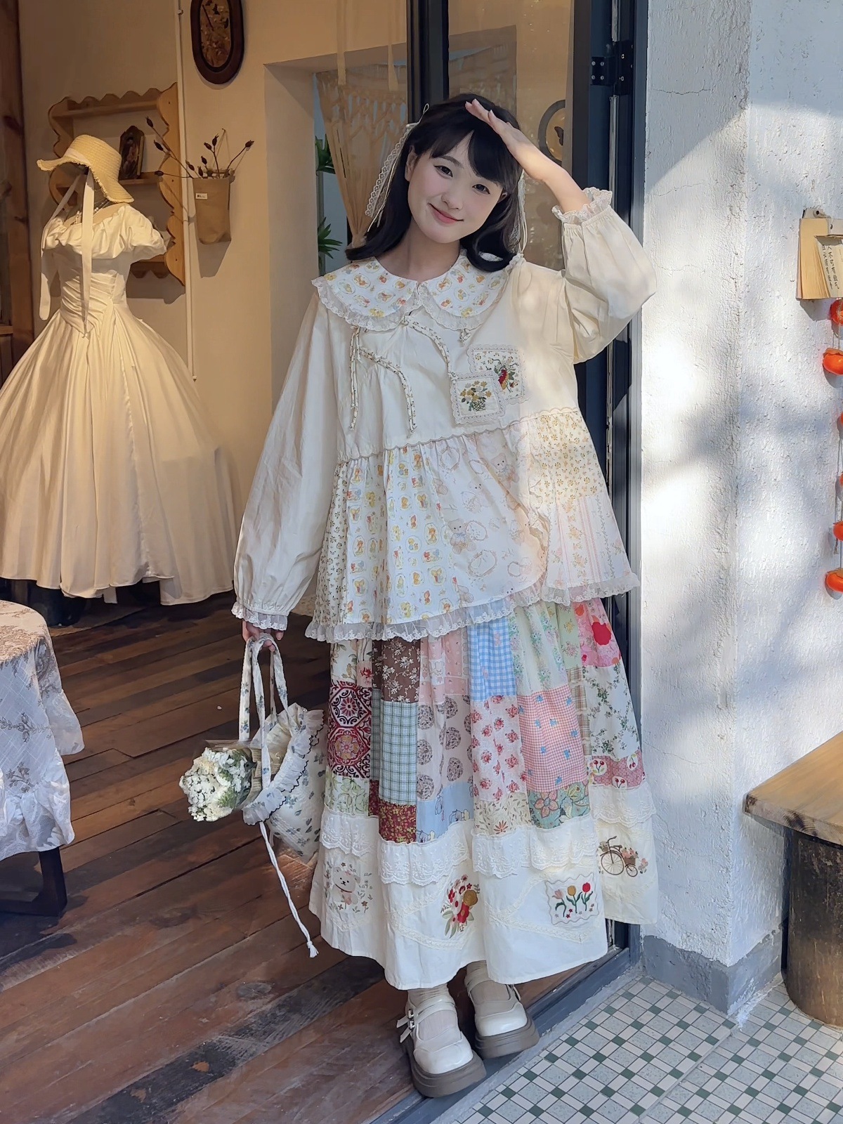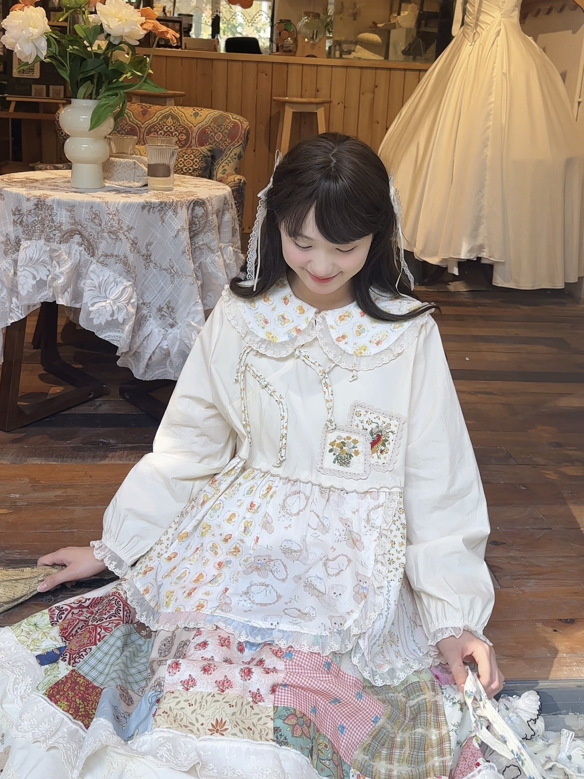 예술적 레트로 느슨한 인형 칼라 소녀의 꽃 패치 워크 레이스 긴 소매 셔츠 달콤한 인형 셔츠 탑스토어 가기