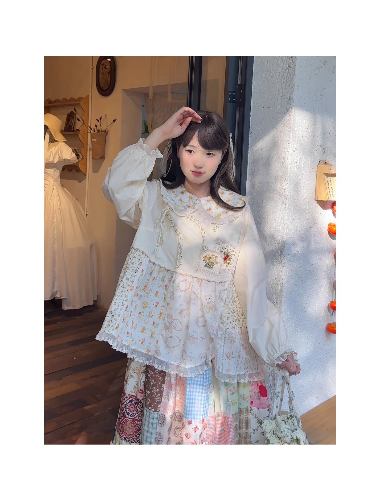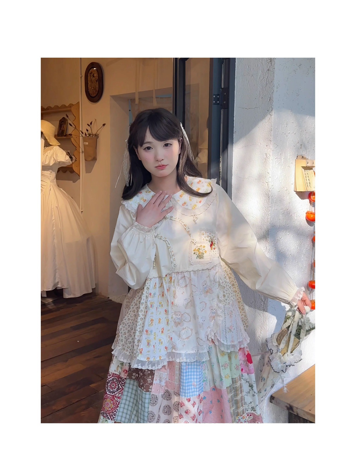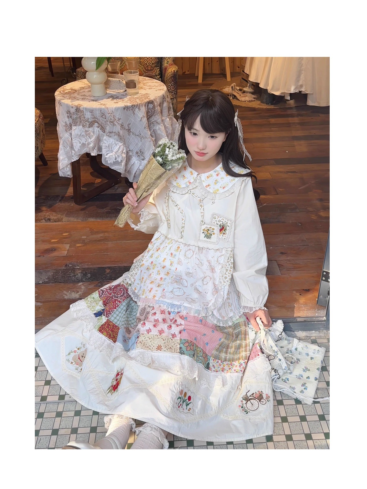예술적 레트로 느슨한 인형 칼라 소녀의 꽃 패치 워크 레이스 긴 소매 셔츠 달콤한 인형 셔츠 탑