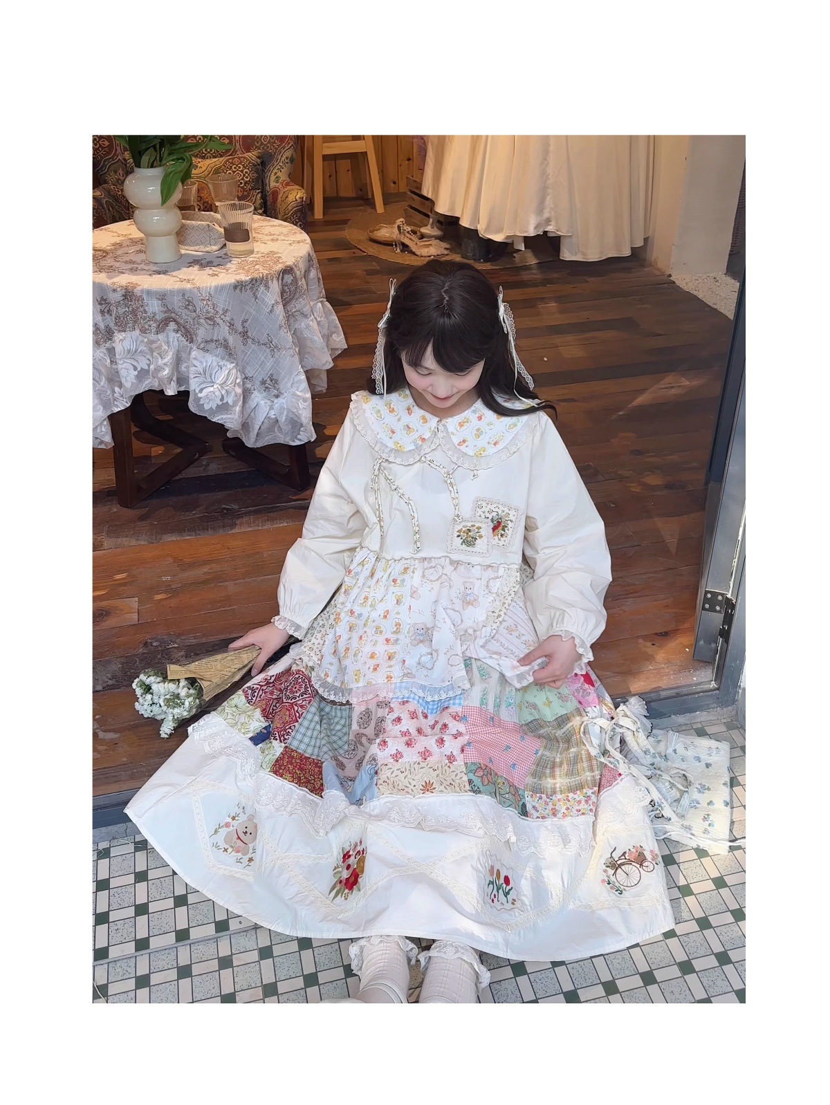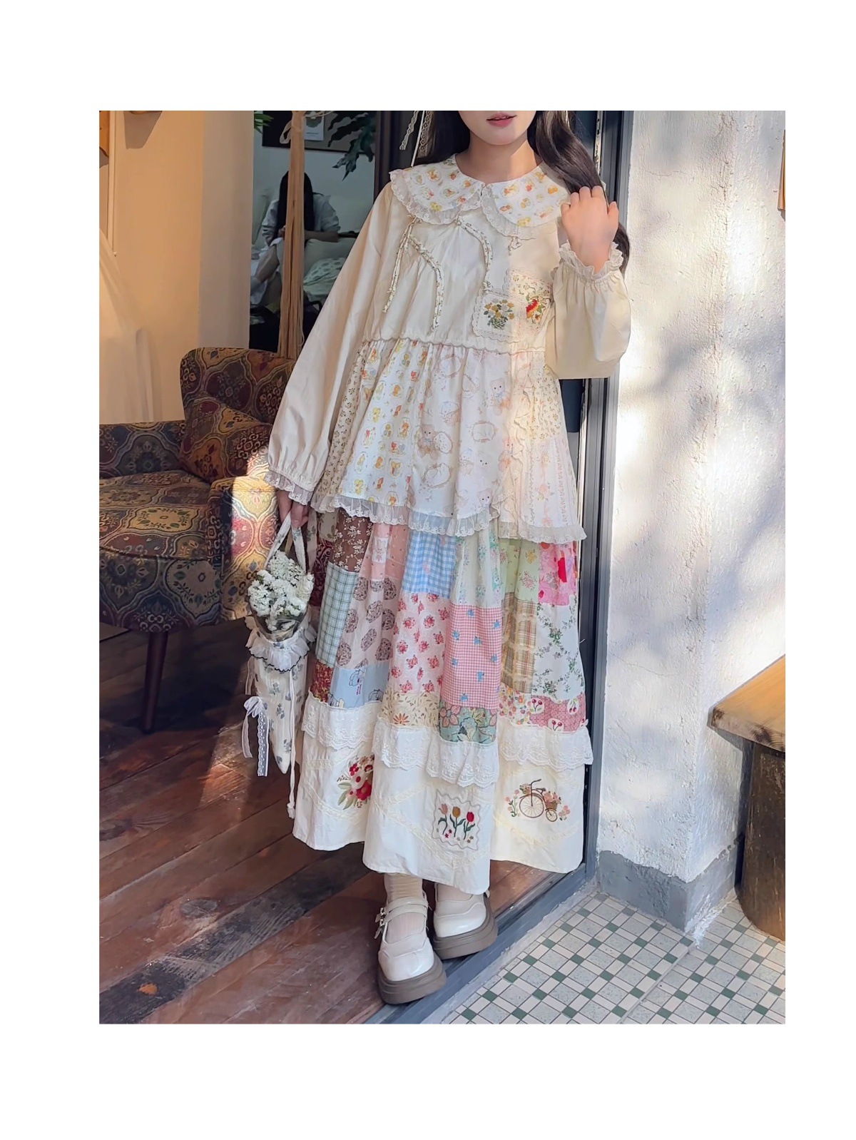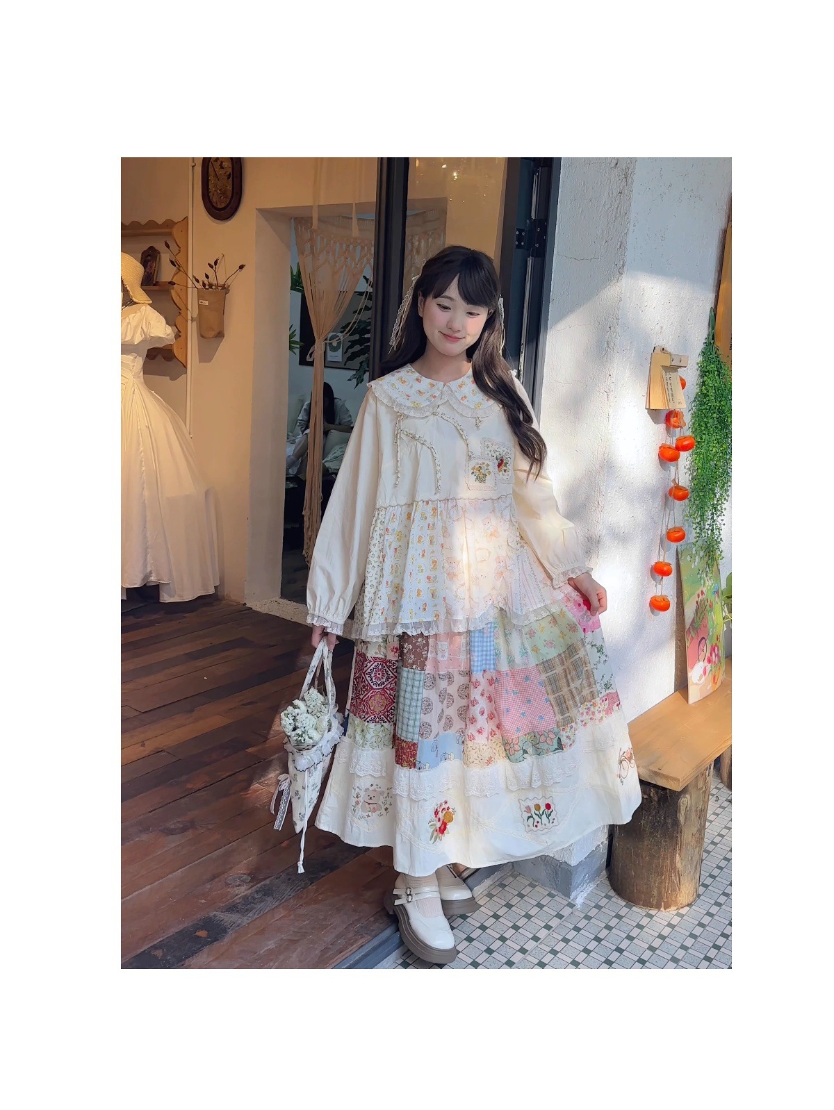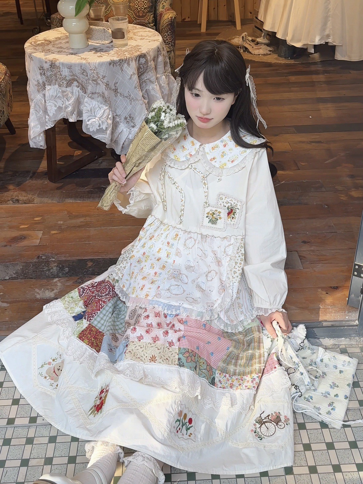 예술적 레트로 느슨한 인형 칼라 소녀의 꽃 패치 워크 레이스 긴 소매 셔츠 달콤한 인형 셔츠 탑