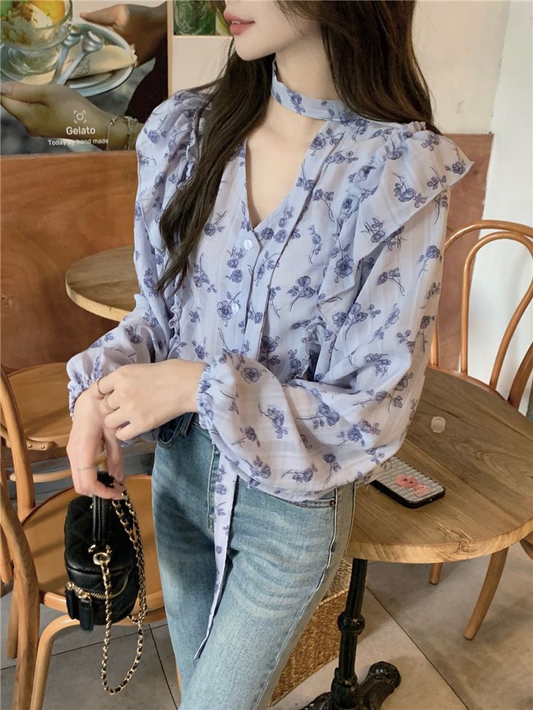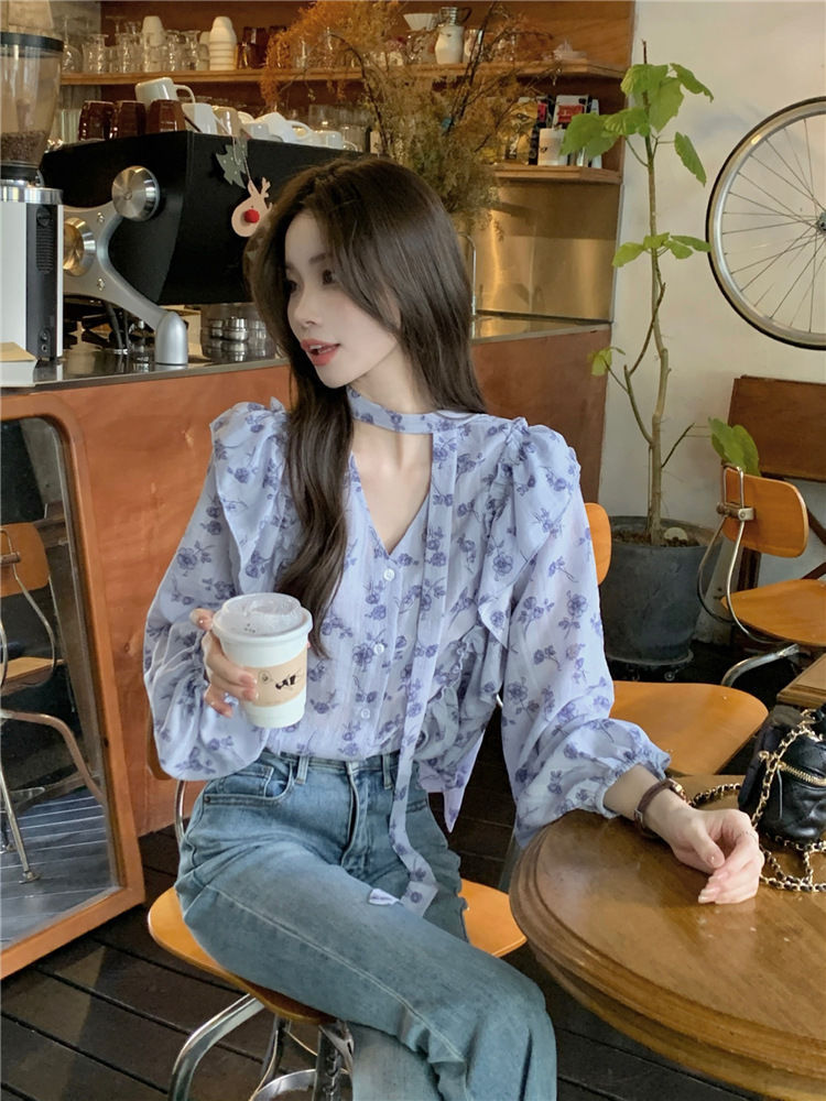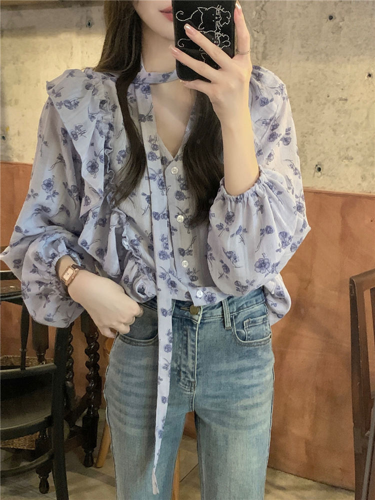 여성용 가볍고 성숙한 프렌치 셔츠, 싱글 브레스트 러플 프린트 레이스업, 다용도 네크라인, 여성용 꽃무늬 우아함