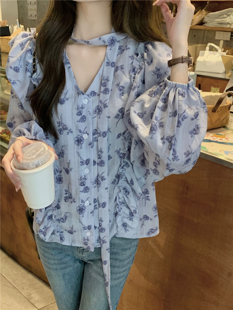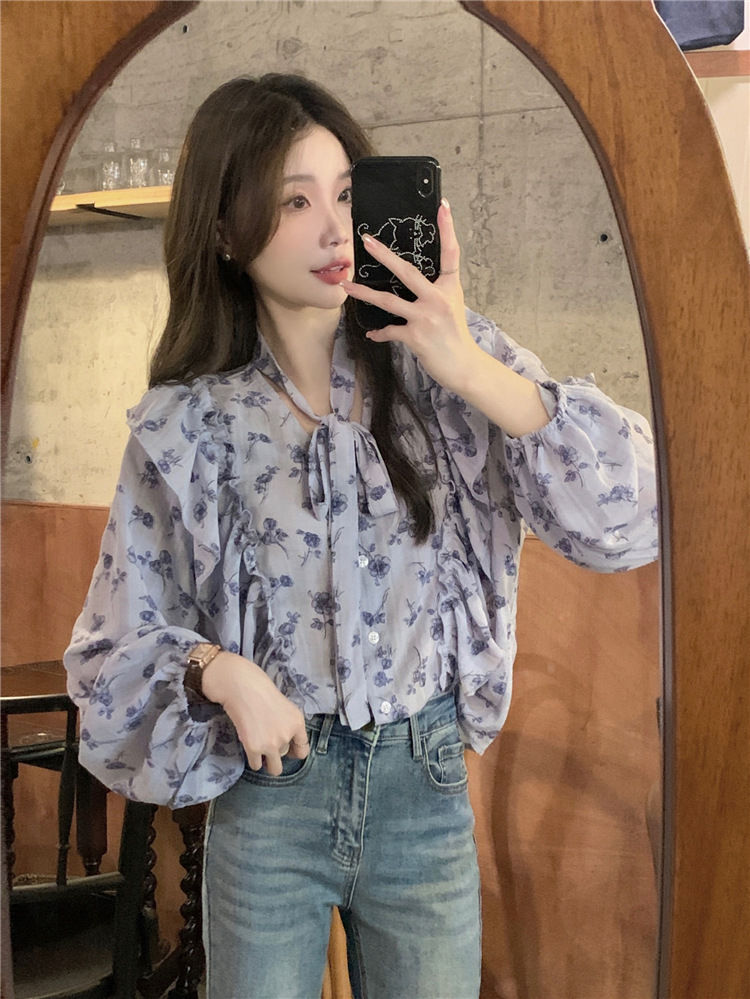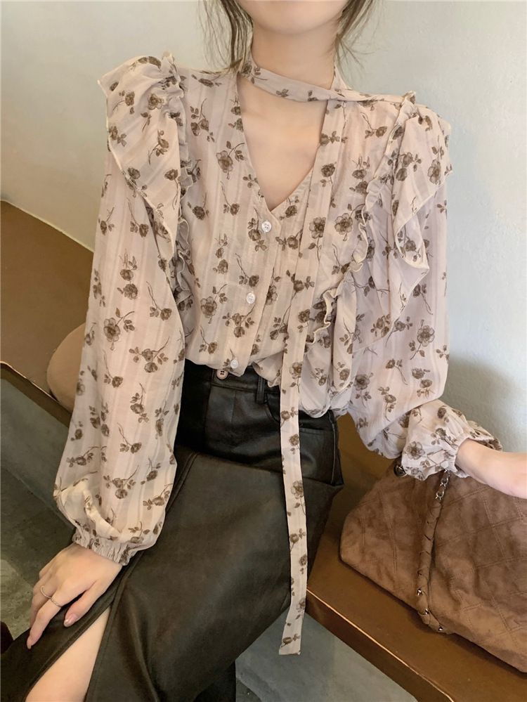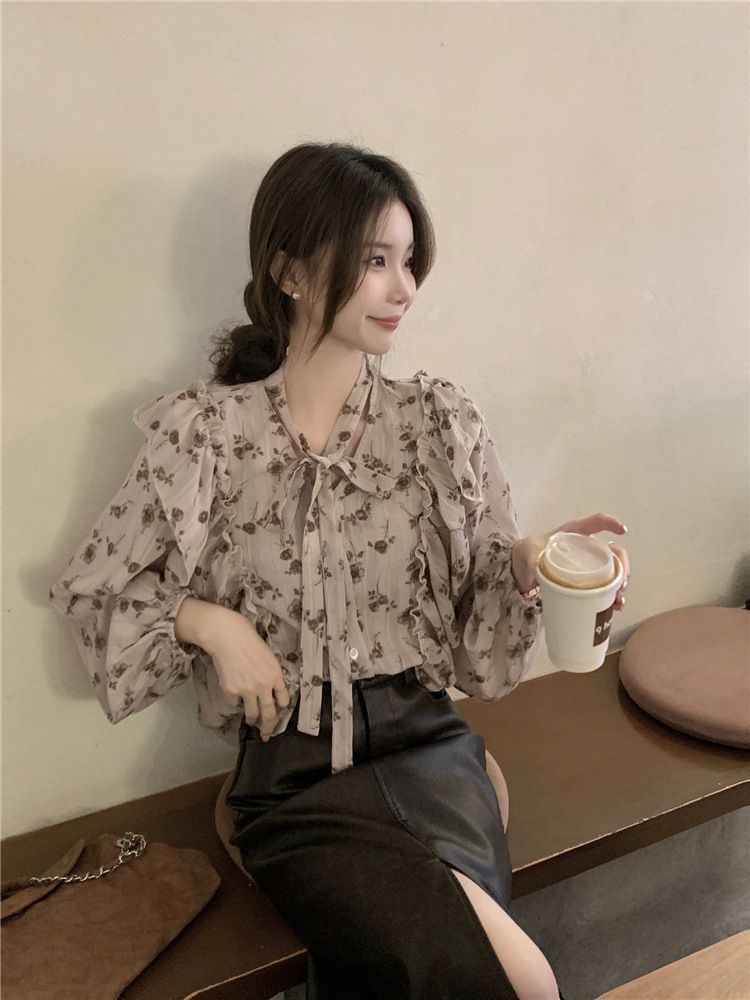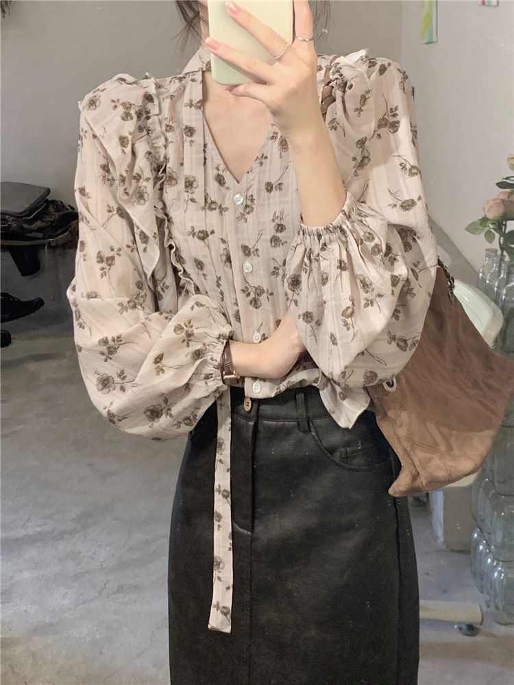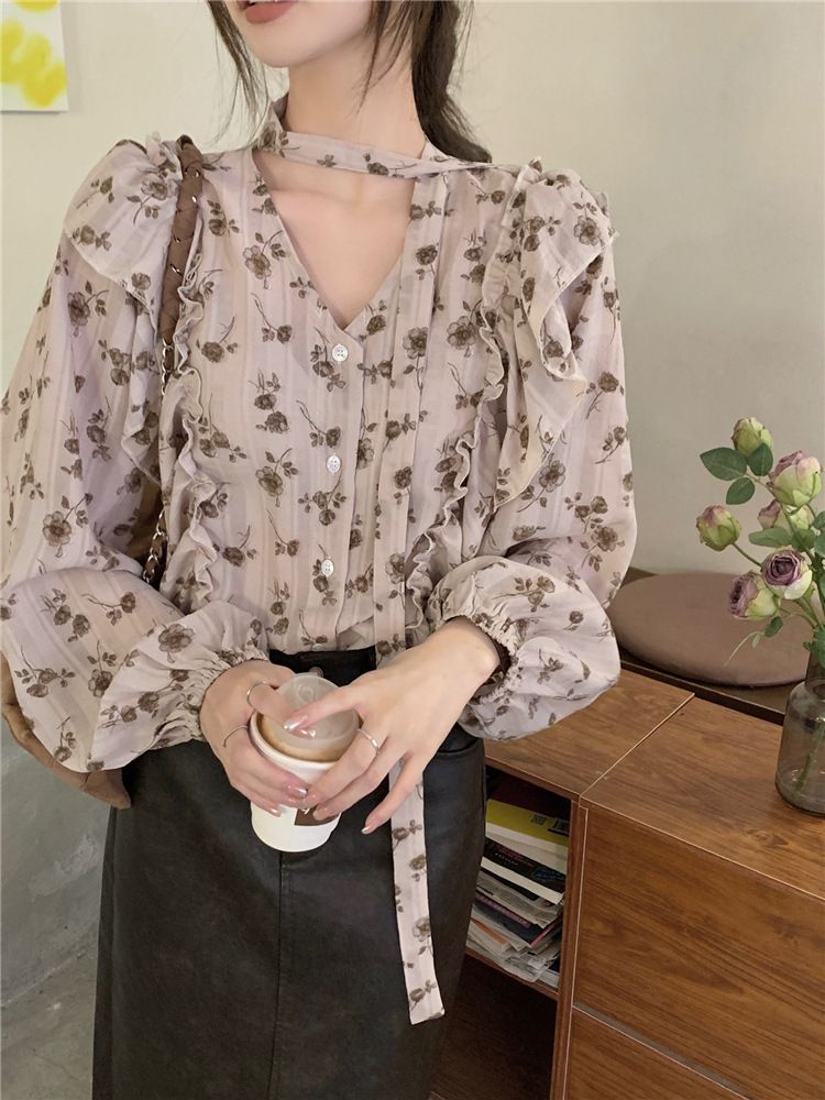 여성용 가볍고 성숙한 프렌치 셔츠, 싱글 브레스트 러플 프린트 레이스업, 다용도 네크라인, 여성용 꽃무늬 우아함스토어 가기