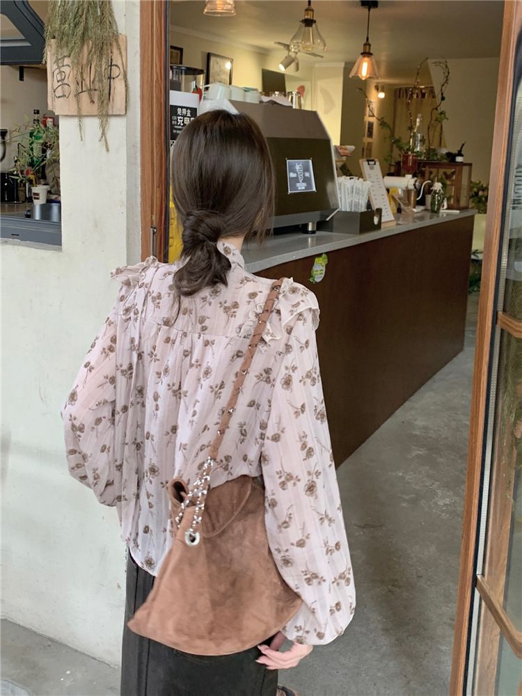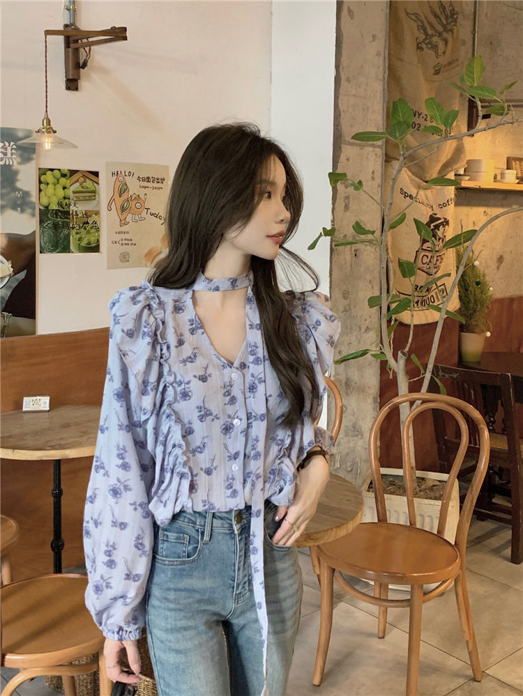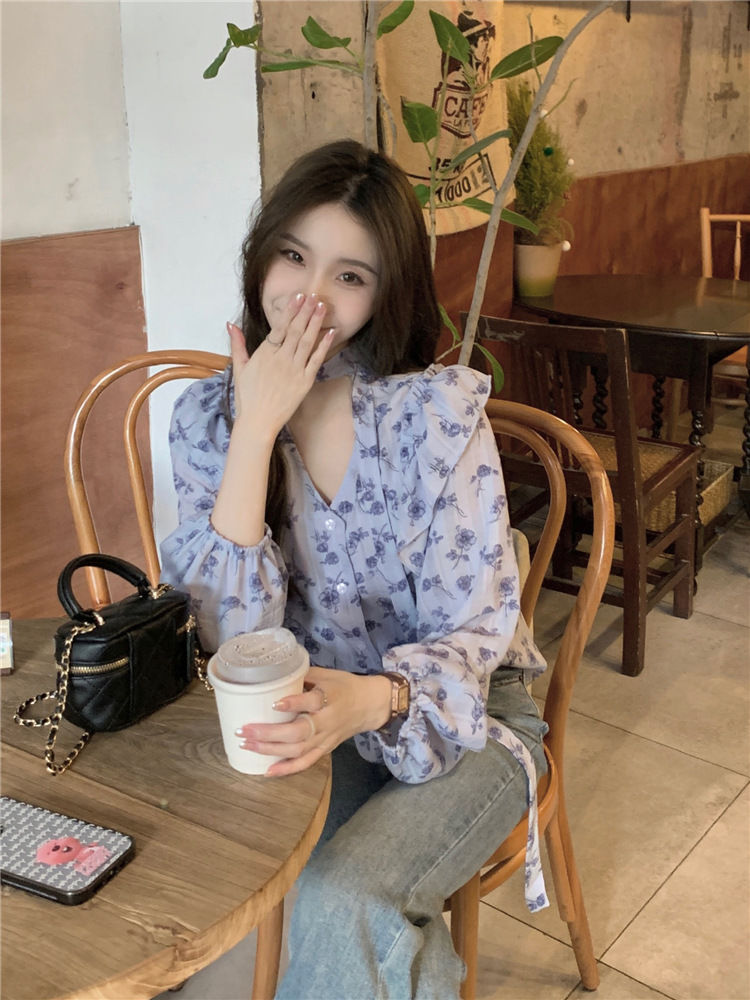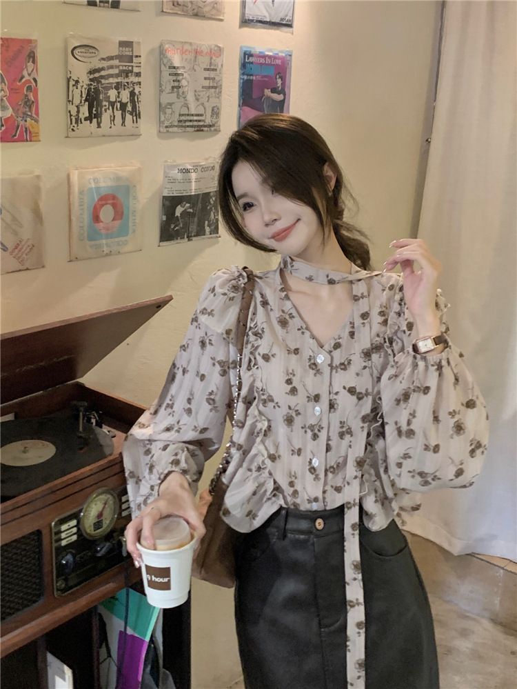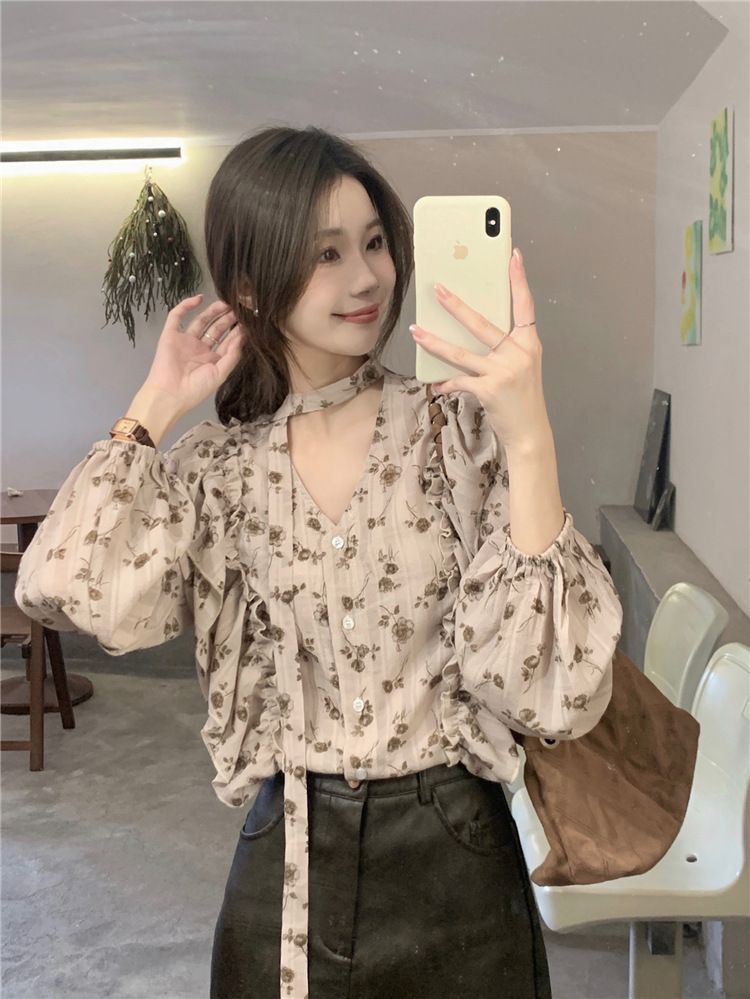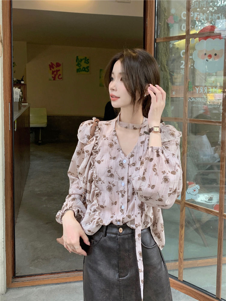 여성용 가볍고 성숙한 프렌치 셔츠, 싱글 브레스트 러플 프린트 레이스업, 다용도 네크라인, 여성용 꽃무늬 우아함스토어 가기