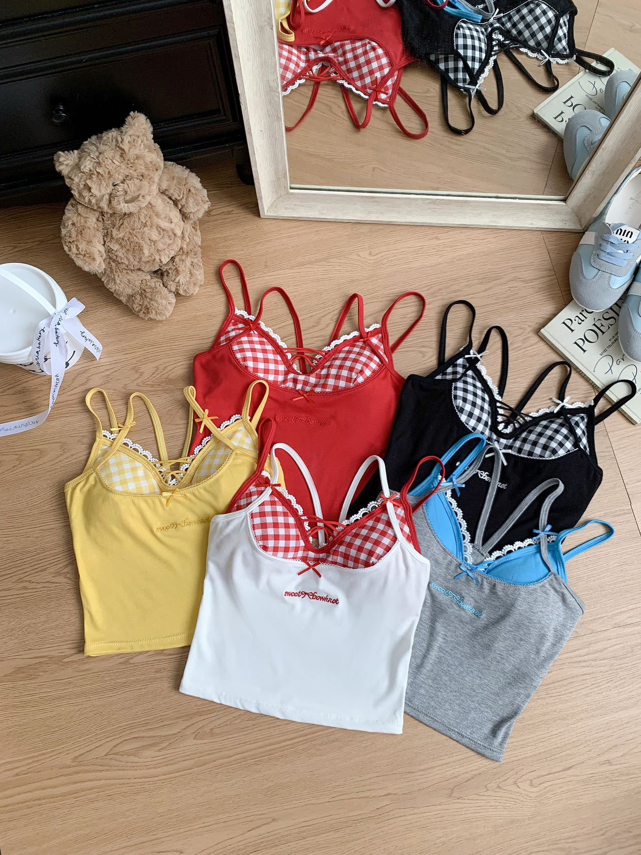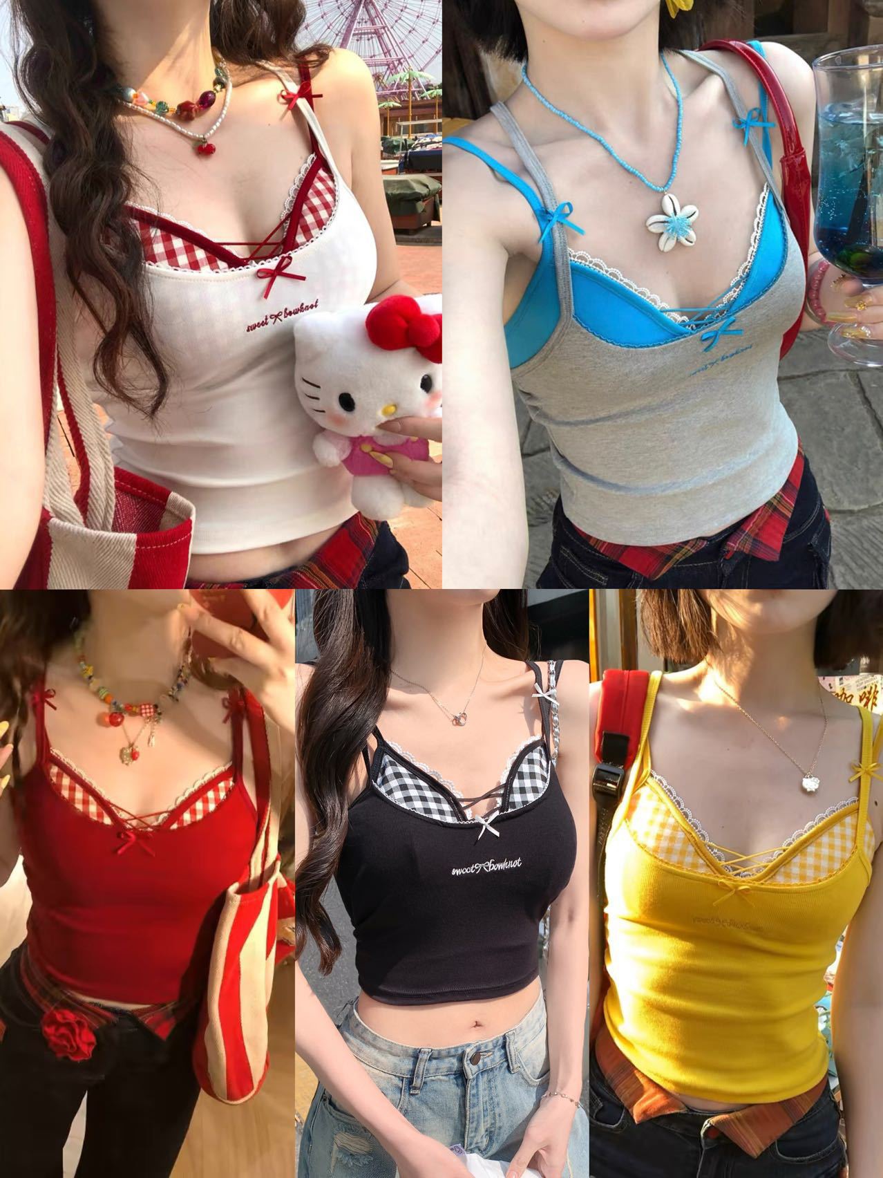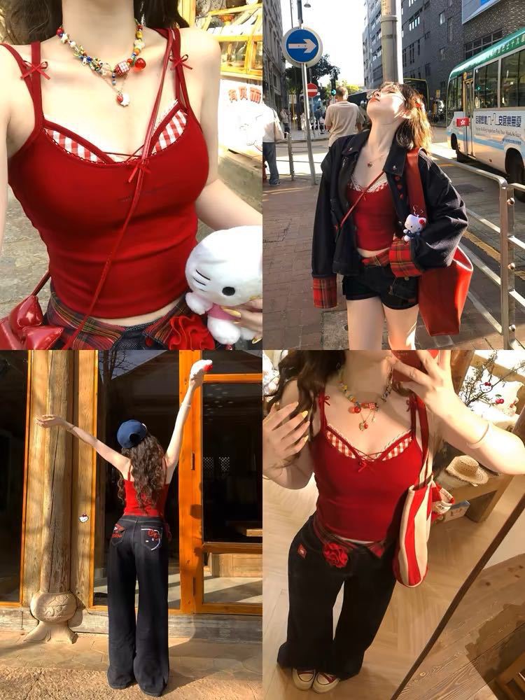 퓨어 러스트 스타일 페이크 투피스 컬러풀 크로스 브라 캐미솔 핫걸 여름 섹시 올 매치 아우터 레이어드 탑