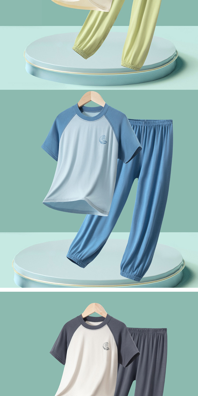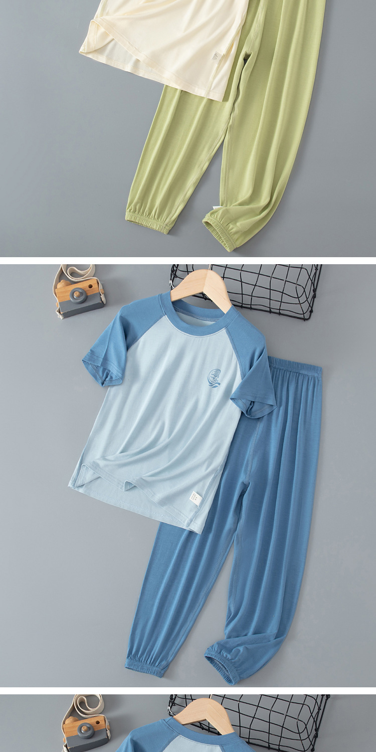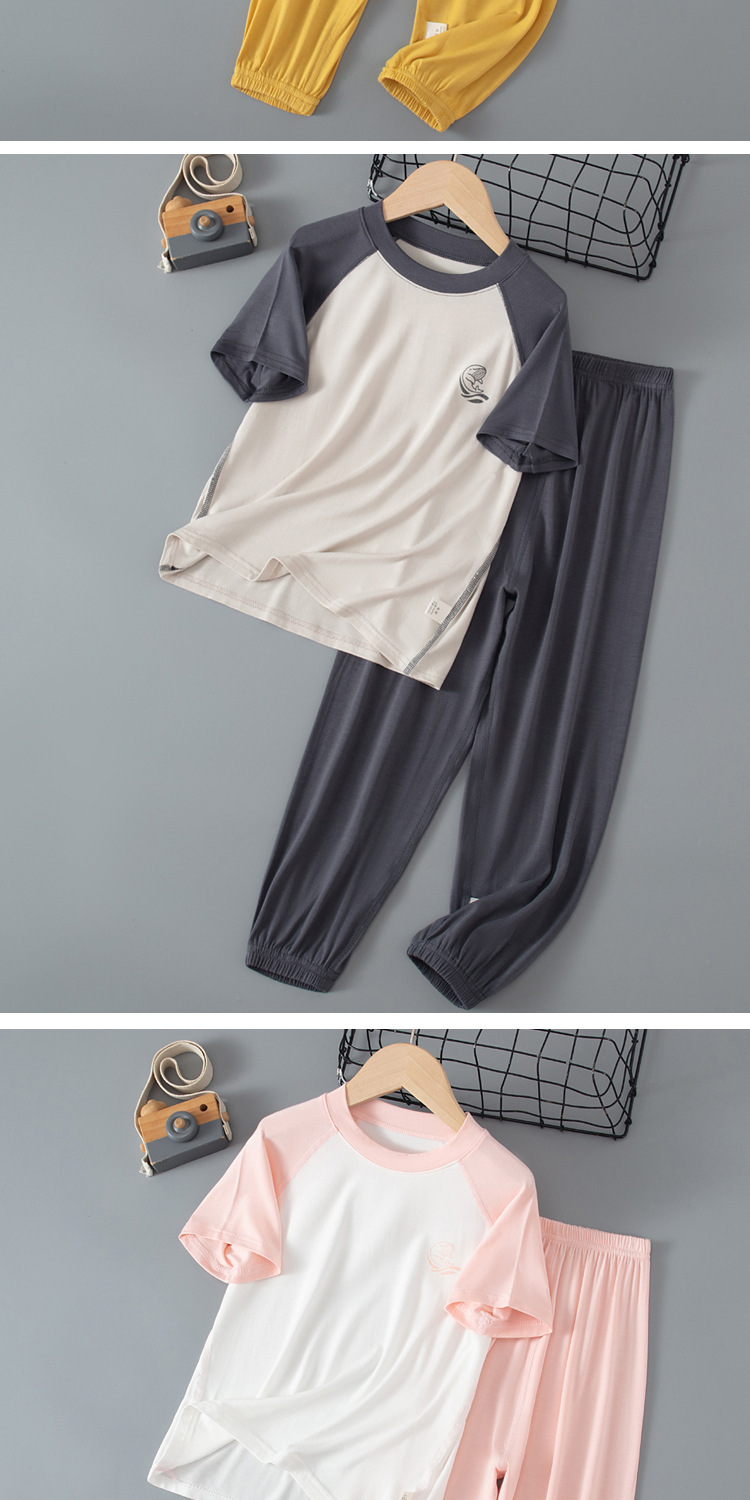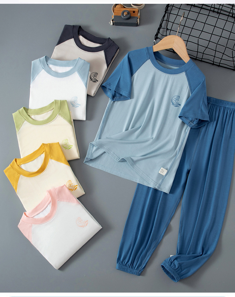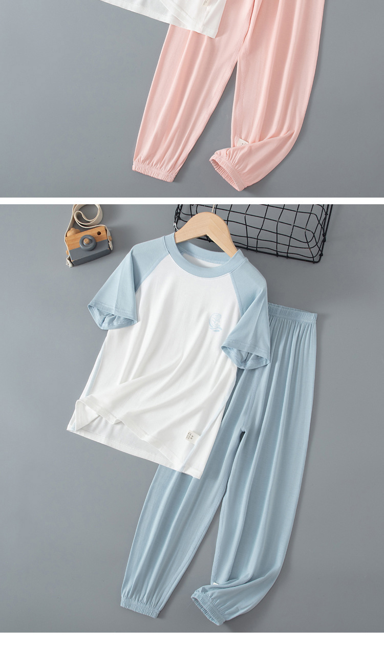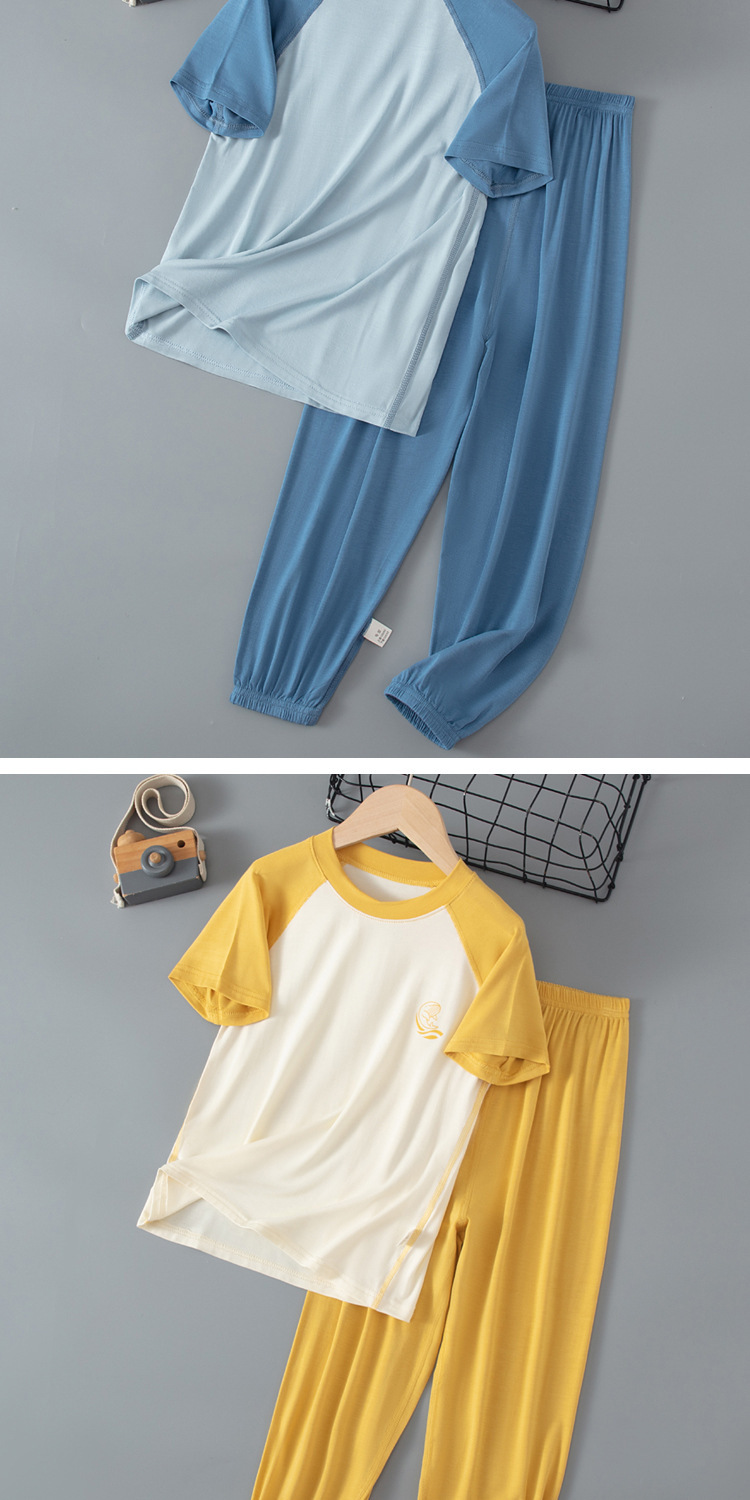 夏季儿童糖果色拼接袖睡衣两件套中大男童女童短袖长裤空调家居服